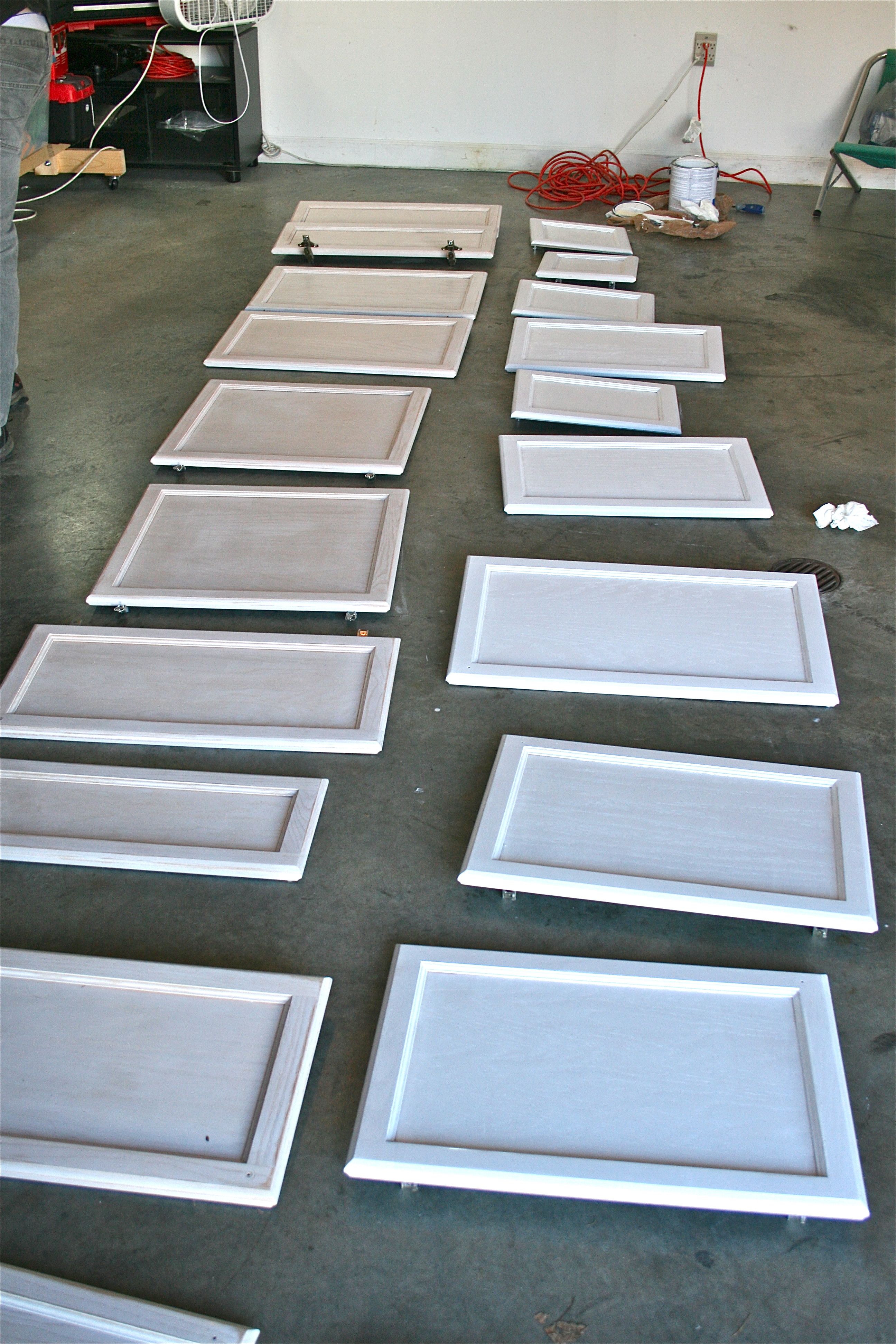 We dedicated this day (i.e. last Sunday) solely to the priming phase of the project. Since John had so nicely taken care of the sanding the day before, the primer was the last step to readying our wooden cabinets for the dark brown topcoats.