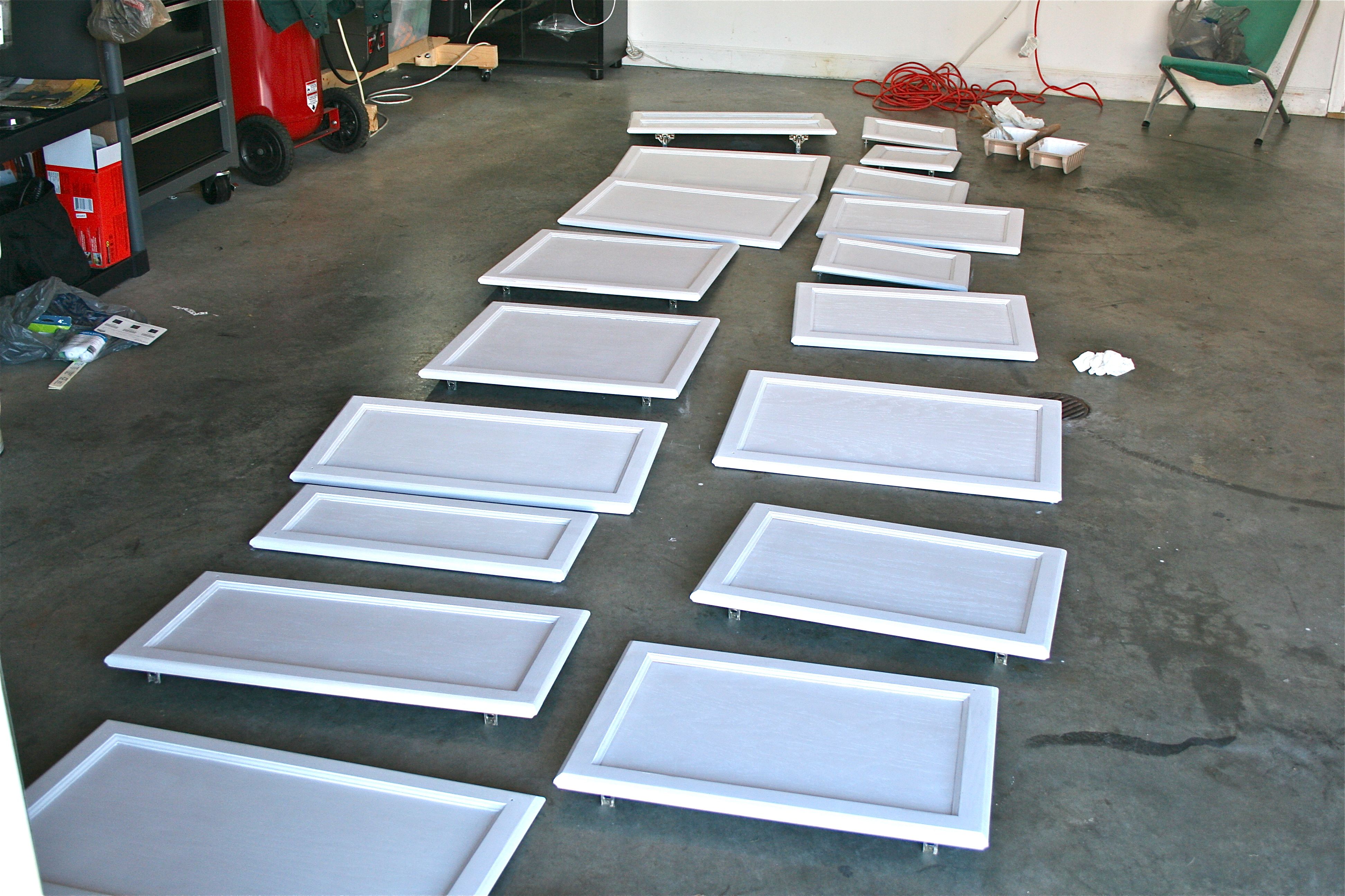 At this point, we both called it a day and took some much-needed relax time. Since then, John and I have spent no more than an hour (our agreed-upon schedule so that we didn’t run ourselves into the ground) putting a coat of primer on the other side of the doors and finishing the two final topcoats on both sides of the doors. It’s been an adventure, I’ll tell you that much. We manage to have fun with it though by listening to cheesy country music on John’s stereo in the garage while we work (um, hello. Has anyone heard that God-awful “Red Solo Cup” song? John unfortunately loves it).