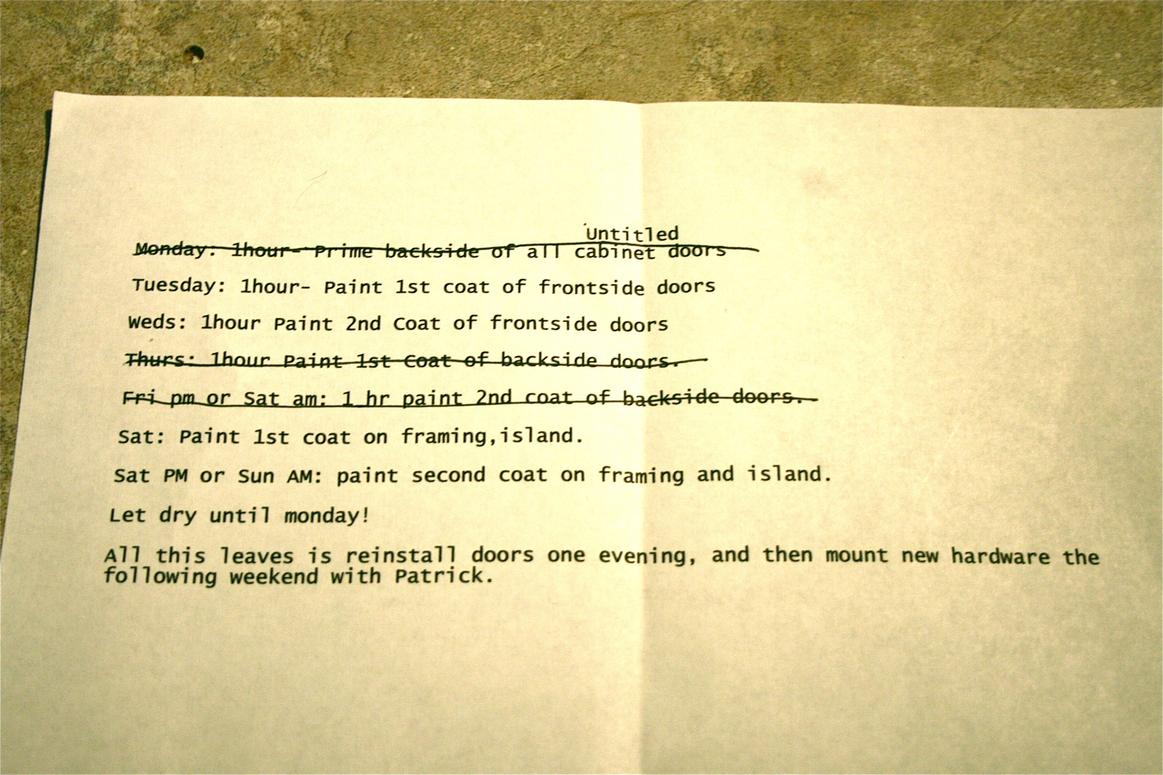 Oh and here’s the schedule John so nicely put together to keep us on track – As you can see, we’ve already gone a little out of order and we’ve also knocked off a few extra lines since I took this photo, but we are still on par to finish by Sunday!