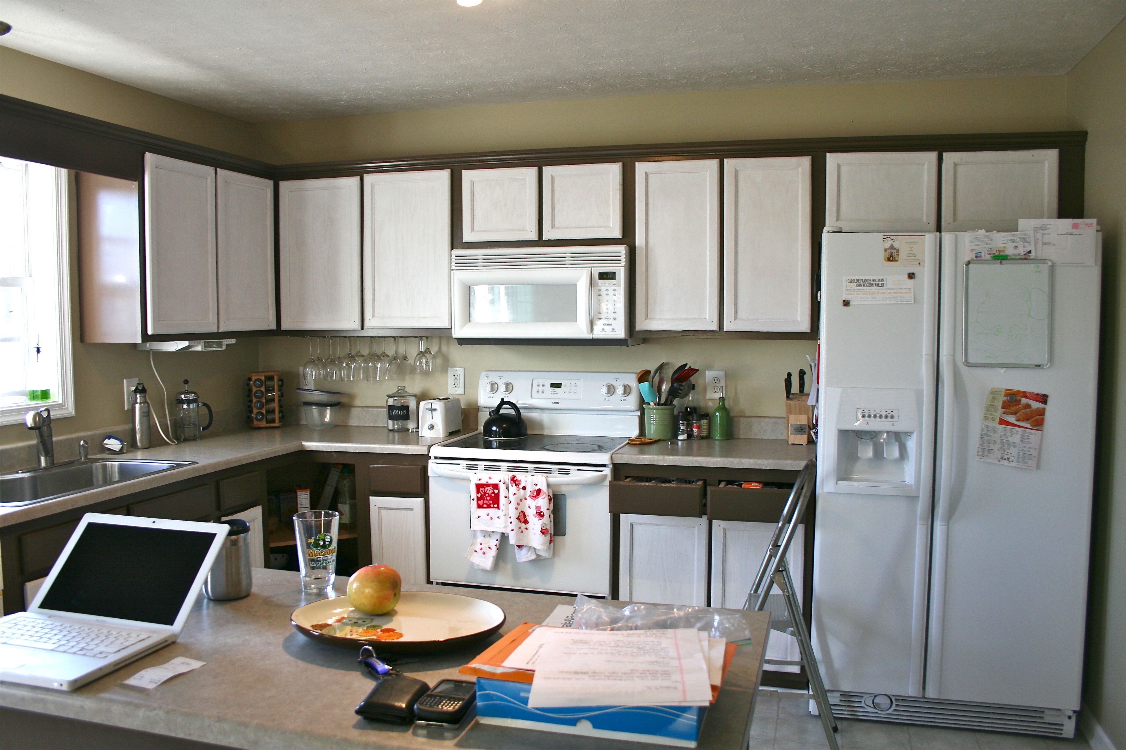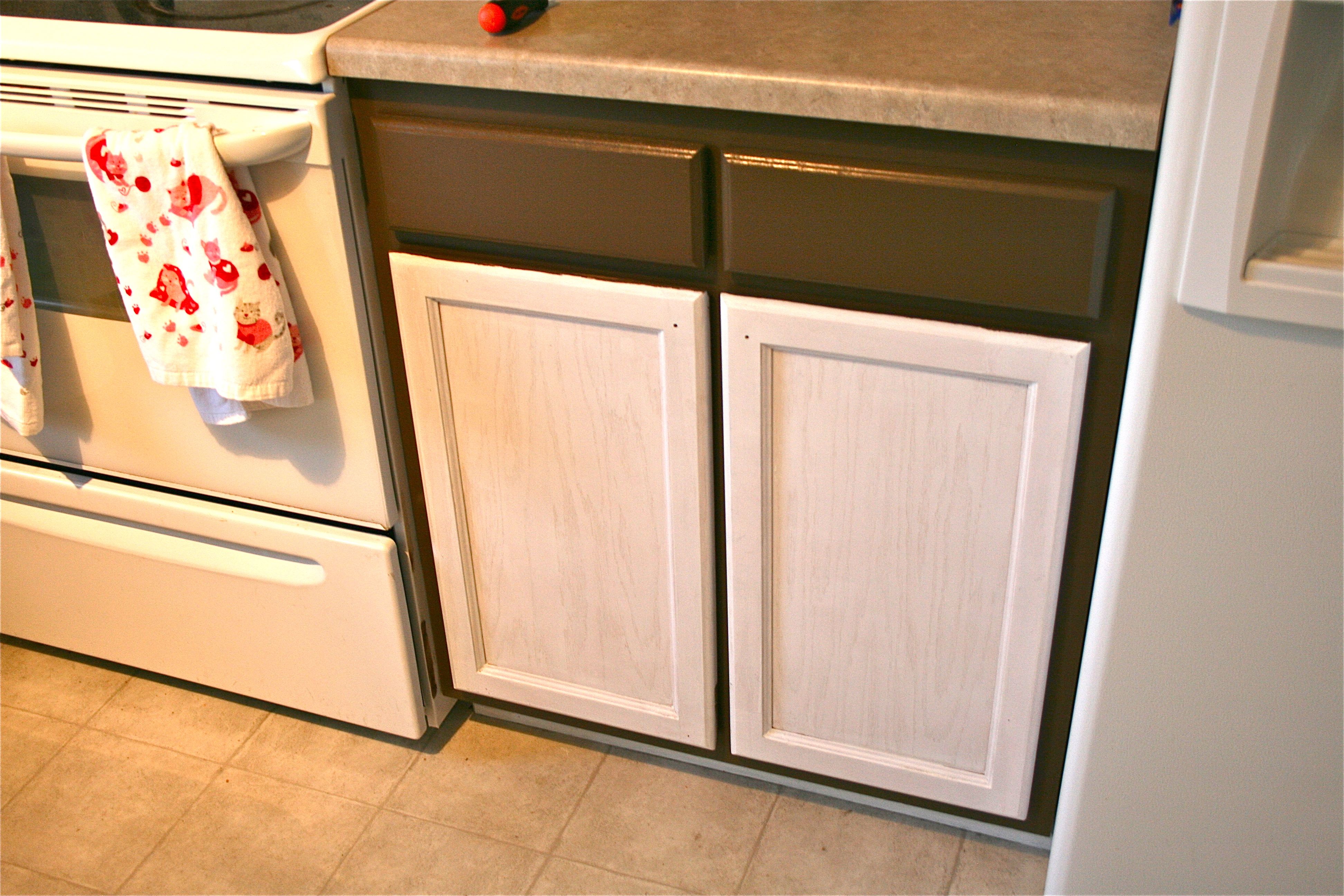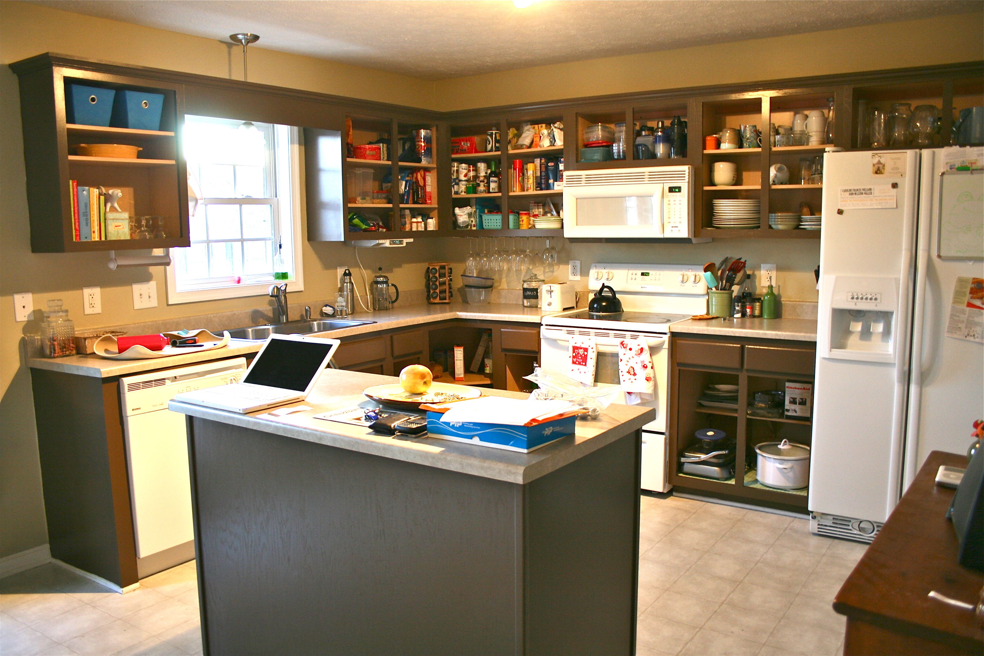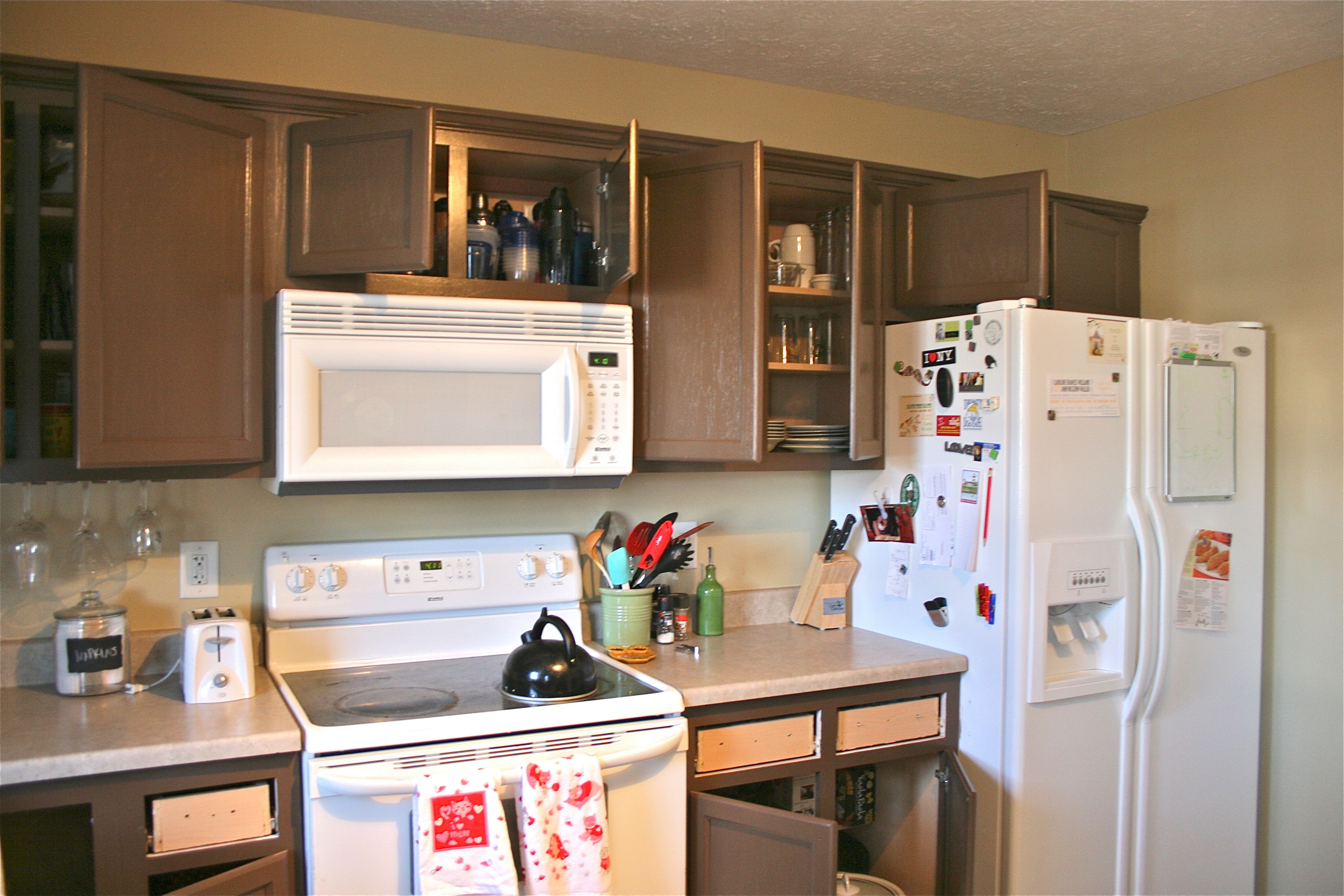 We are in the homestretch now, folks!! Last week I explained the sanding and priming processes – Today I am divulging anything and everything involved with painting the last two topcoats on our kitchen doors and the cabinet framework. When last I left you, I gave this tiny sneak peak of our final cabinet color – A deep, chocolatey brown from Valspar called “Mudslide”. At that point I had only managed to finish the island, but you’ll see a whole lot more of the color everywhere else today.