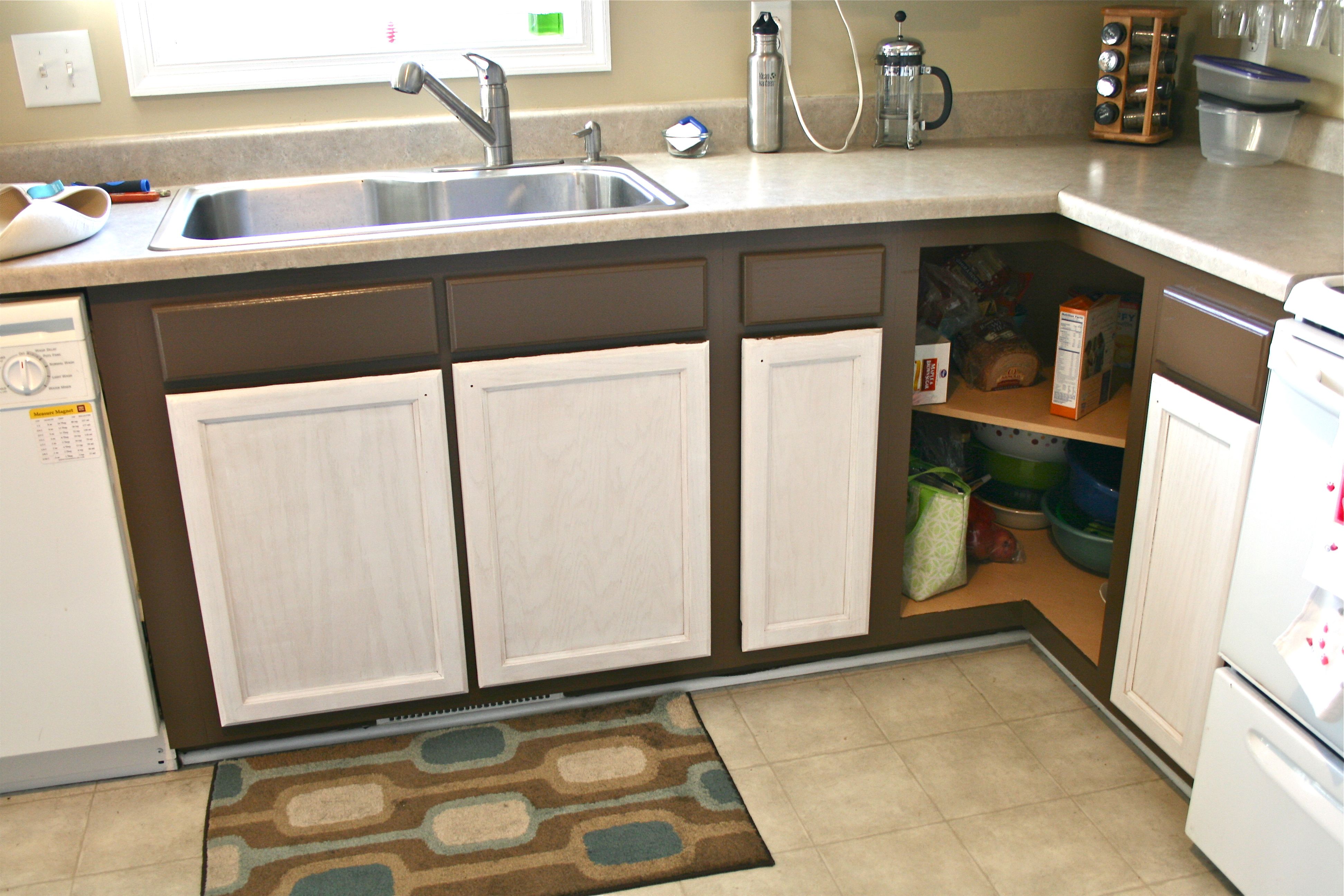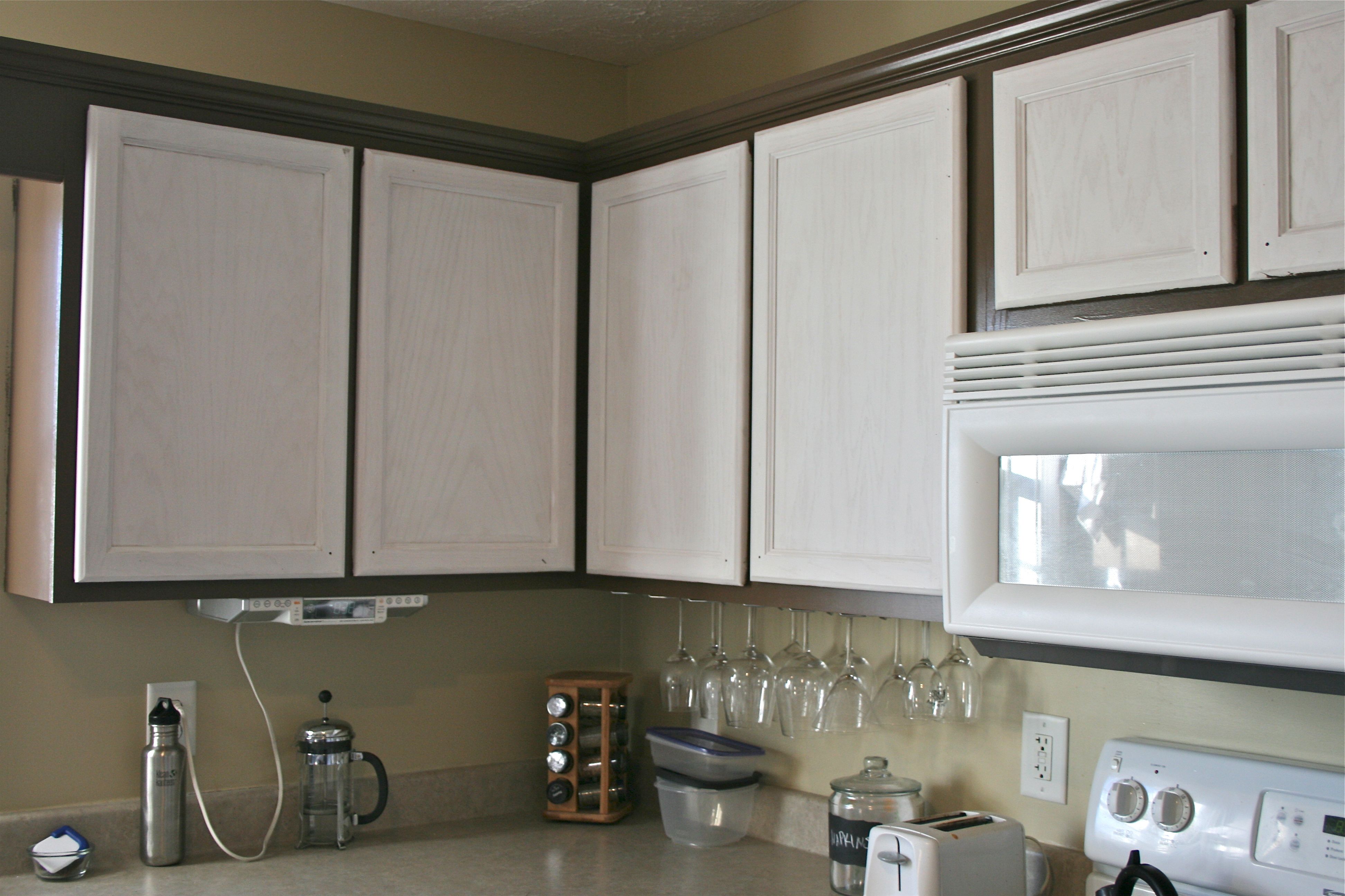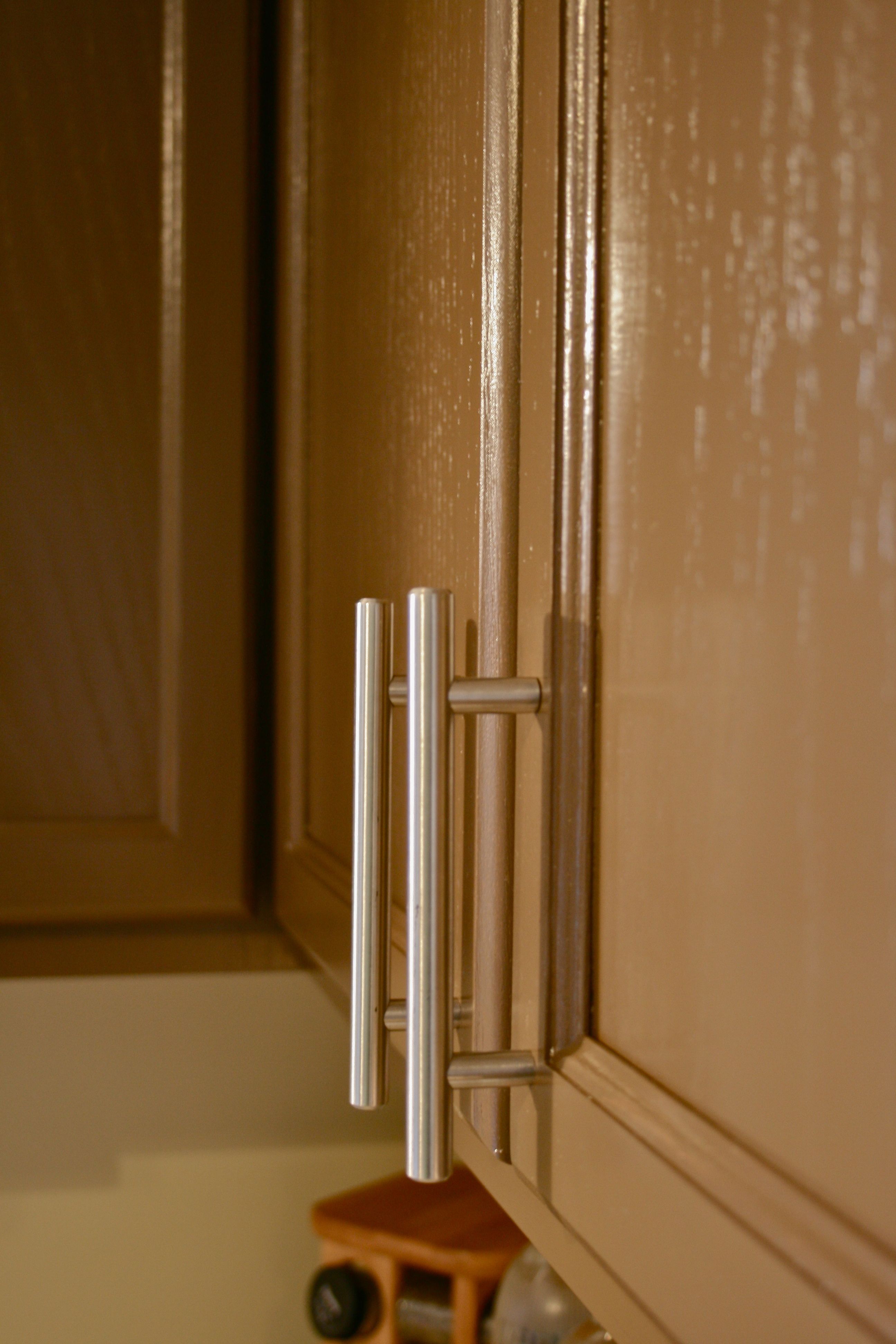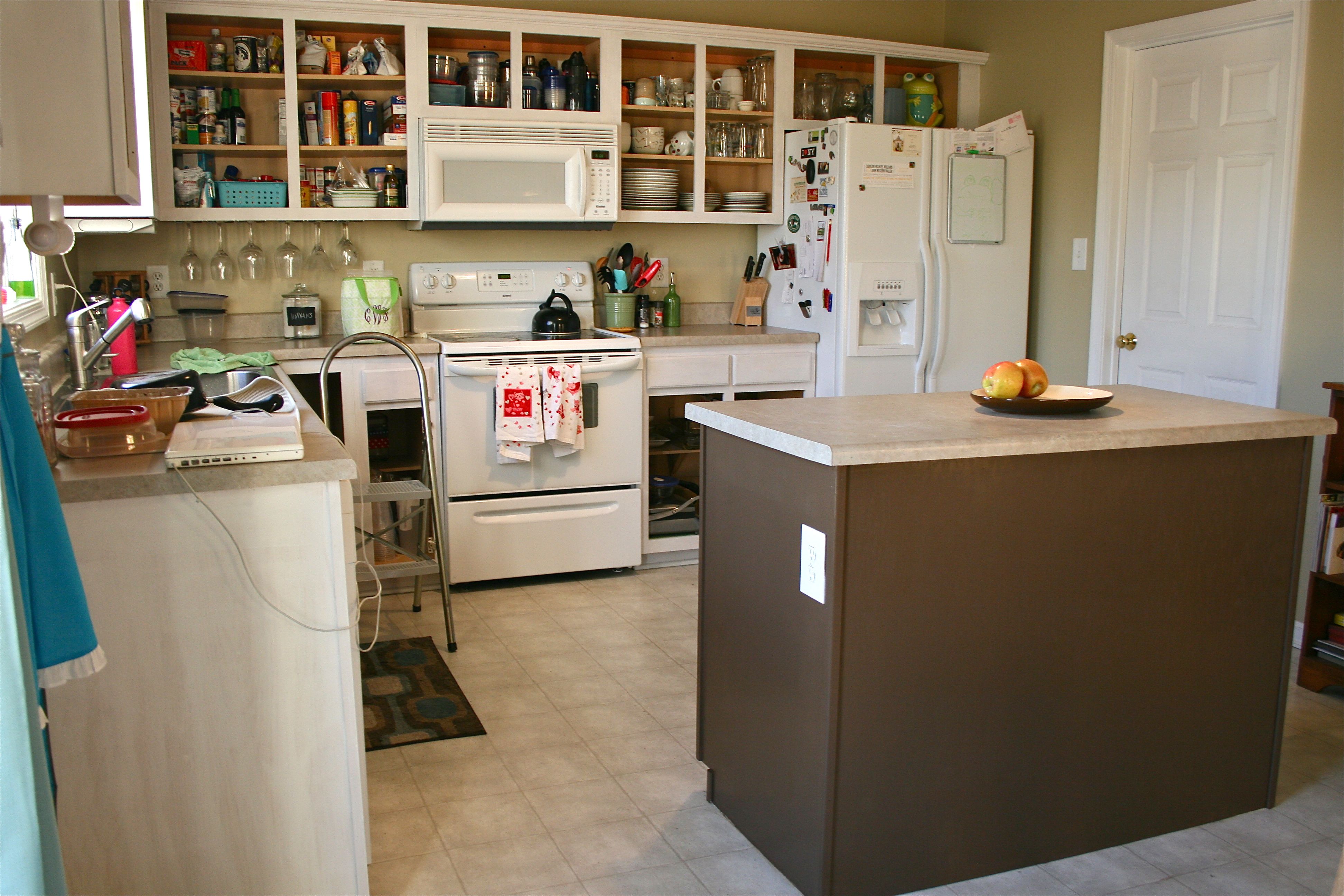 We are in the homestretch now, folks!! Last week I explained the sanding and priming processes – Today I am divulging anything and everything involved with painting the last two topcoats on our kitchen doors and the cabinet framework. When last I left you, I gave this tiny sneak peak of our final cabinet color – A deep, chocolatey brown from Valspar called “Mudslide”. At that point I had only managed to finish the island, but you’ll see a whole lot more of the color everywhere else today.