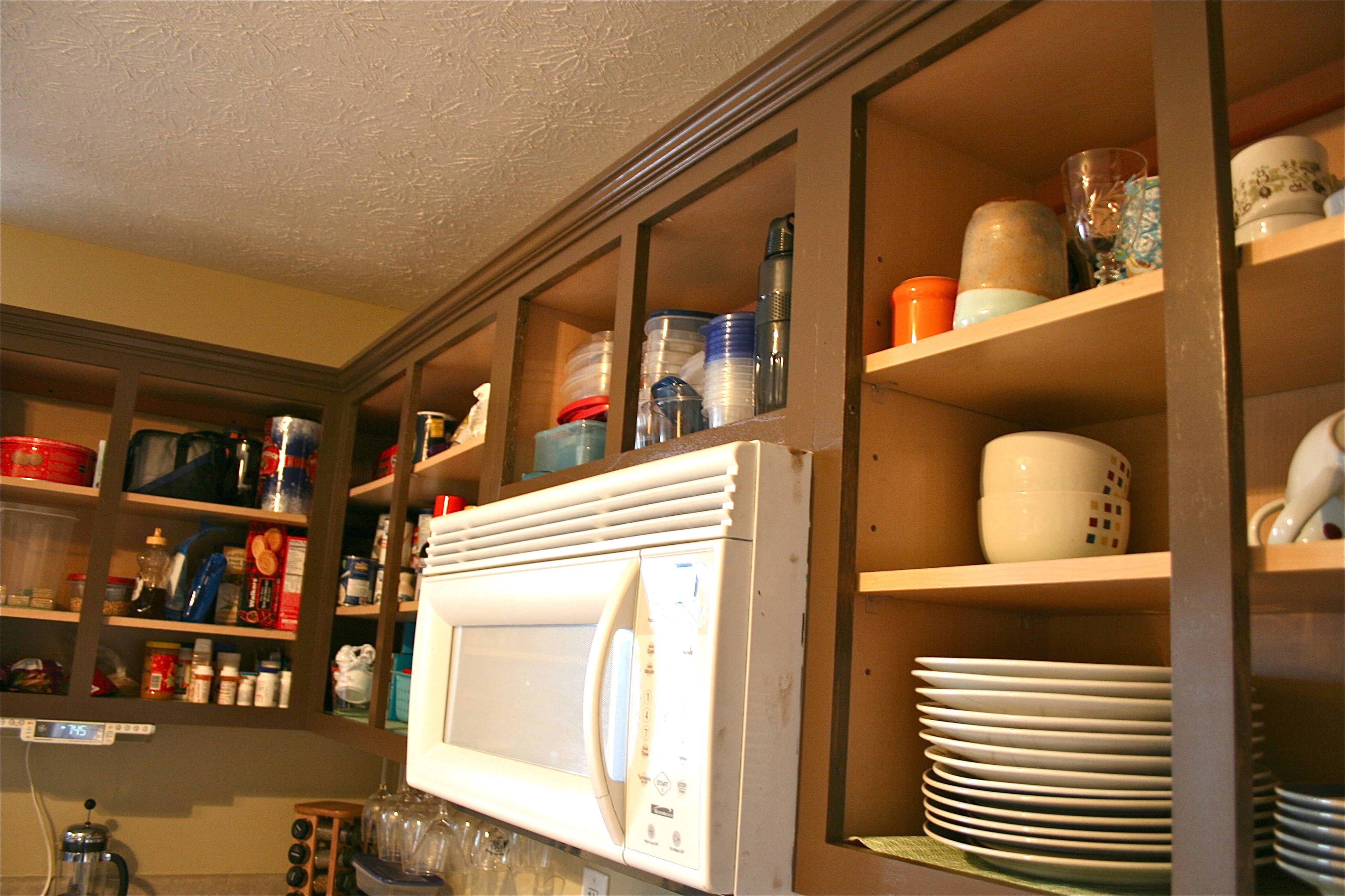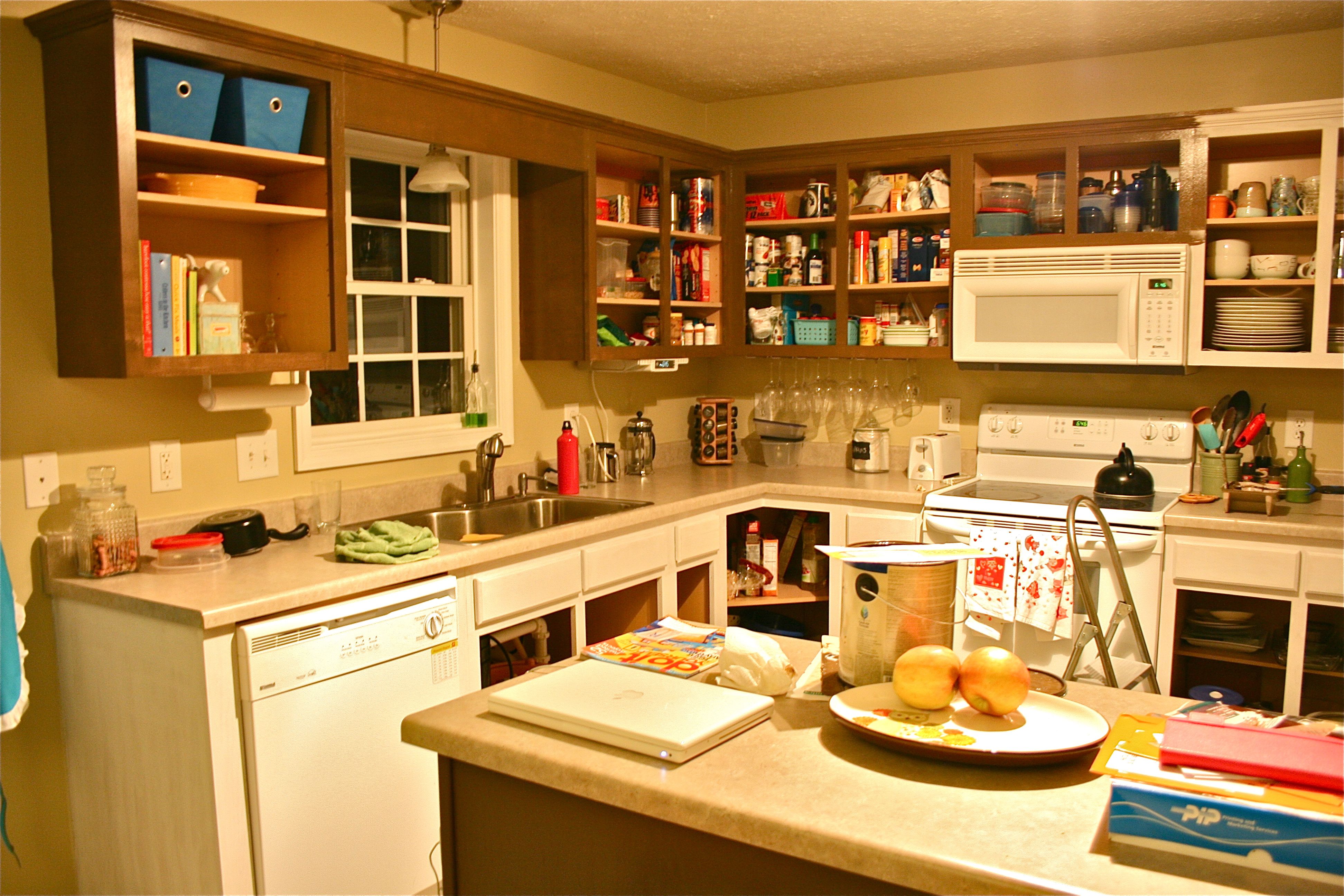 The last step in the painting process was the topcoat on the front of the cabinet doors. It had been two days since we brought the doors up from the drafty garage and they were sufficiently warmed up for paint. I thought it might be a bit easier to work on painting the doors screwed back into the frame, so John helped me put everything back in place. It gave the kitchen a sort of two-tone look.
