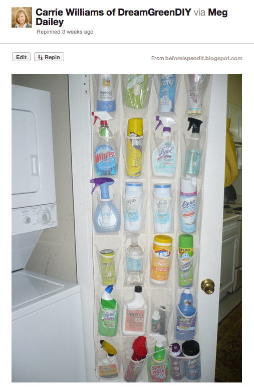 What could possibly be more simple than a shoe rack used to hold cleaning supplies? This project cost me under $10 and took about five minutes to complete. It’s fast, it’s easy, it’s definitely handy and it makes for a much more organized collection of cleaners and rags.