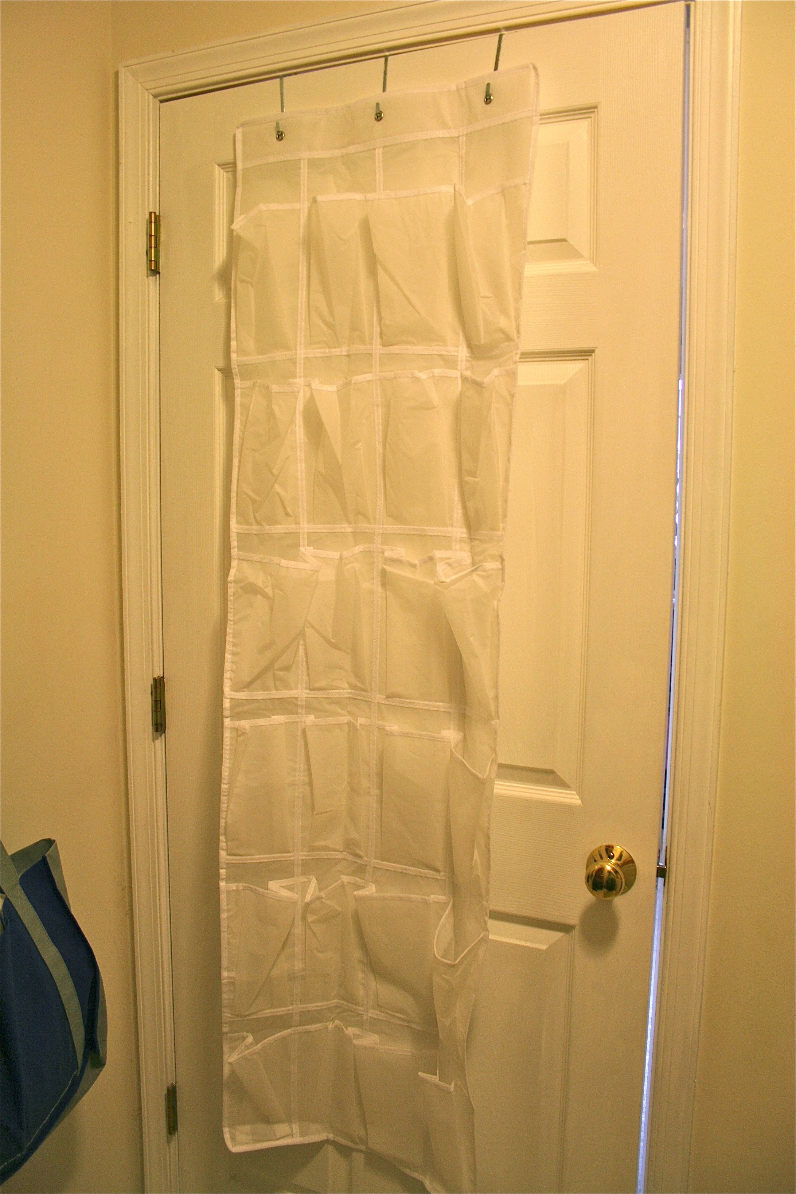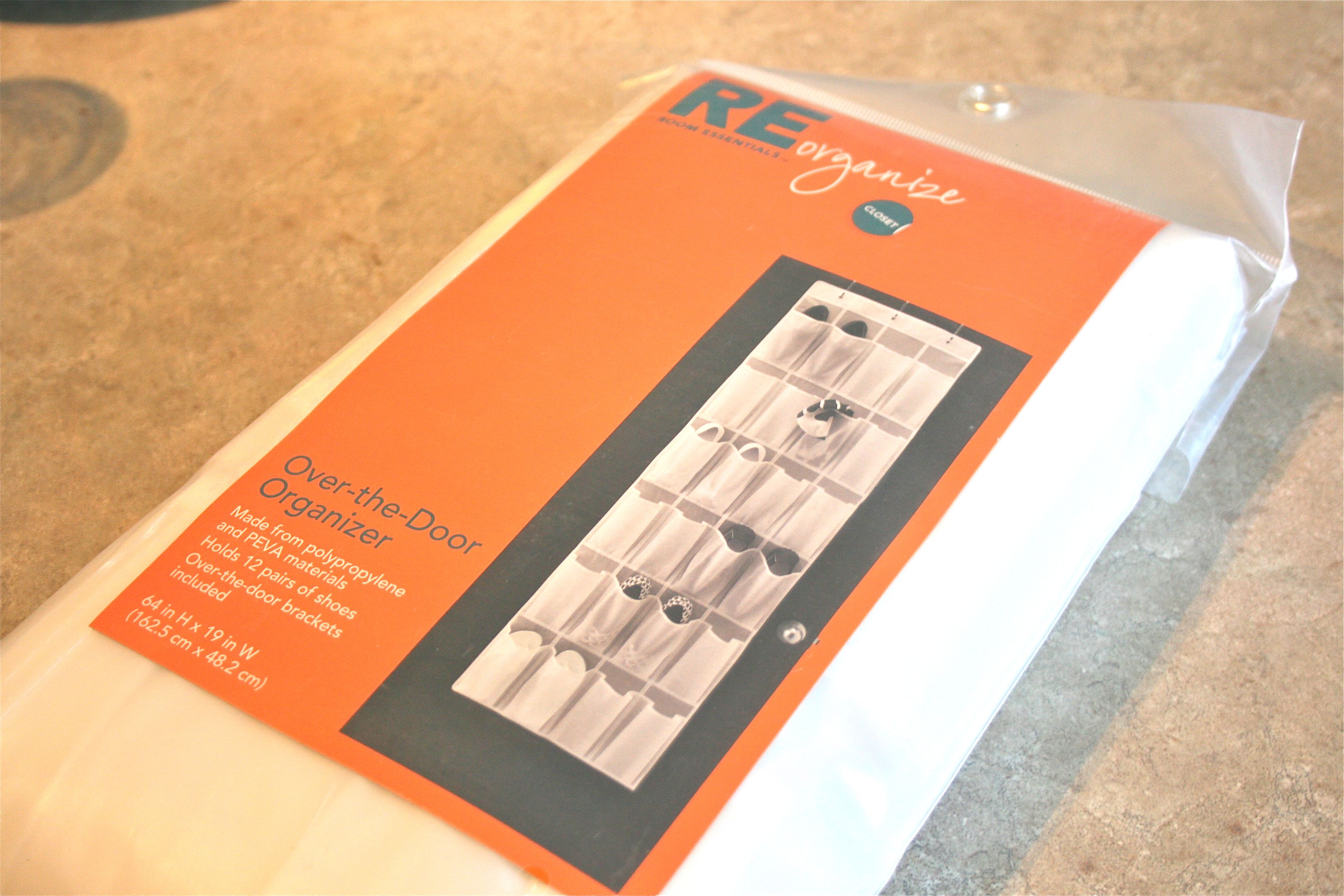 Off to Target we went, where I picked up this plastic shoe rack with over-the-door hardware for $8.99.