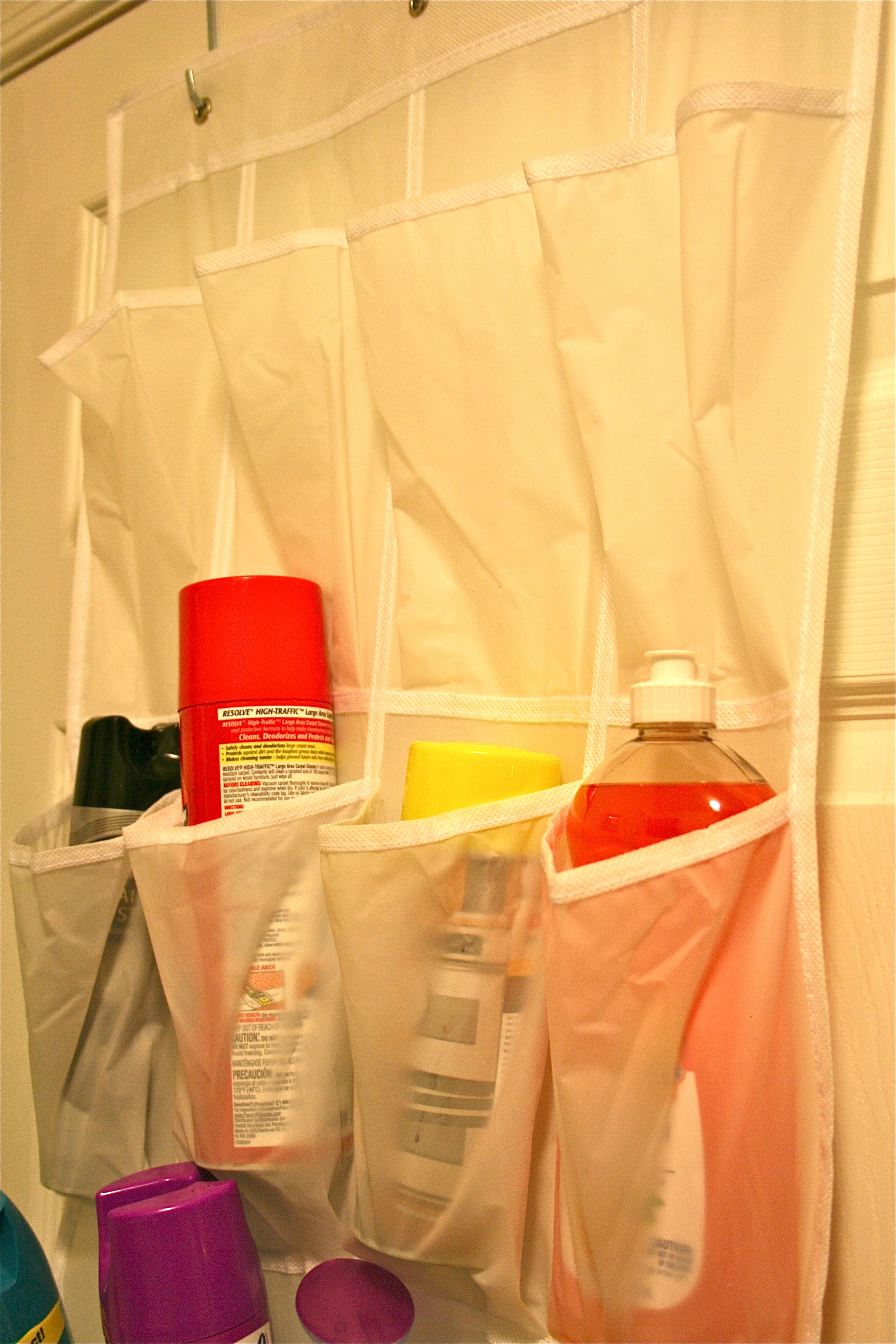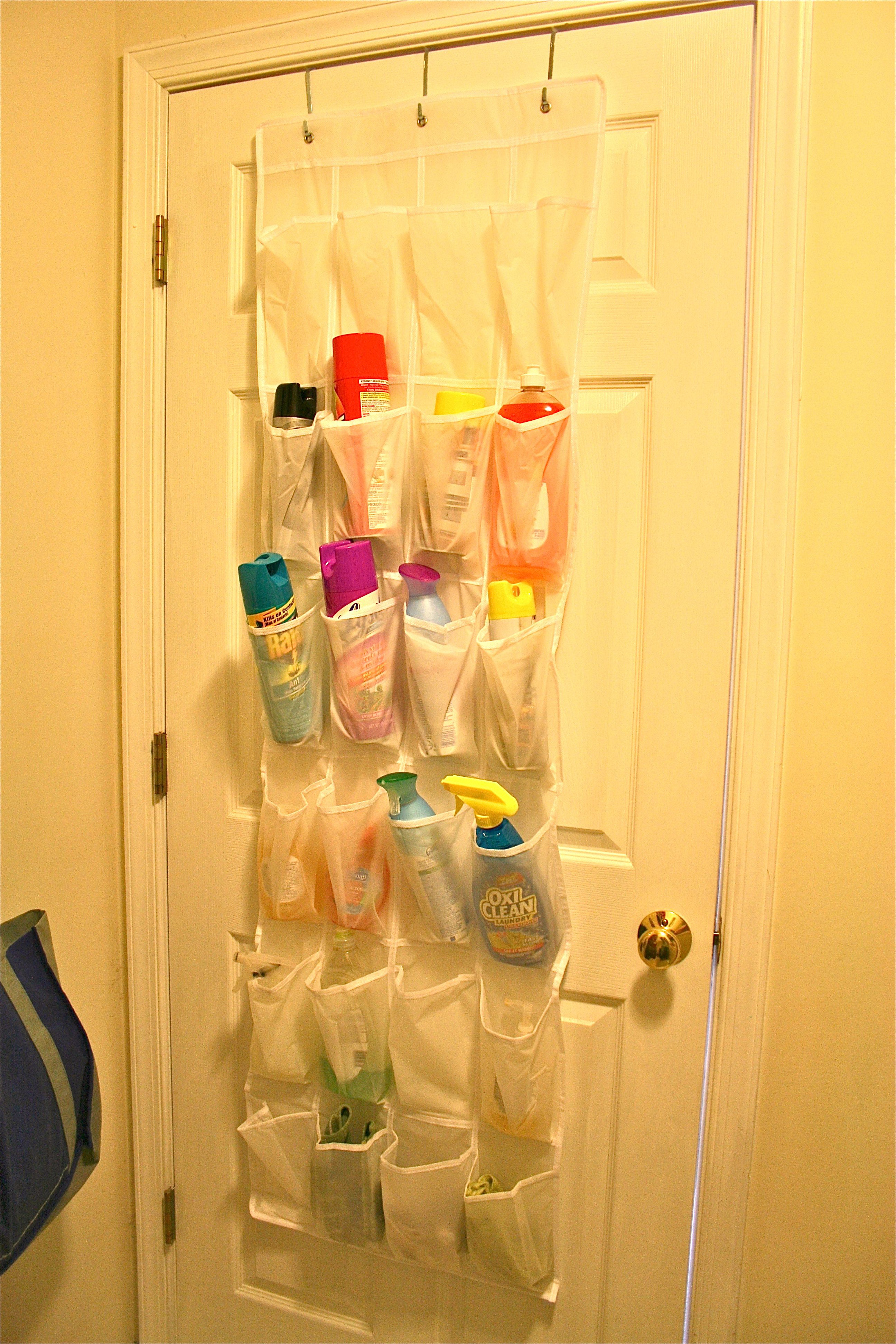 There was a nicer, more stylish version made from a tan colored canvas, but it cost about twice as much and I just didn’t think it was worth it. The white plastic of the one I picked up blends in with the back of the white door, which is a good thing – I don’t really want to draw attention to my cleaning products. Speaking of doors, where did we put it? The back of the laundry room door, of course. The laundry room is a mere five steps from the sink area in the kitchen and already houses other major household supplies, like everyday hardware and tools, trash can, camping/gardening supplies, etc. It seemed fitting.