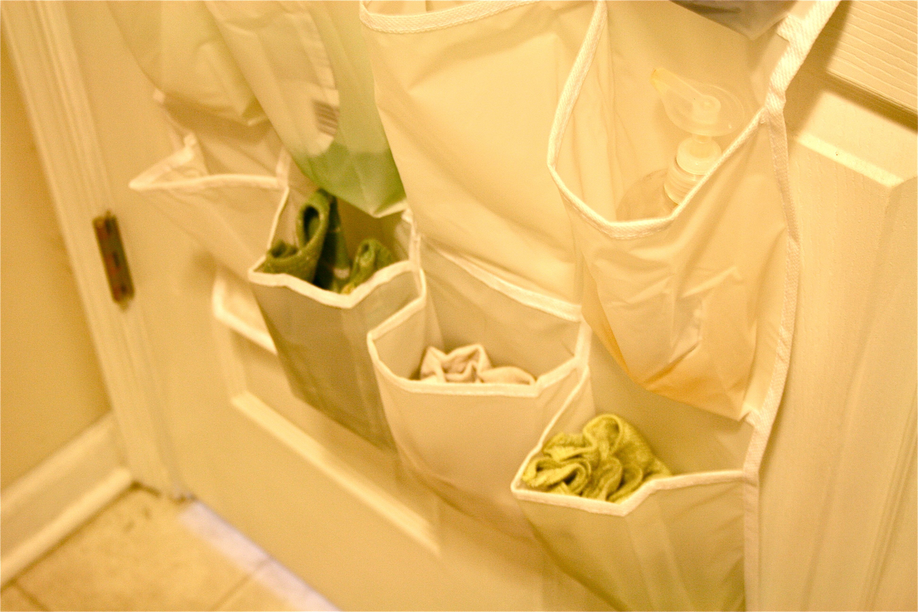 I thought about organizing everything by type (i.e. all the air fresheners together, all the extra soaps together, etc.), but decided to just see how we live with it. We’ll see! Who knows, it could be labeled and sorted in a matter of weeks. For now, I’m just happy to have everything in a convenient, reachable location. I was even able to stow away a few cleaning rags with plenty of extra “pouches” to spare should we stock up on more products in the future.