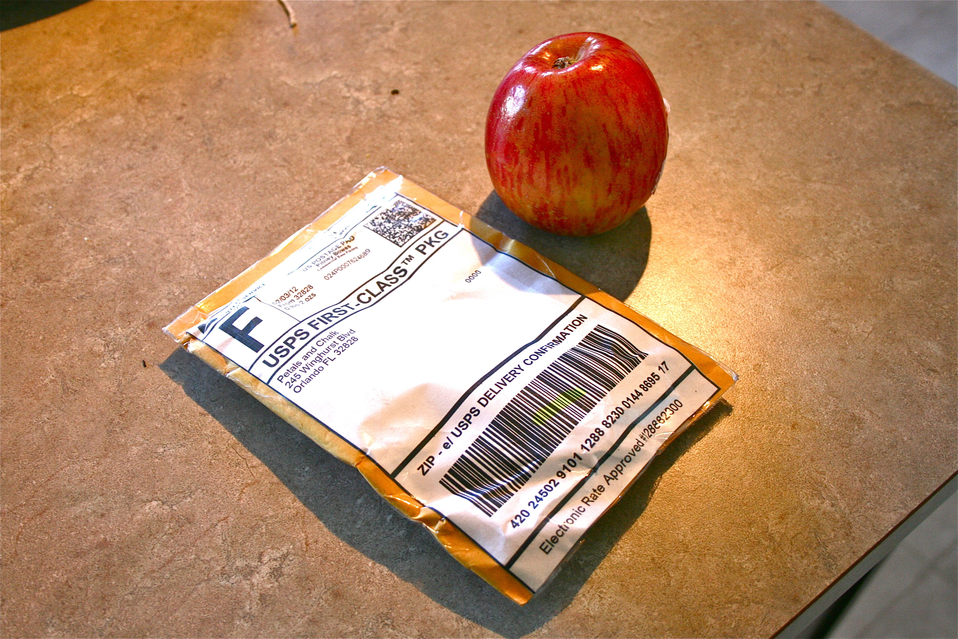 To give you a little perspective, this isn’t a very large package (as seen beside an apple below), but it still packs a lot of excitement in its close quarters.