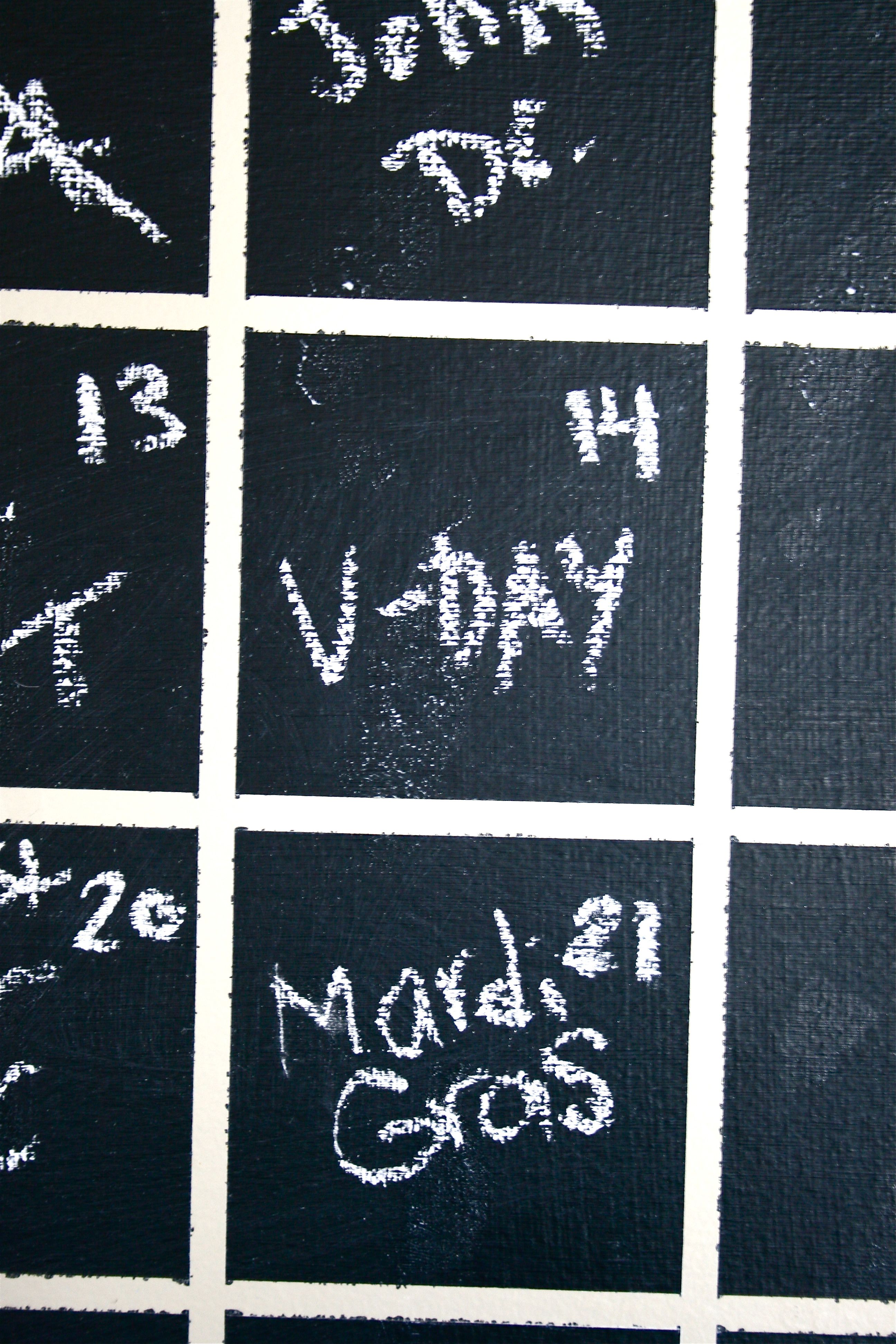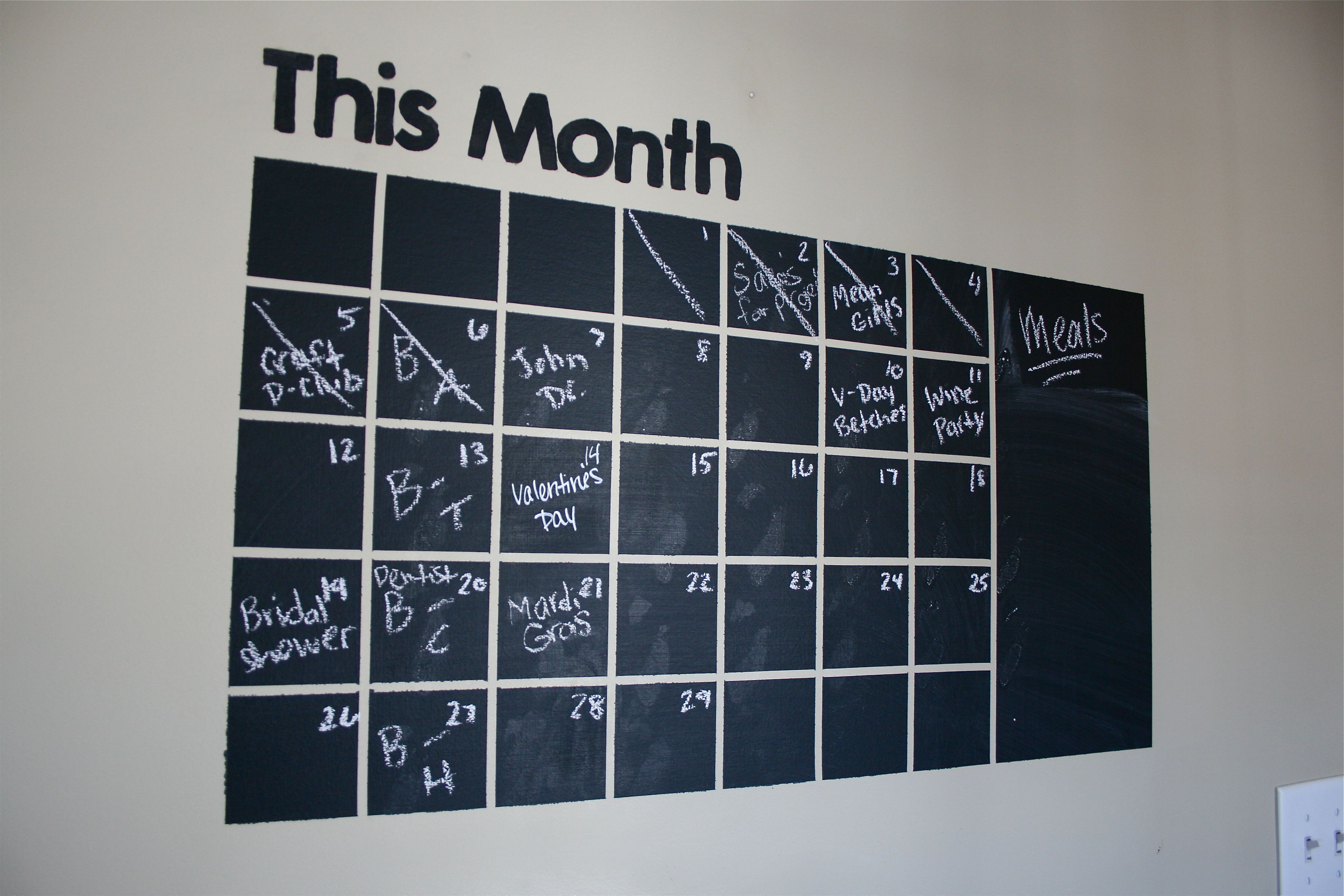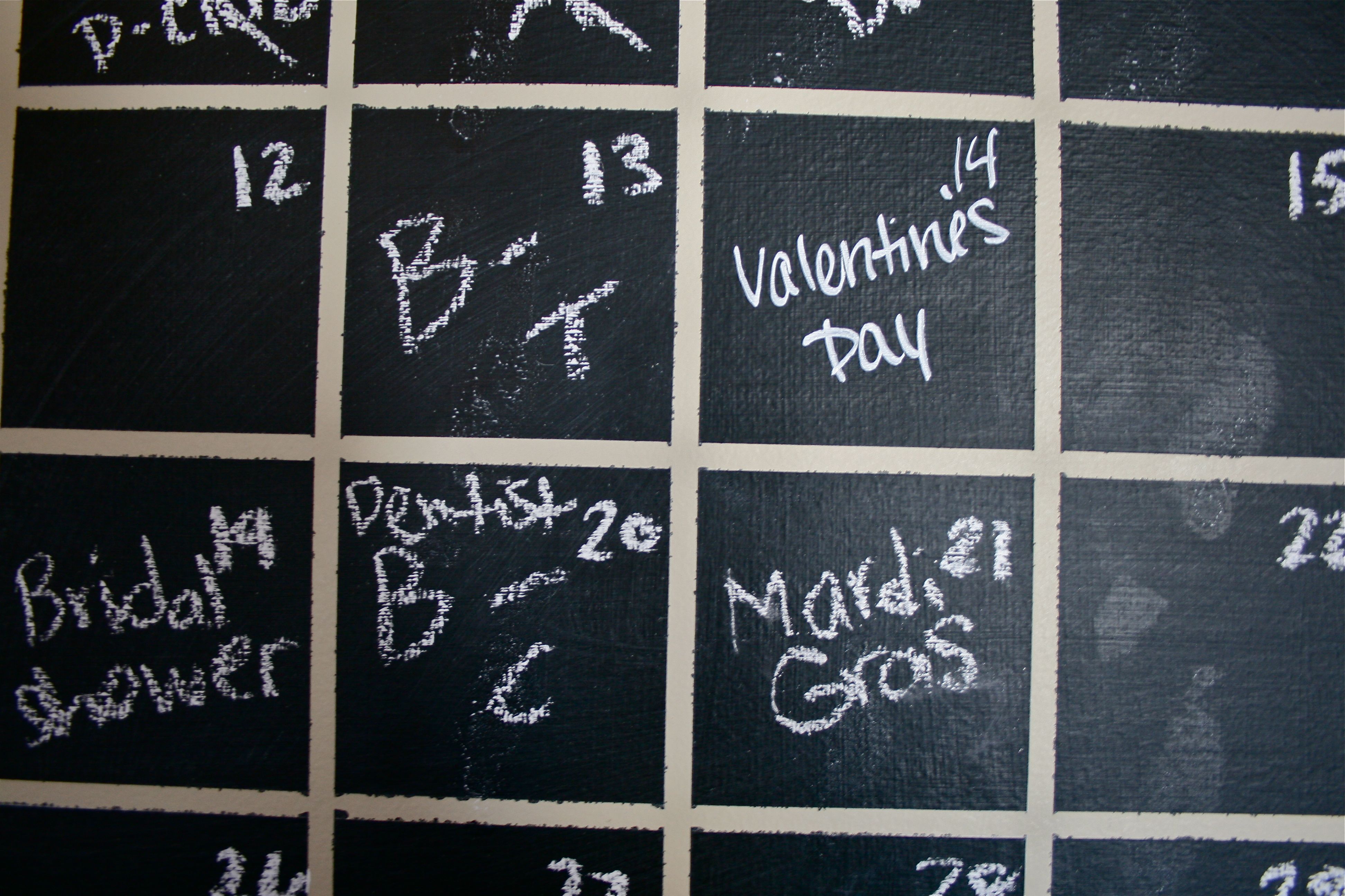 If you are familiar with our little blog, you might know about the chalkboard calendar I made in the kitchen (for all the details, click here). We love our custom calendar and use it all the time, but we have a bit of trouble reading our writing…Even though our daily squares are a generous 3″x3″, I have to abbreviate every task and could only fit one thing per day – Our social life was just about killed when I was forced to limit us to one activity a day (totally kidding, by the way).