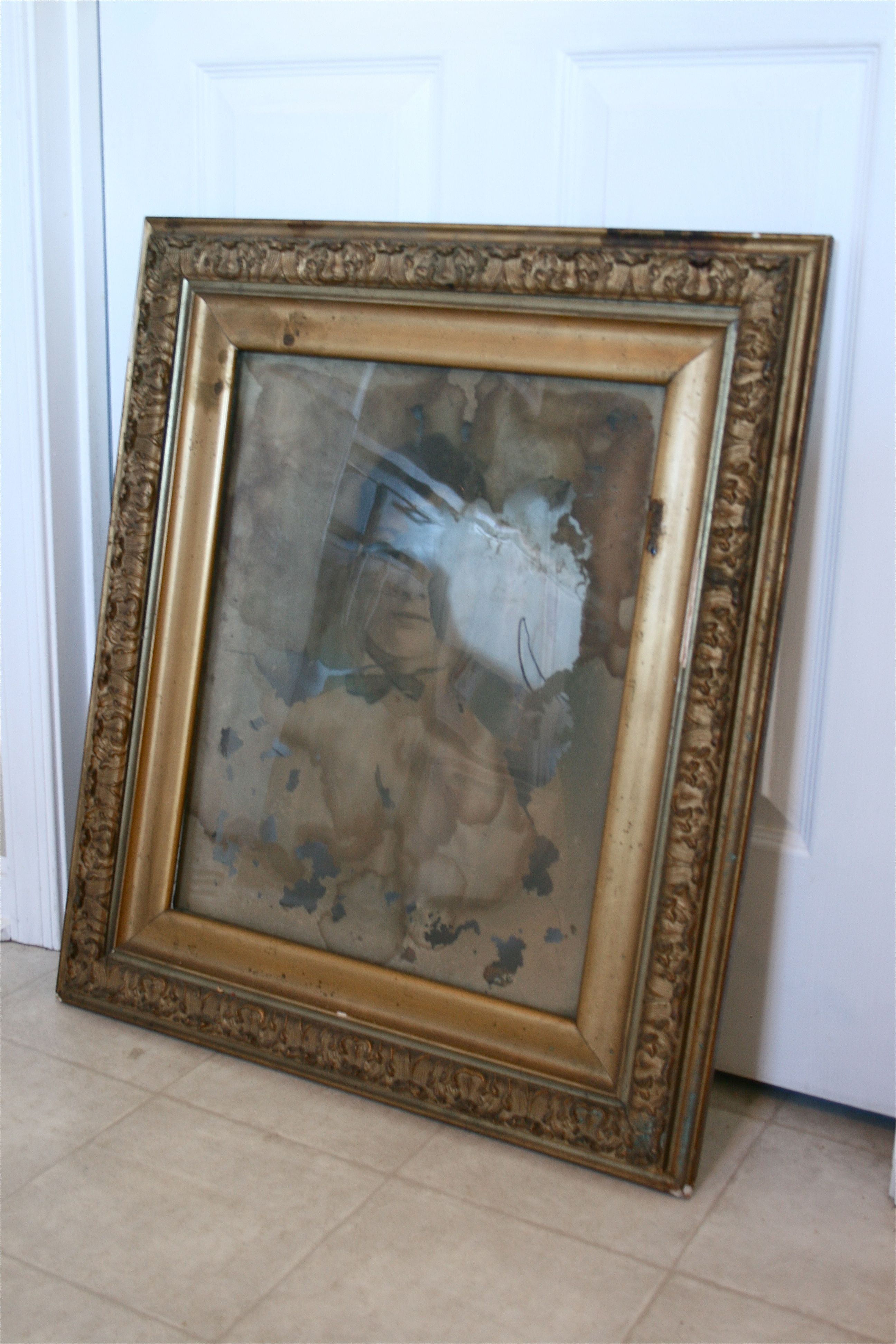 I have been meaning to pick up a thrift store frame with a gold finish for the past several weekends, but budget and time didn’t really allow for it. Luckily for me, during a wedding-to-do-list rehash with one of my bridesmaids, she mentioned having something that might work for me. While going through the home of her grandfather who recently passed away, her family came across an old framed portrait. Savannah (whom you might know from this post, or this one or this one) quickly saved it from the trash pile, thinking it could be a fun revamp project. She has since left it in my possession and I am so excited to prettify this beautiful antique.