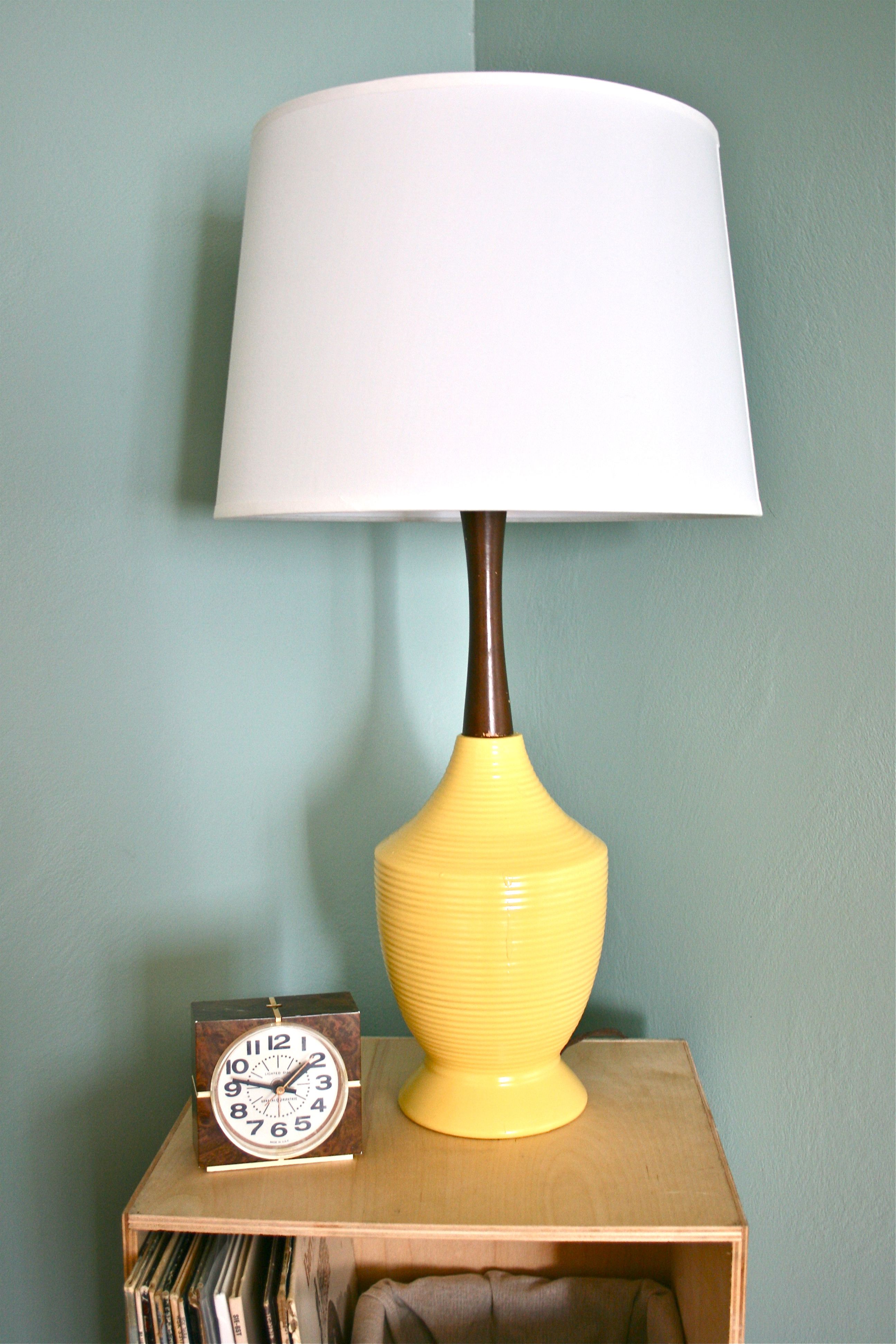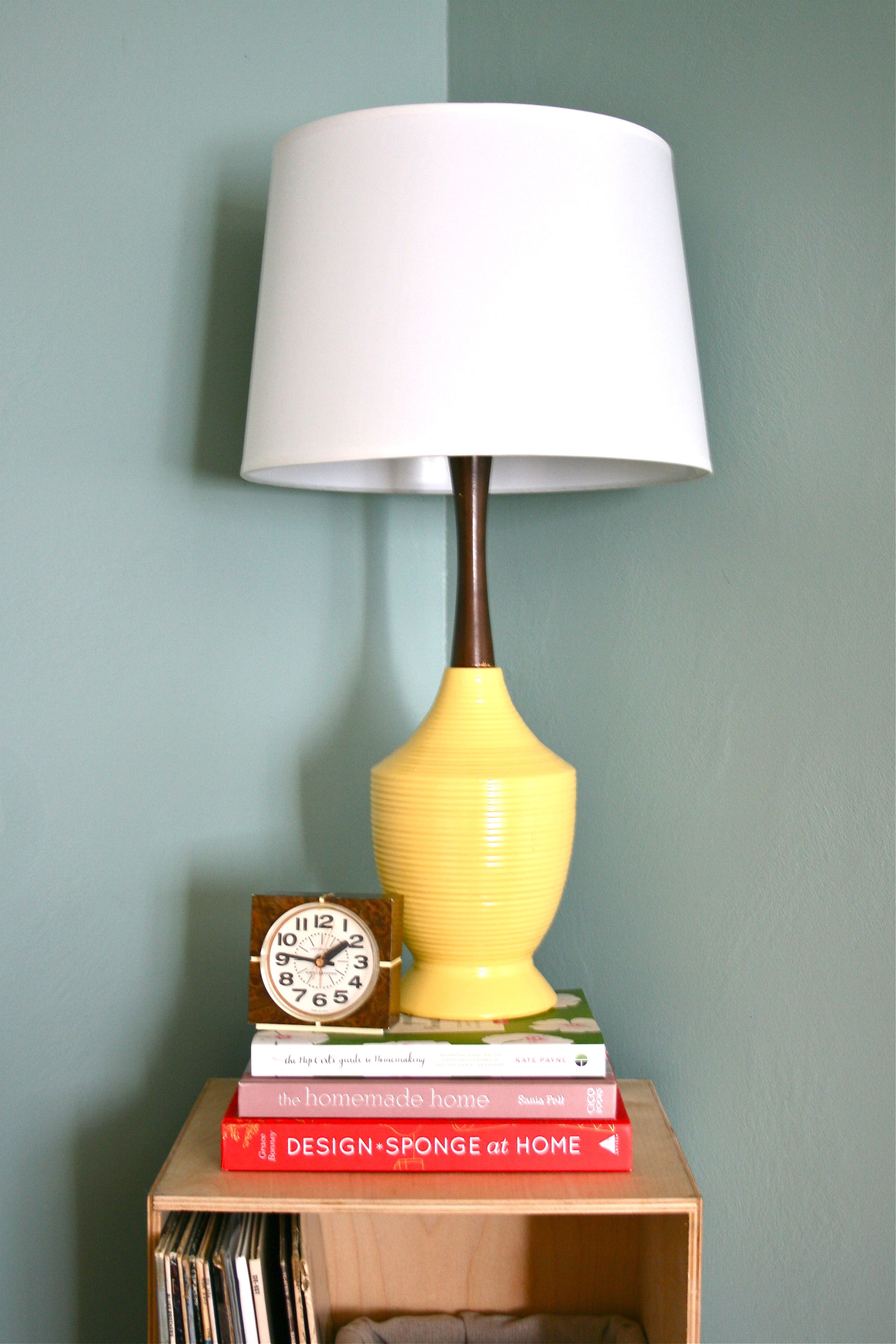 Here is my lamp before – It sat alongside one of my thrift store clocks on top of a wooden shelf that holds our collection of records. The bright base of the lamp gives the surface a little bit of punch and character, but it definitely needed something more…