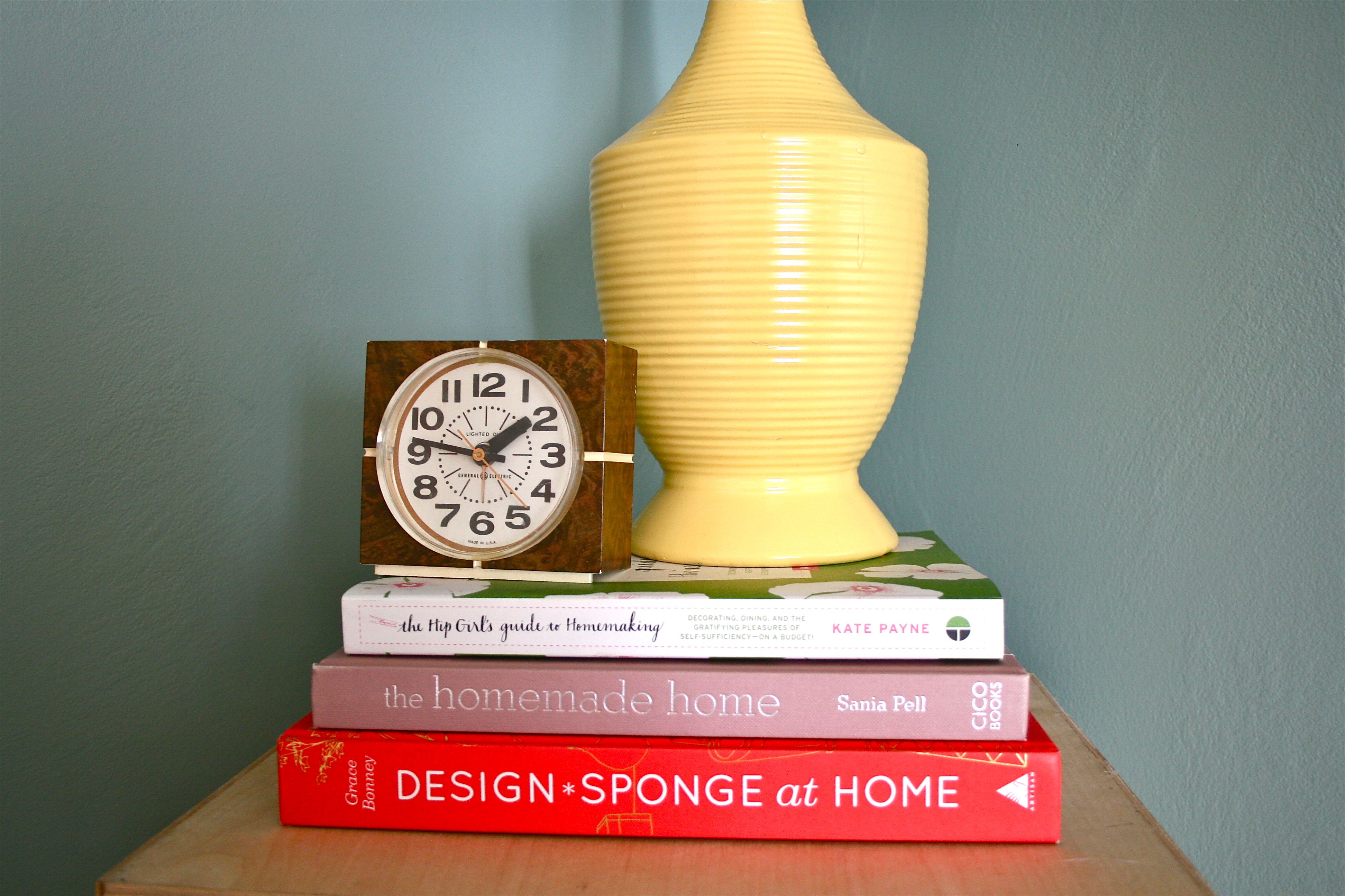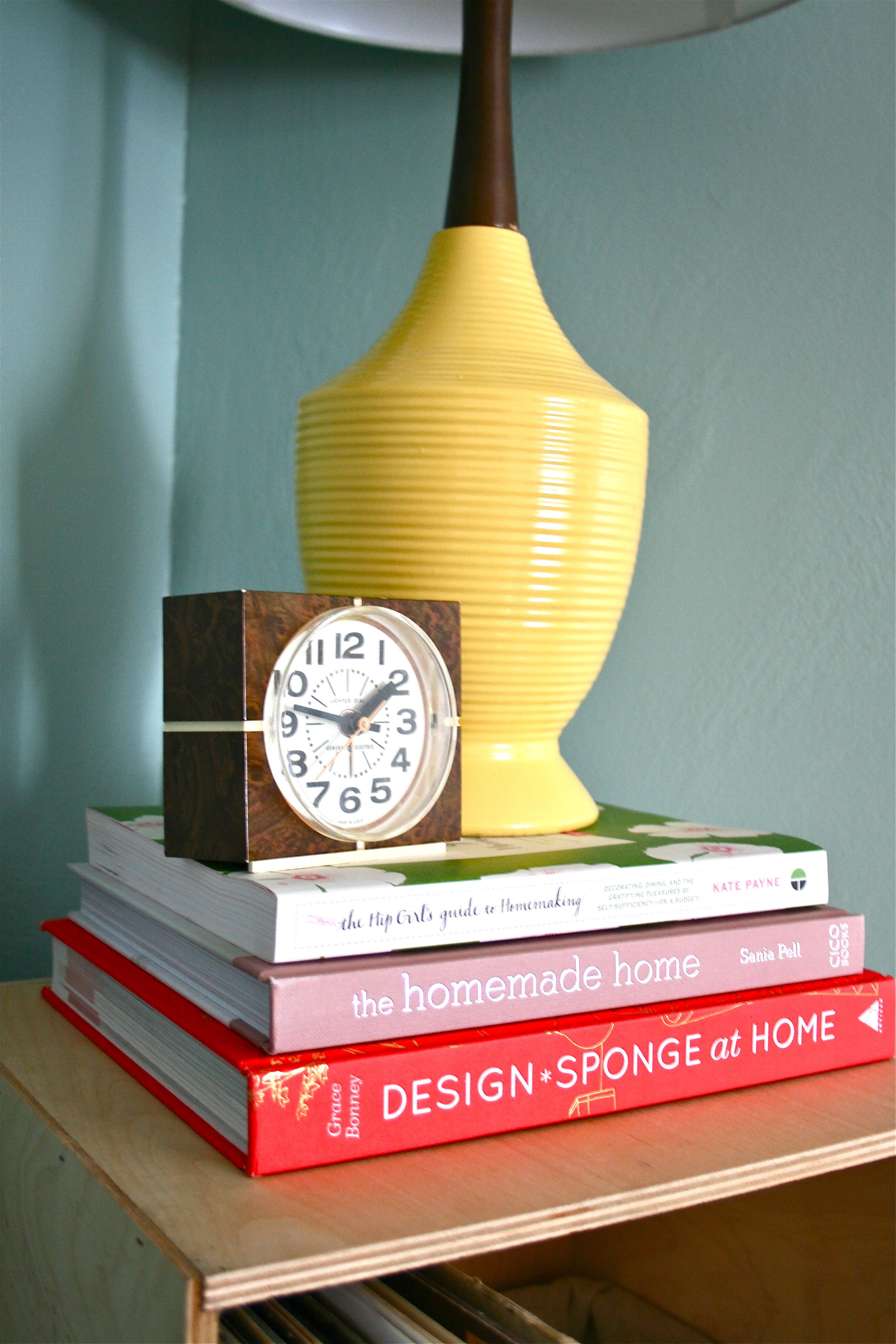 To remedy the issue, I took three oversized hardback books that I already owned and stacked them beneath the lamp and clock. I did my best to track down the most colorful books I had and lucked out with a collection of three that featured bold fonts and coordinating colors.
