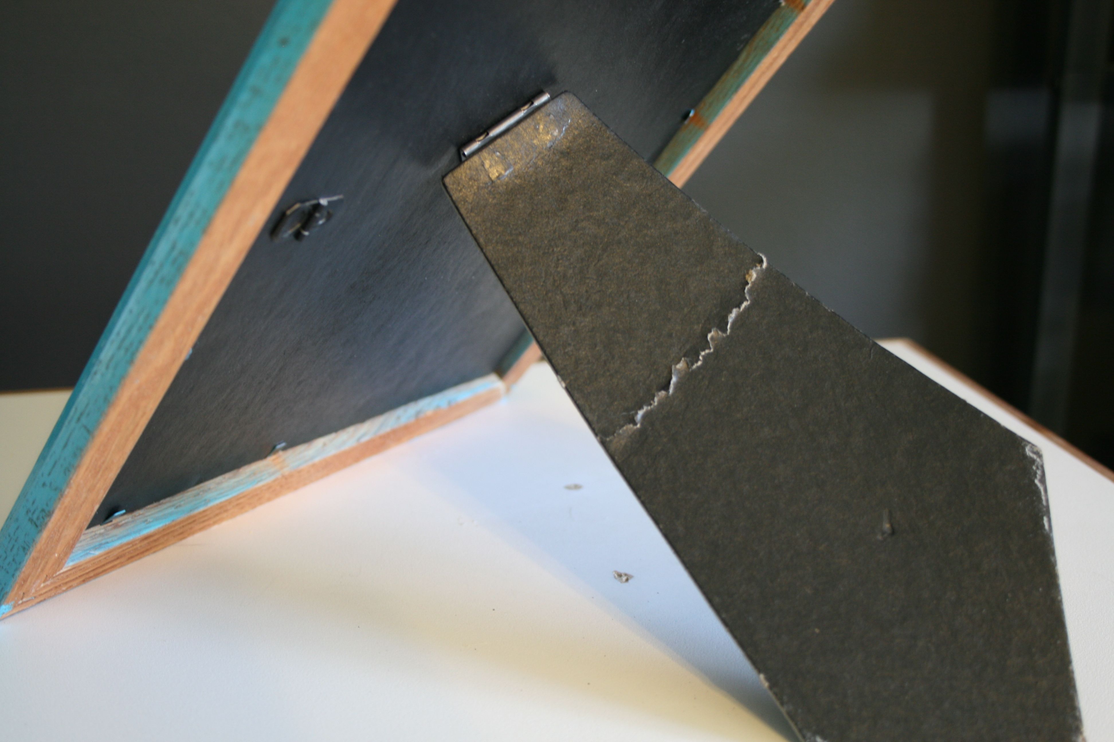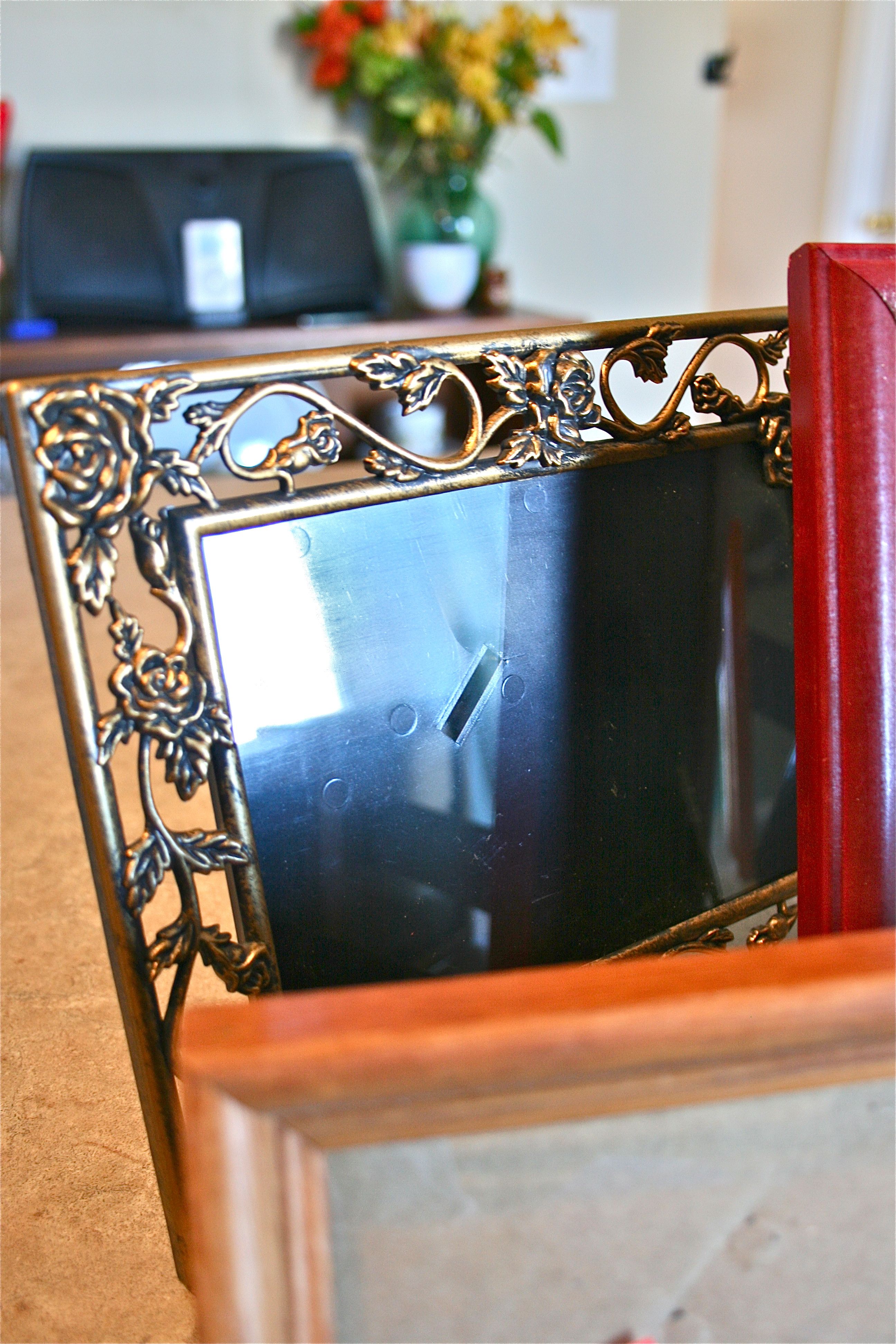 Before I show you the final results of our newly-stylish collection of wedding frames, I have to show you one last quick fix. When purchasing anything from a thrift store, you have to know that there might be some less-than-perfect conditions to deal with. Case in point, one of my frames (the largest, in fact) was feeling a little unsteady due to a bent/creased backing arm.