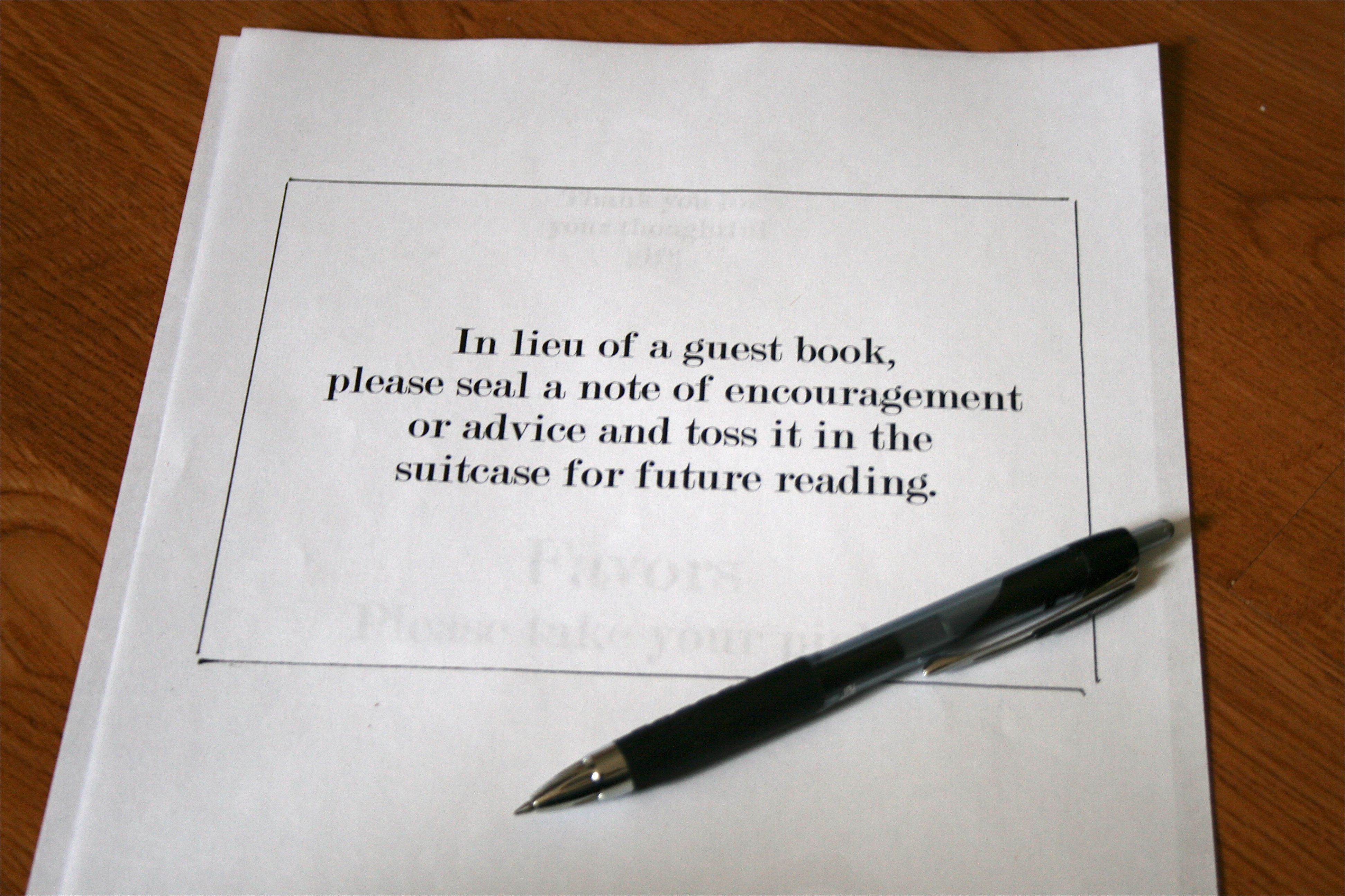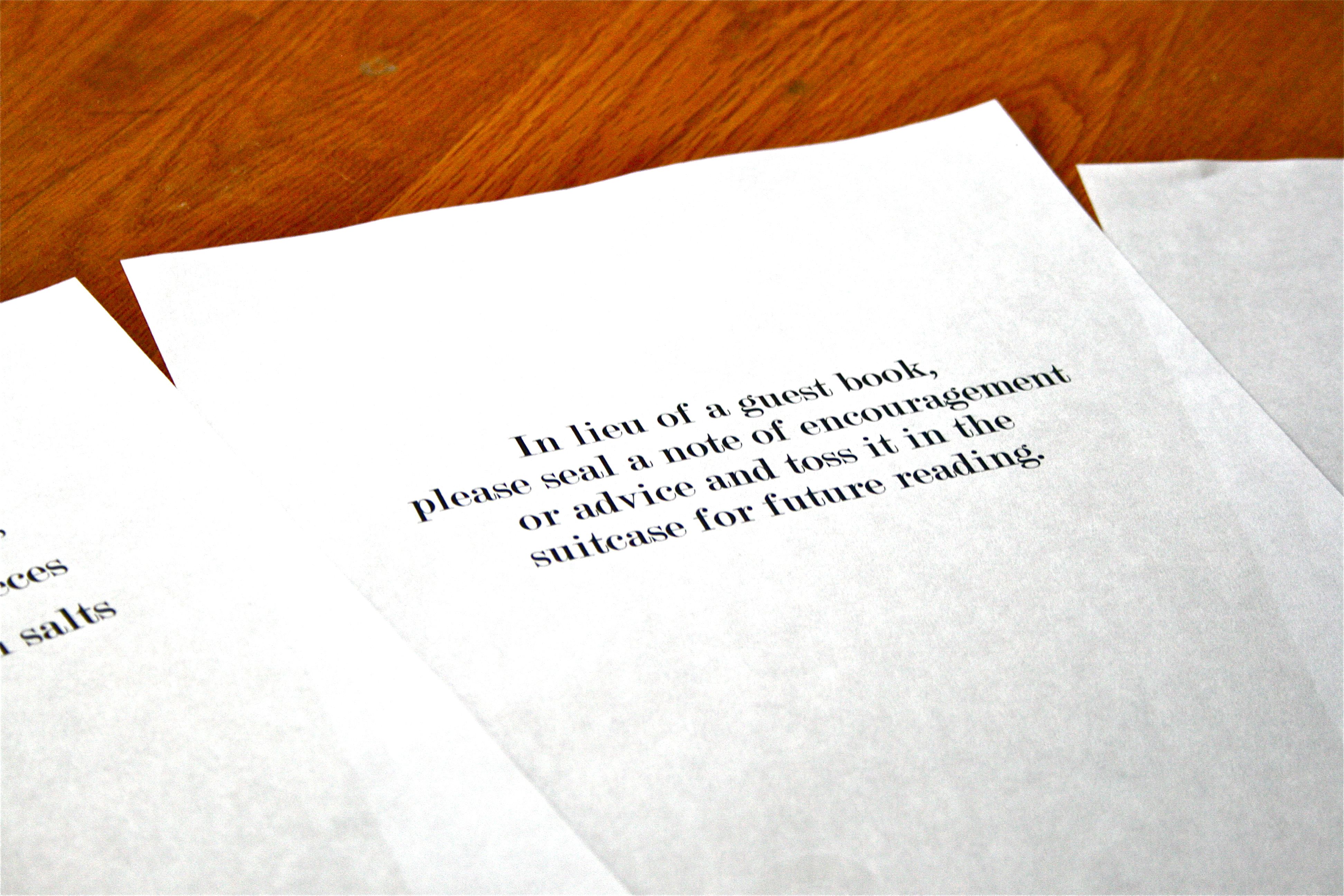 - “In lieu of a guest book, please seal a note of encouragement or advice and toss it in the suitcase for future reading.” (I’ll explain this project in a post very soon)
