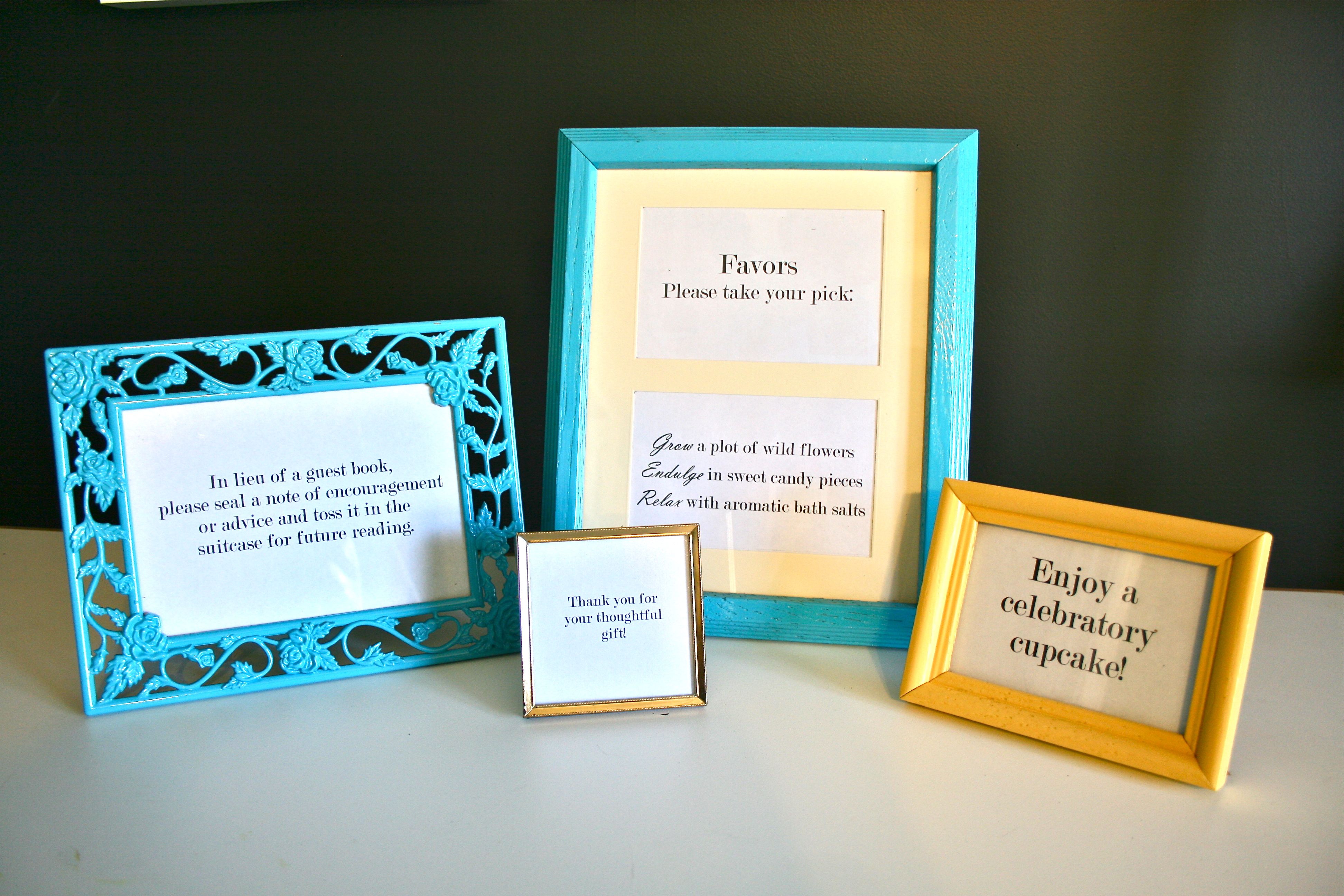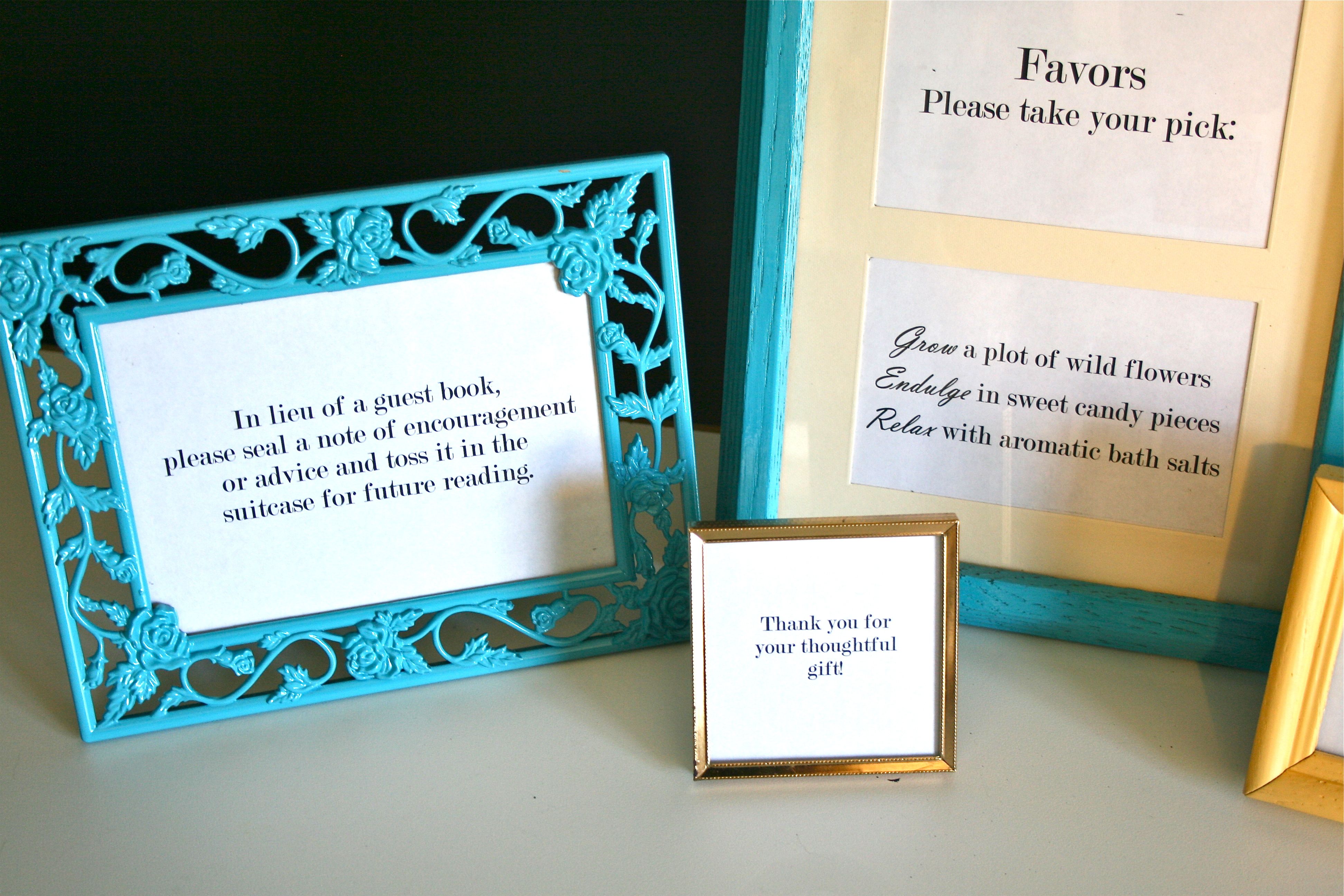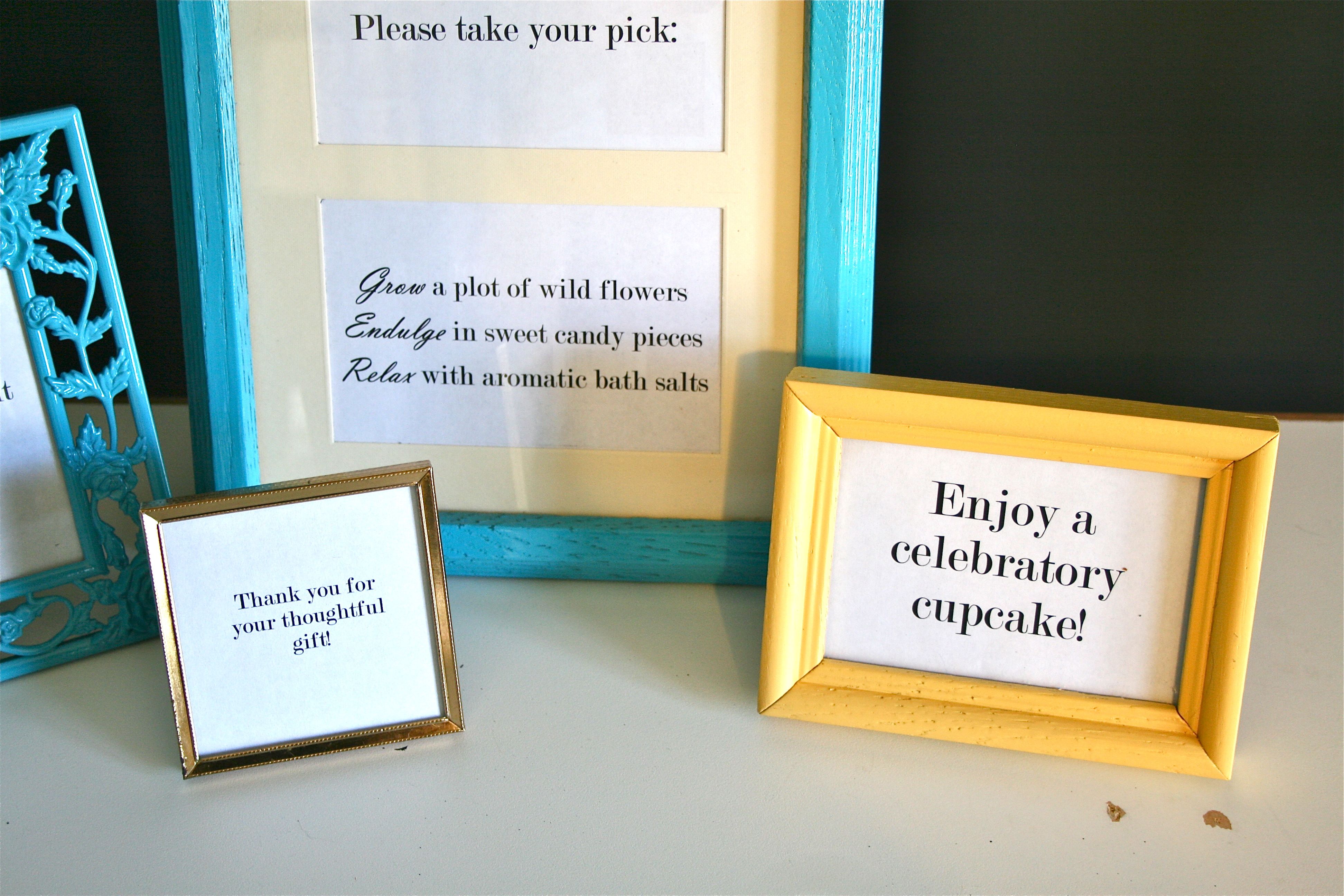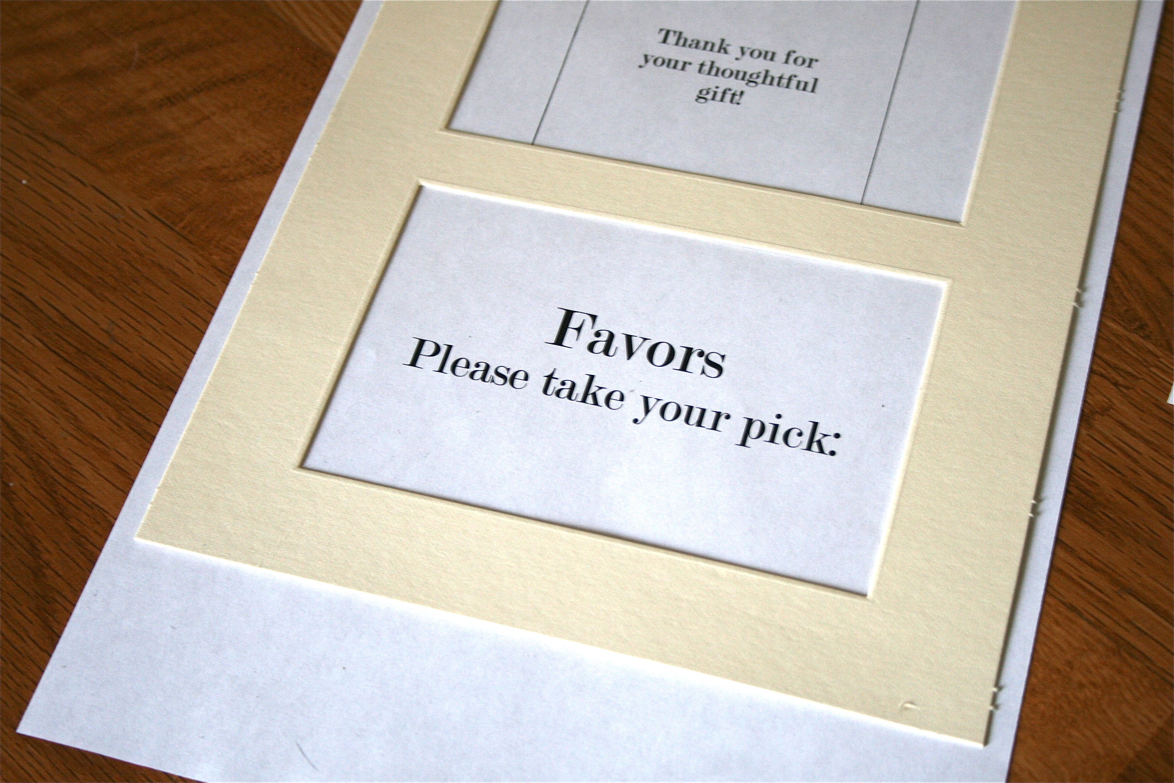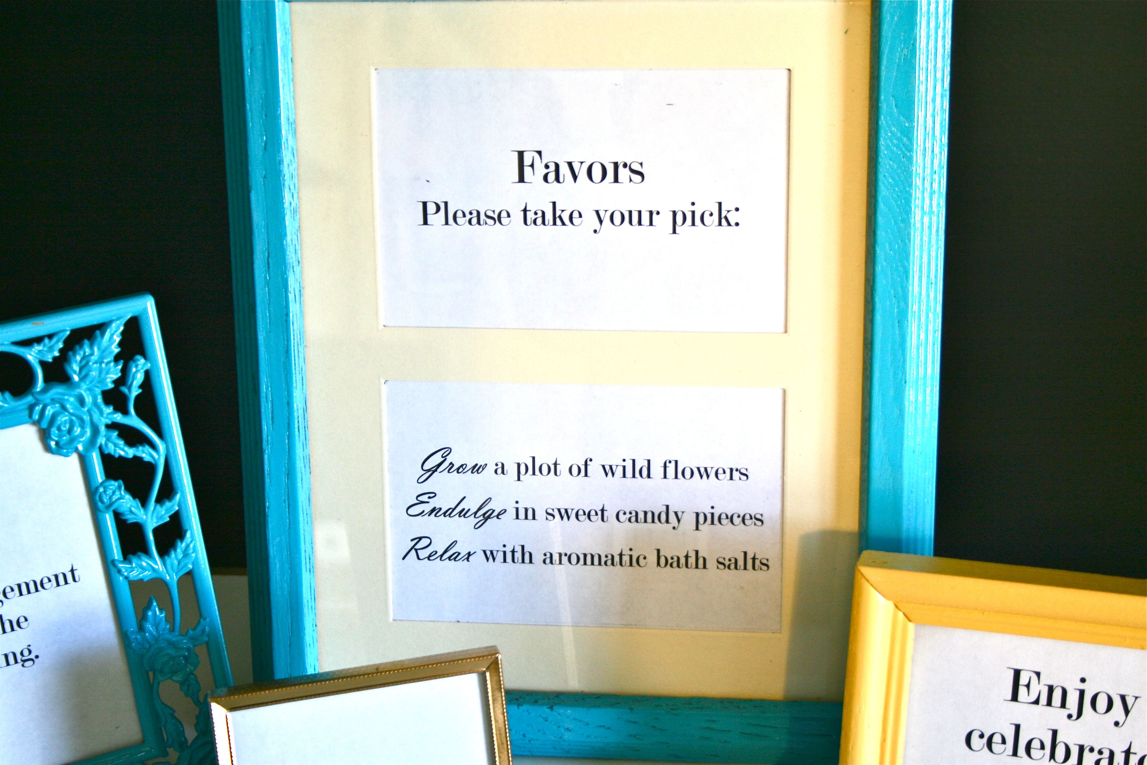 - “Favors – Please take your pick:” and “Grow a plot of wild flowers,” “Indulge in sweet candy pieces,” “Relax with aromatic bath salts” (these will all go into the one frame I bought that has two openings in the mat board)