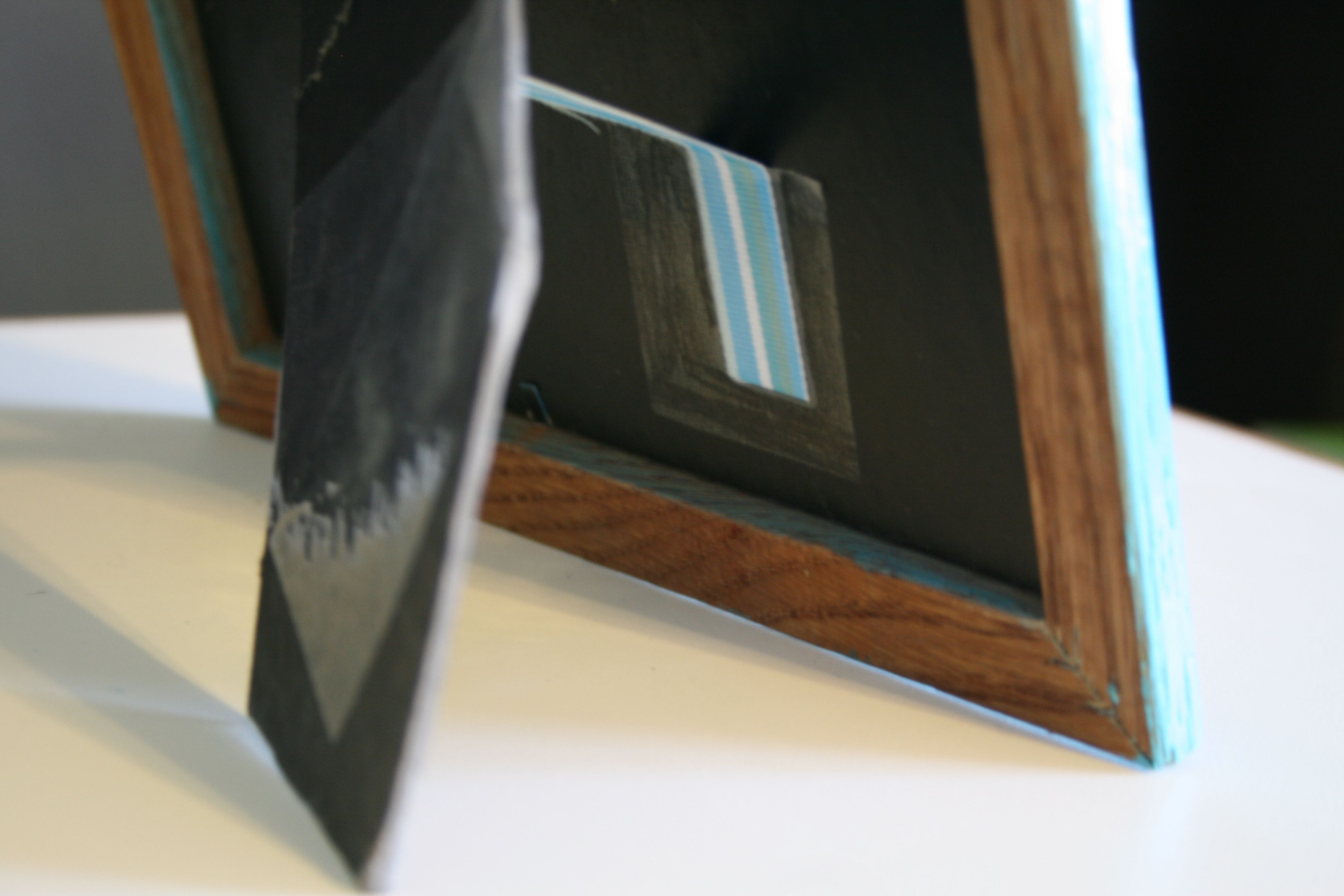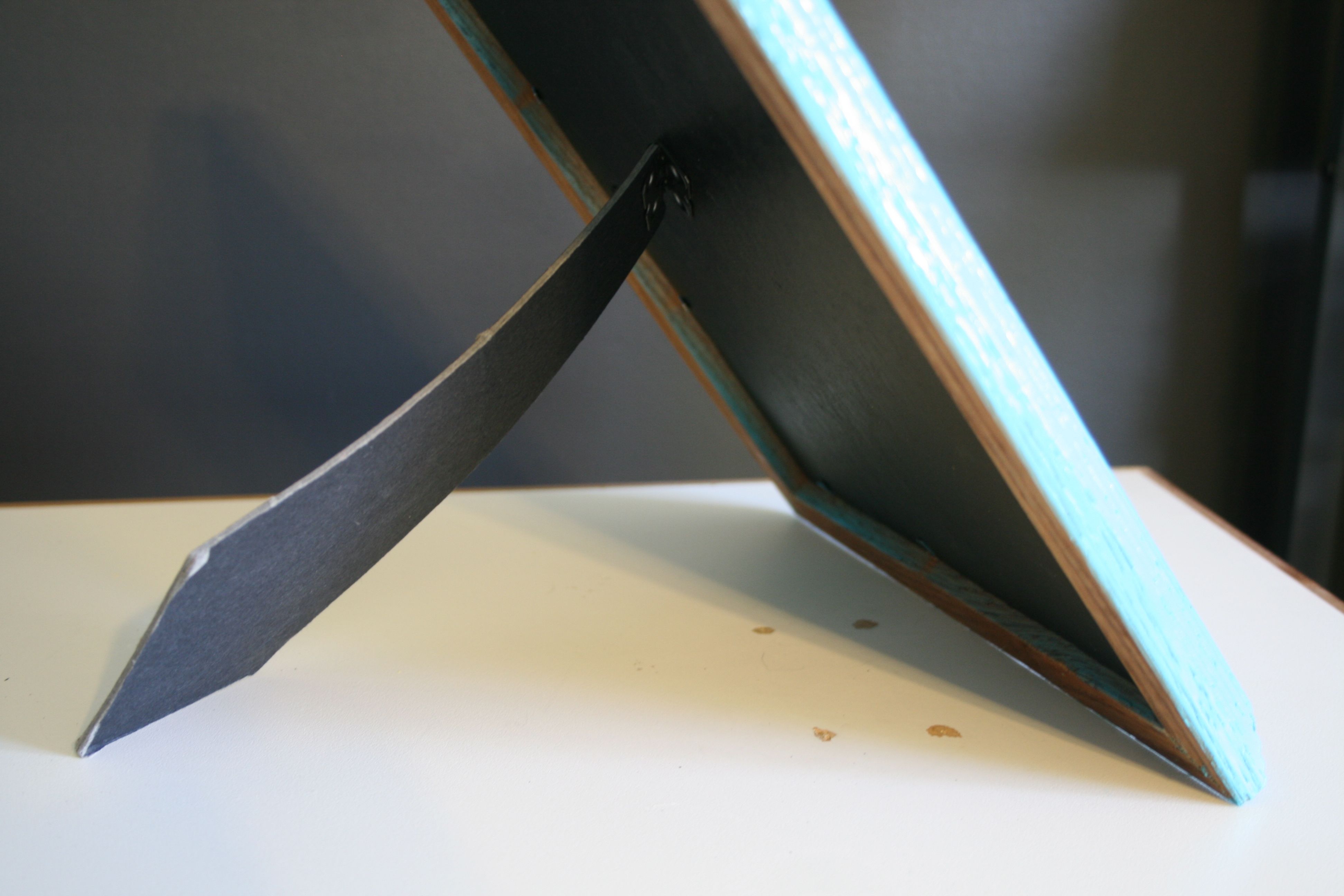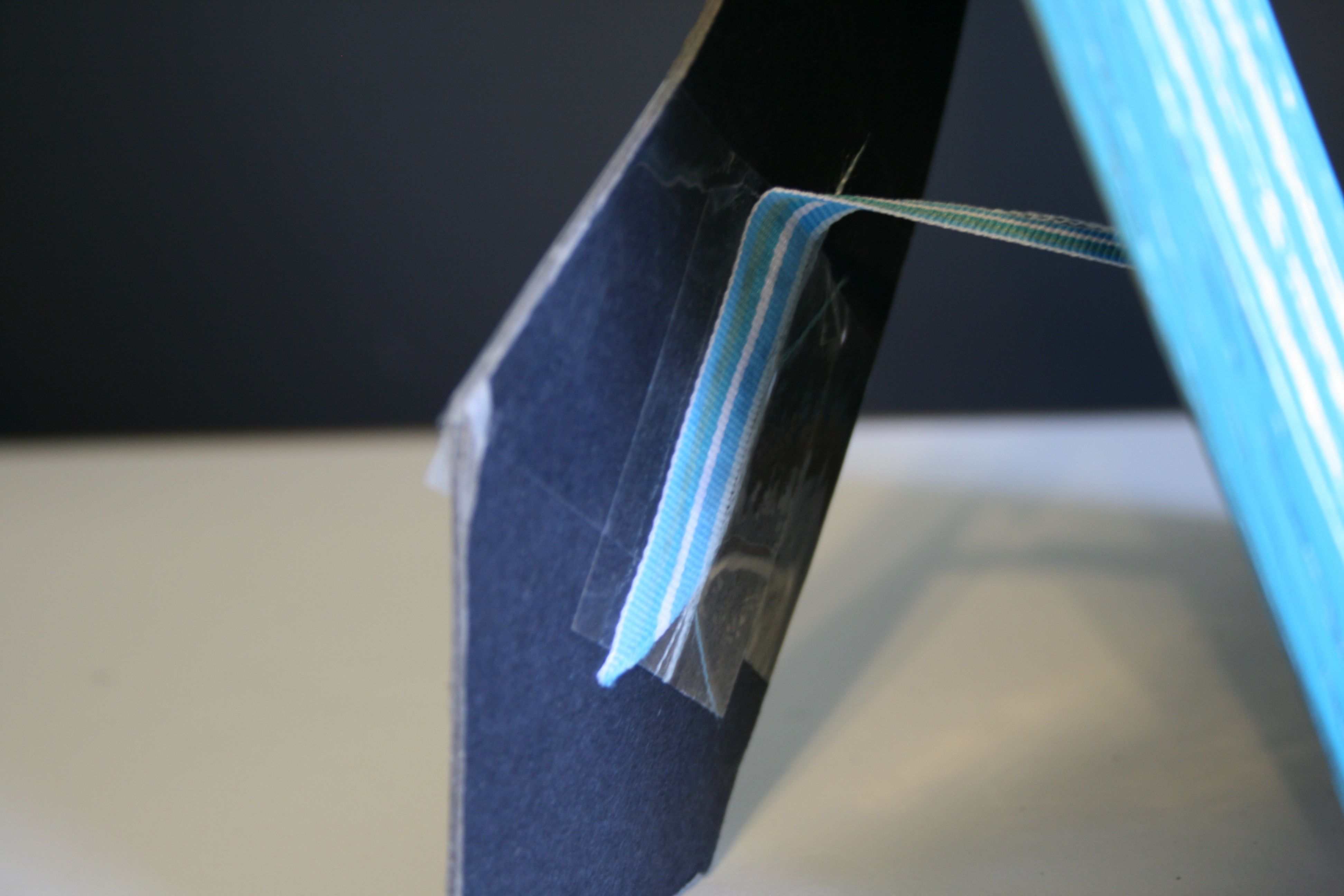 I debated reinforcing it was a dowel rod, but in the end I went with a piece of ribbon and some tape. I cut the ribbon to the length of the distance I wanted the frame arm to swing out (with a little extra on the front and tail of the ribbon). After it was cut to size, I taped one end of the ribbon to the frame’s backing board and then the other end to the arm. This meant that the arm could swing out only so far from the frame, steadying it on whatever surface it sat on.