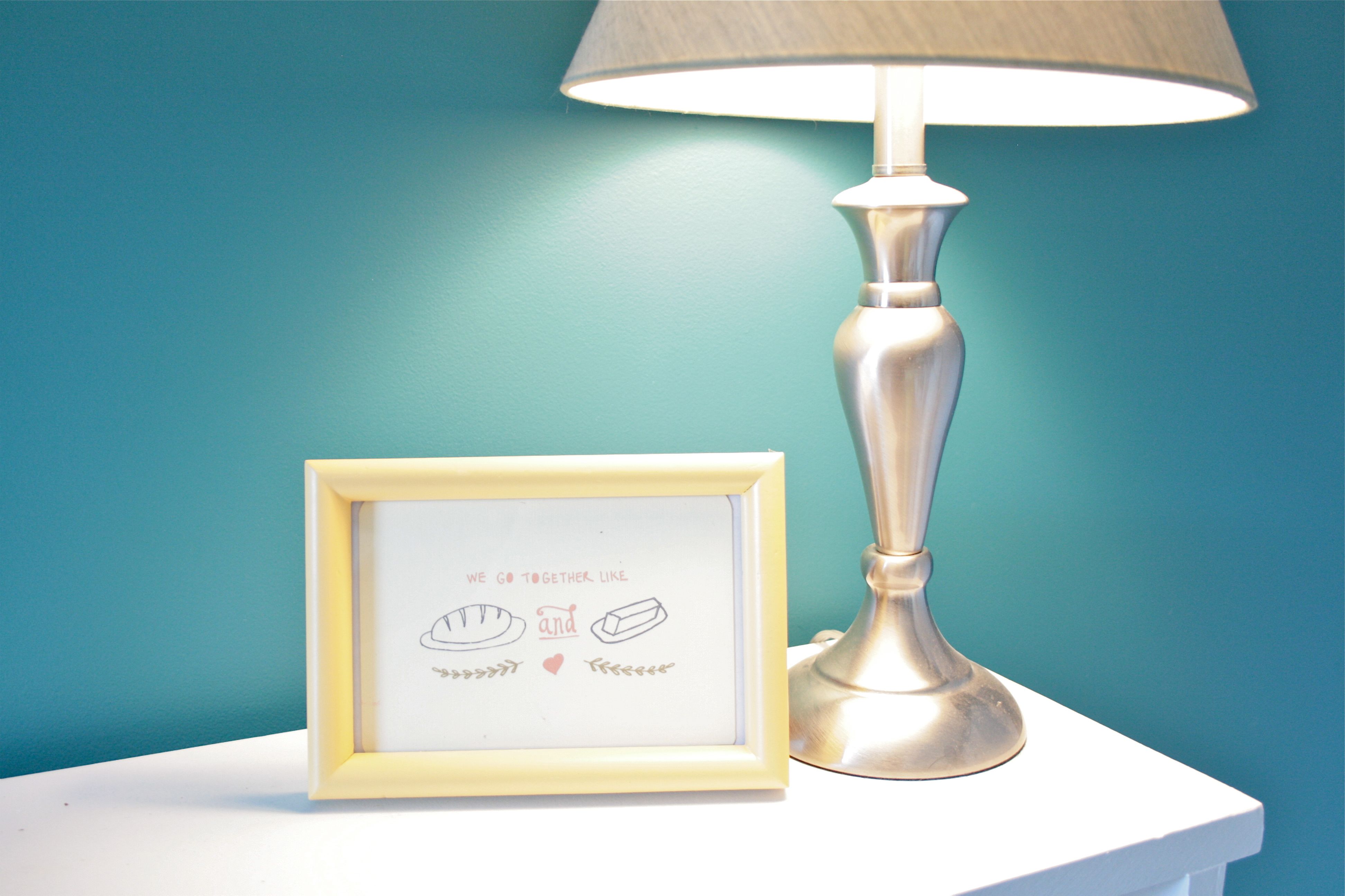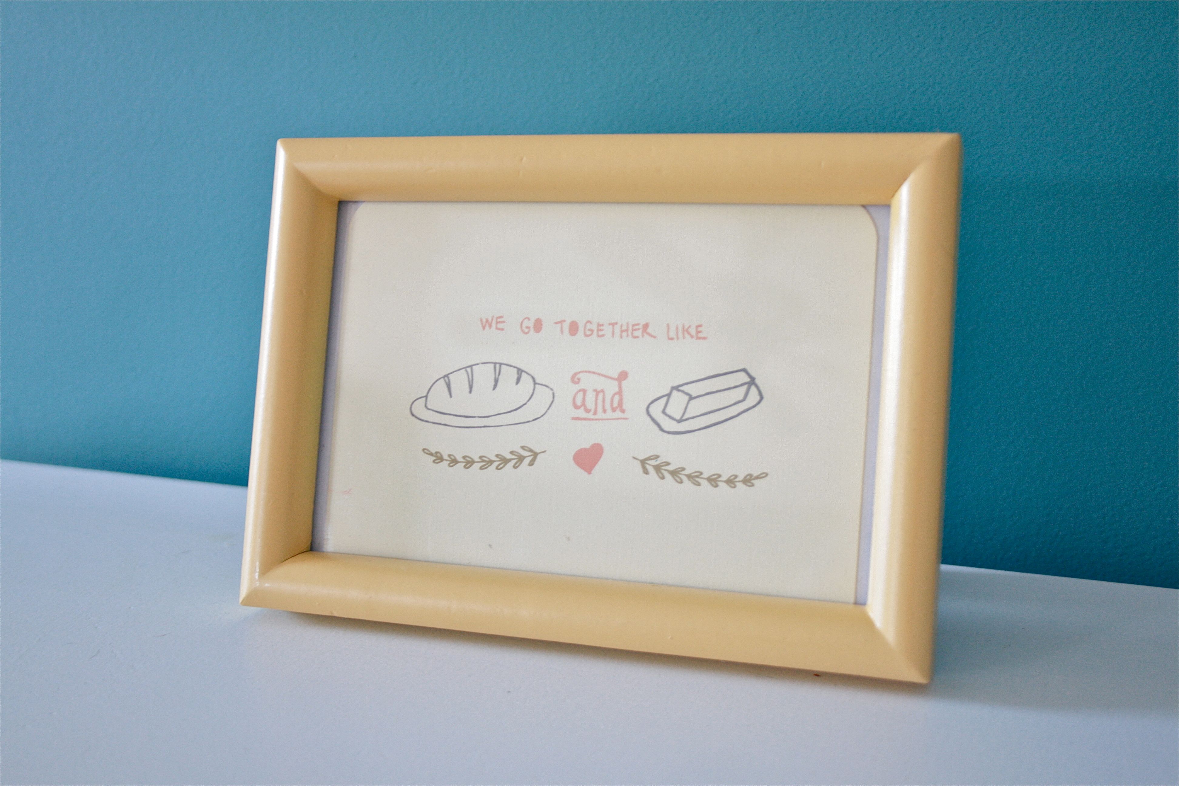 I love the combination of the rose-colored text against the pale yellow frame – Pastel hues are sooooo pretty together. The perfect way to celebrate my Valentine and how we really do go together like bread and butter…