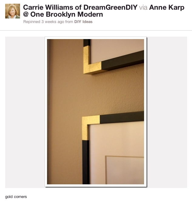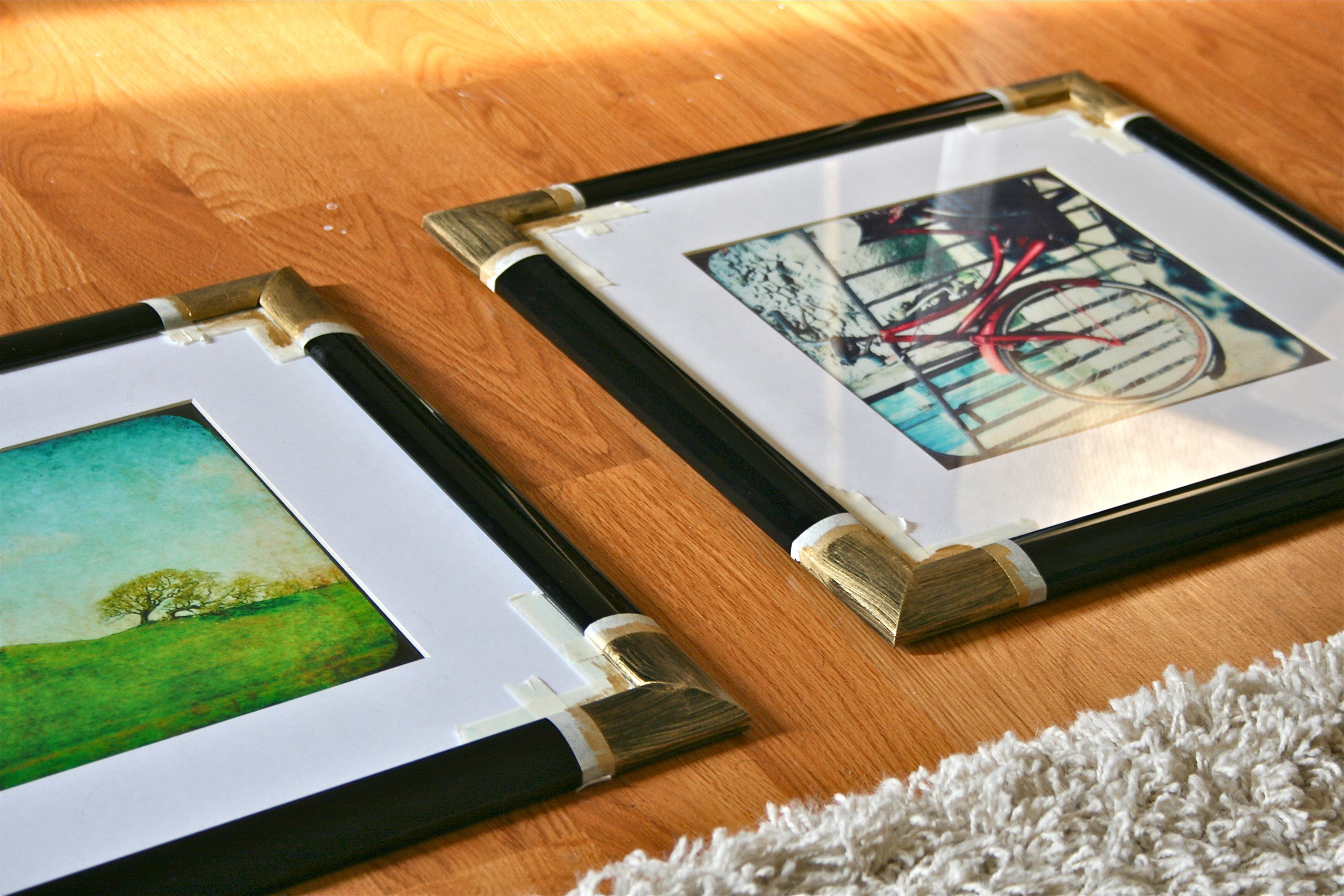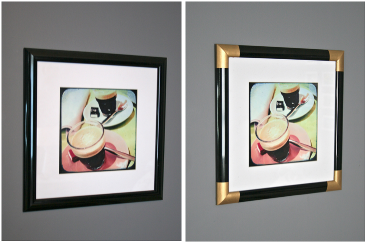 As subtle as it seems, I was instantly drawn to the idea of metallic gold corners on black frames. I am all about brass and warm-toned metals at the moment, so I just knew I had to give it a shot. If you follow the link above, you’ll see that Courtney actually used metallic spray-painted masking tape to achieve the look of gold corners without the permanence of painting directly on the surface. A genius idea for those who aren’t sure they want to commit, but I was sure about the look and decided to go for it, all in.