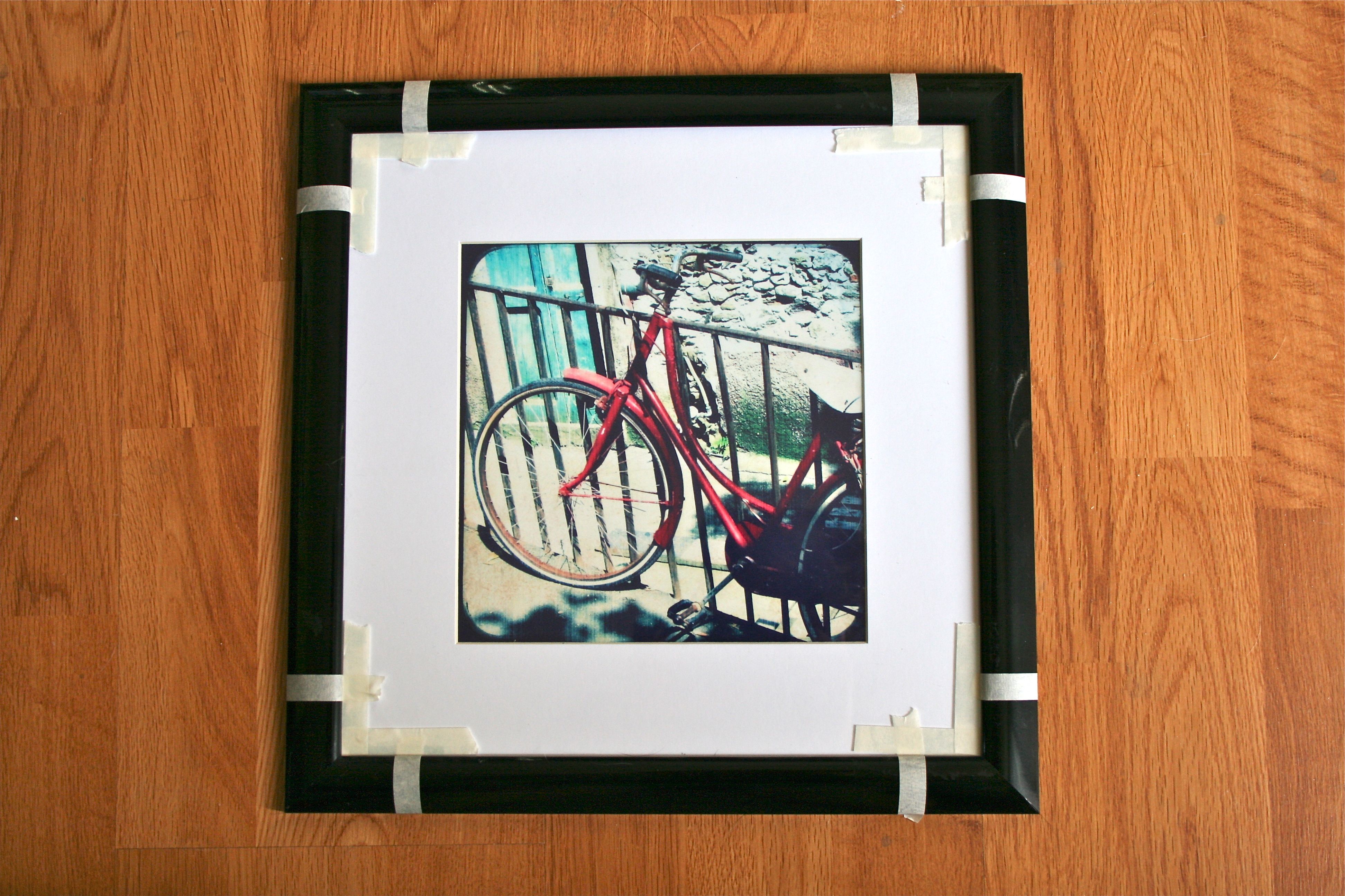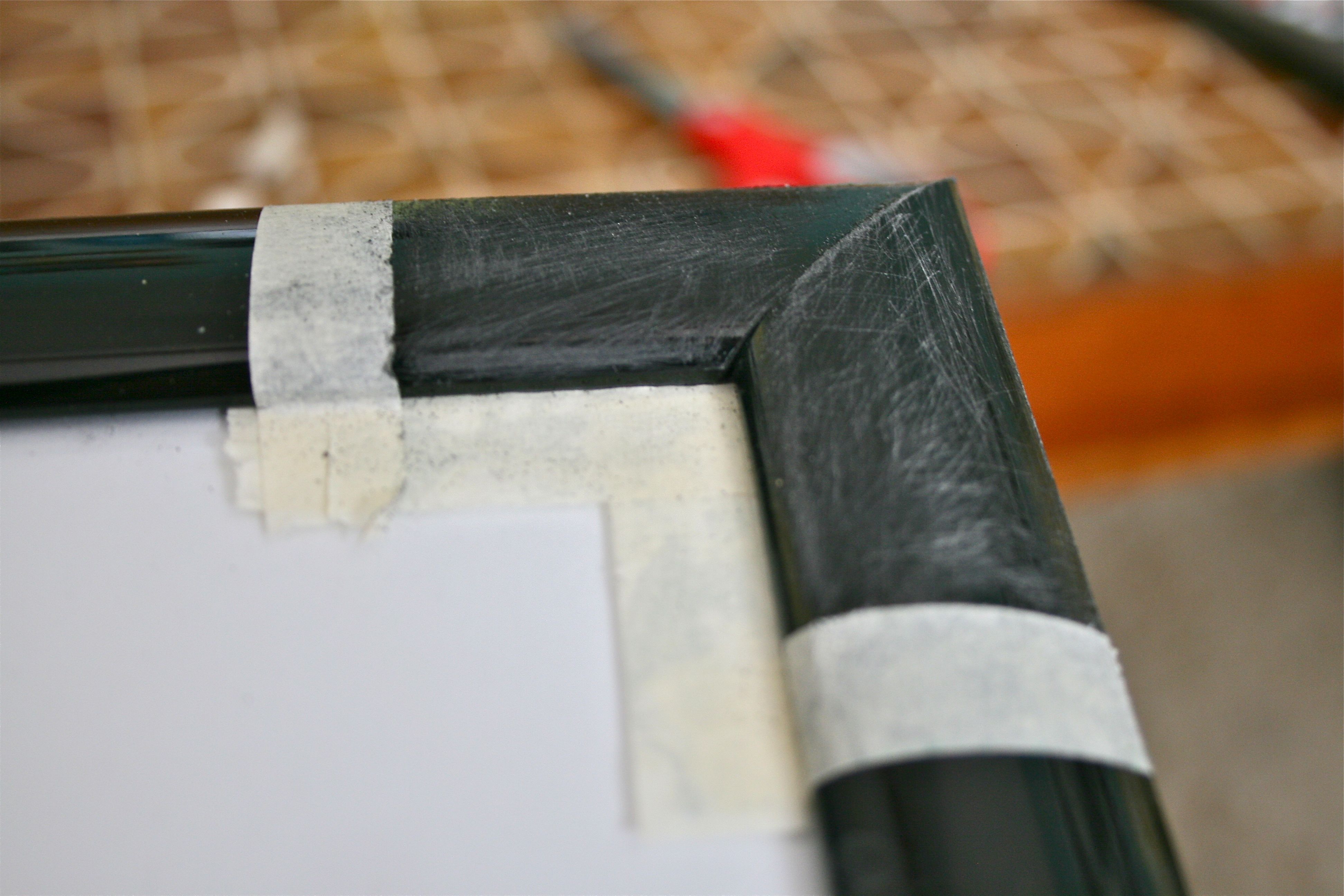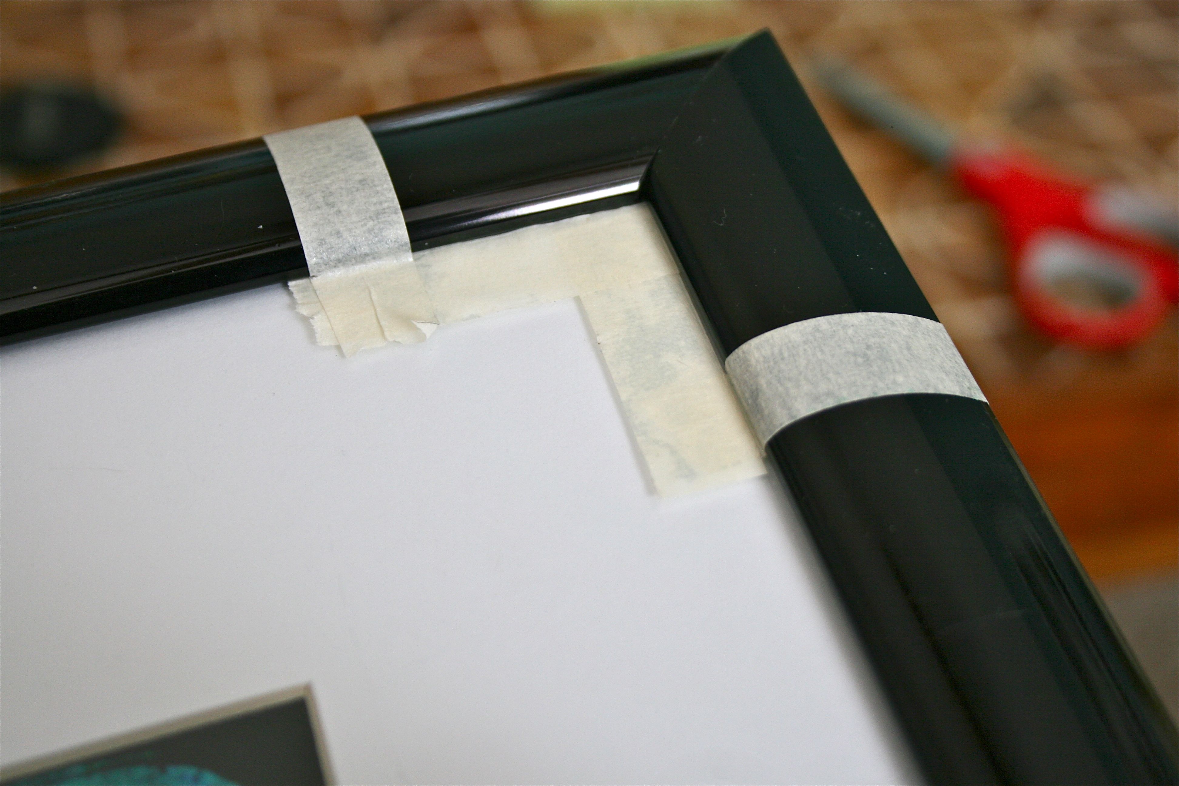 After all of the taping was finished, I took some medium grit sandpaper and roughed up the taped-off corners. This step helped with giving the paint something to “grab” onto. I highly recommend this step – I thought maybe I could get away with not sanding and went ahead and painted three out of four corners on one of my frames, but ended up having to give them an extra coat of paint in the end. So sand, sand, sand for best results!