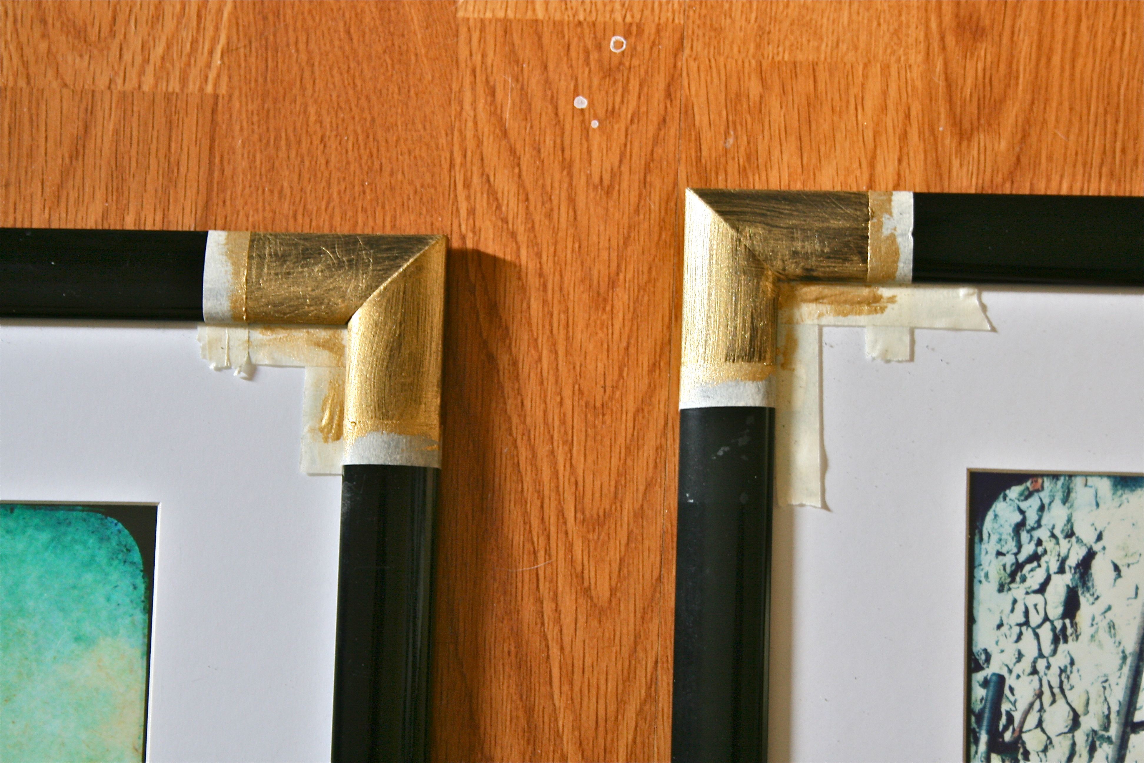 First, I taped off my corners. The glass (or in this case, plastic) inside my frames is glued to the inside, so I couldn’t simply remove it and just tape the frame. I had to tape both the edges of where my gold corners would end up and the plastic surface as well. To make my corners even, I used a ruler and measured/placed them two inches in length from the outside edge.