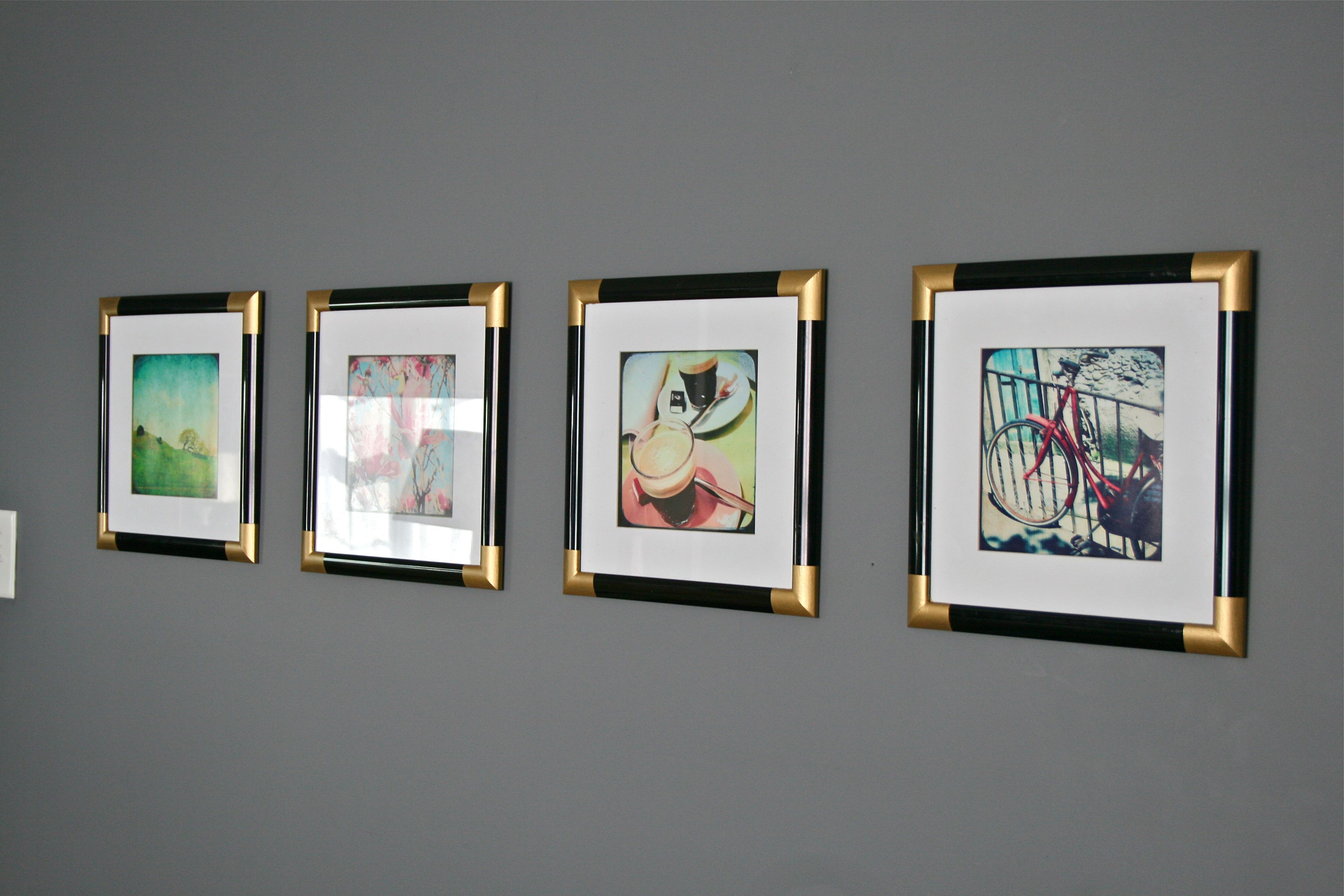 I think the new golden corners add so much interest, more than I could have even anticipated. The frames originally cost me about $10 apiece and the gold paint, only $1.99. For a total of about $11 each, this project really transformed the look of the collection – Of course, it’s just my opinion, but I think they look much more expensive now. So excited about the end result!