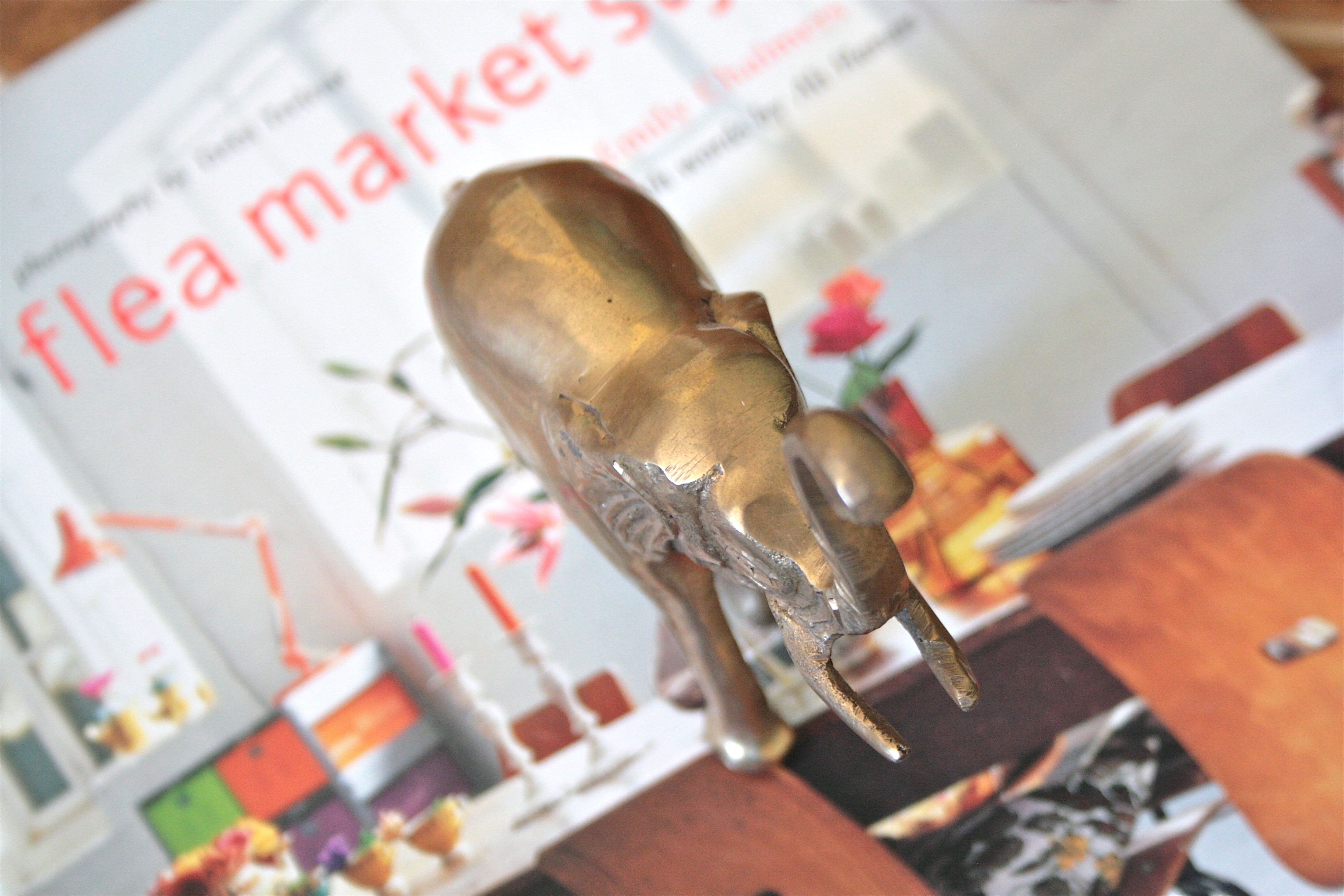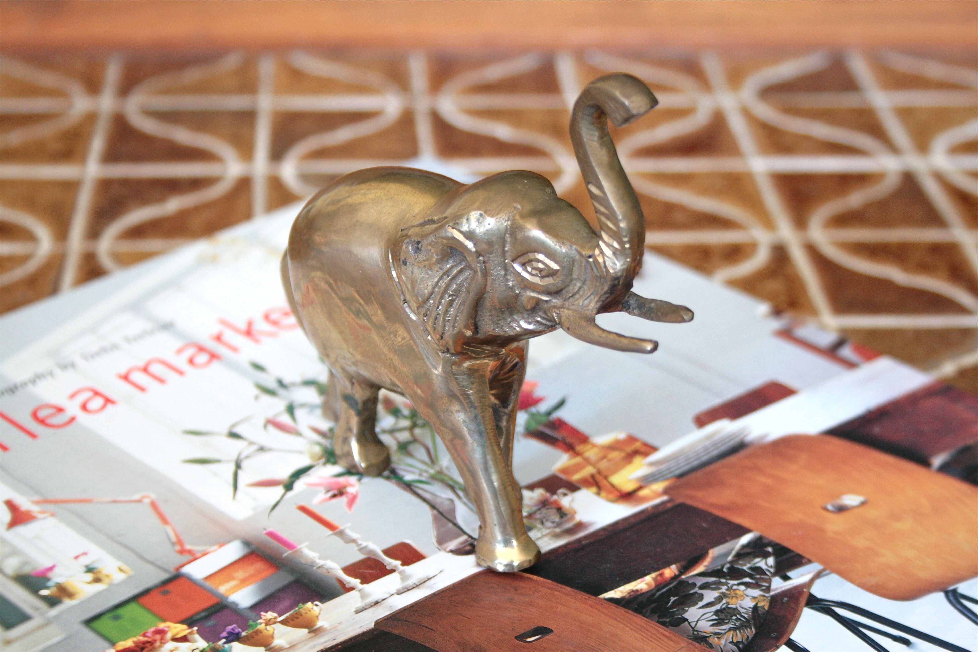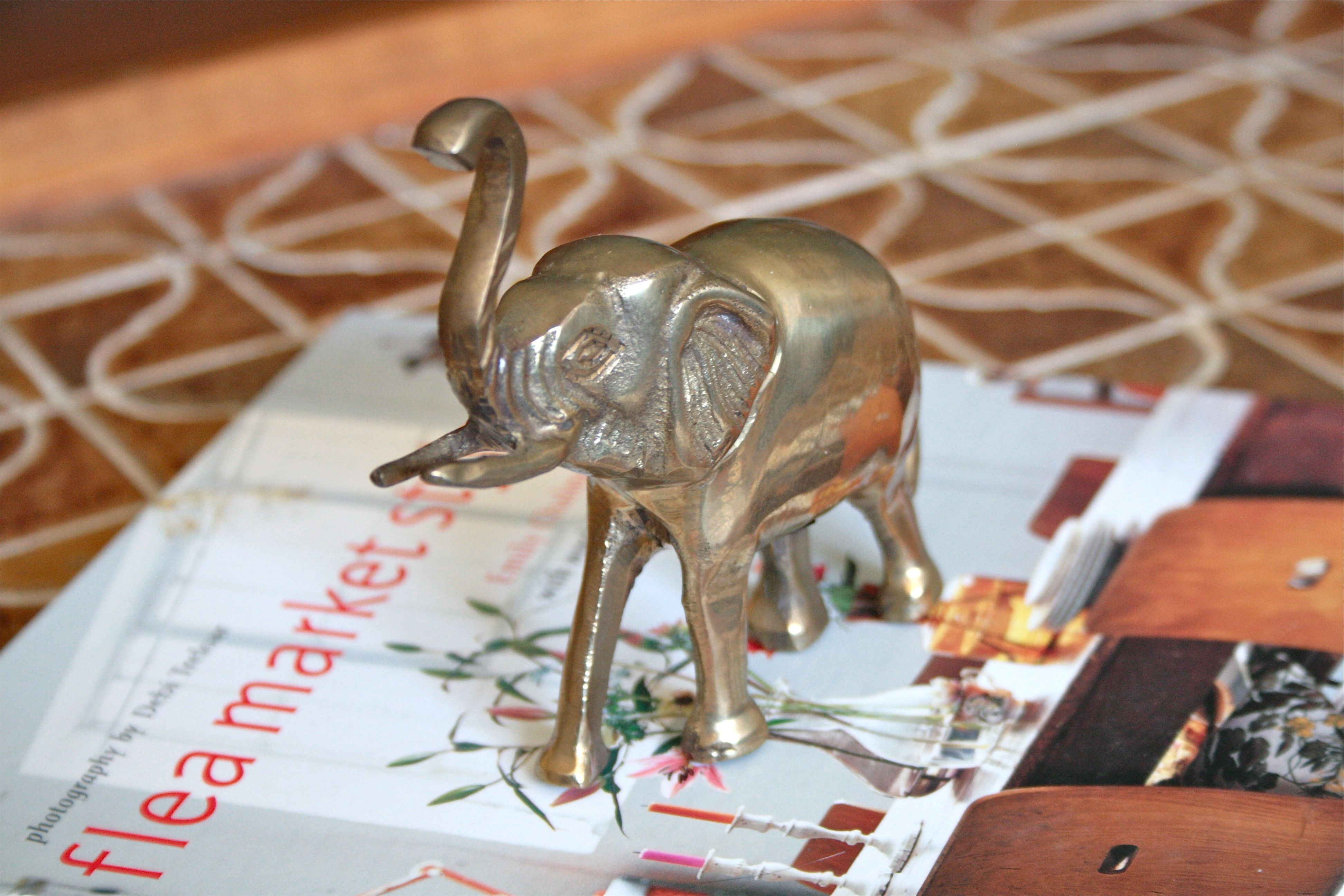 I love the hammered texture along his back – Reminds me of a raw sculpture only half complete. He is also a great reminder of my little sister, who adores elephants. If I remember correctly, she told me once that elephants with their trunks raised are a sign of good luck – We can all use a little mystical luck in our lives, so I’m happy to snag a bit for myself through this trunk-happy brass elephant.