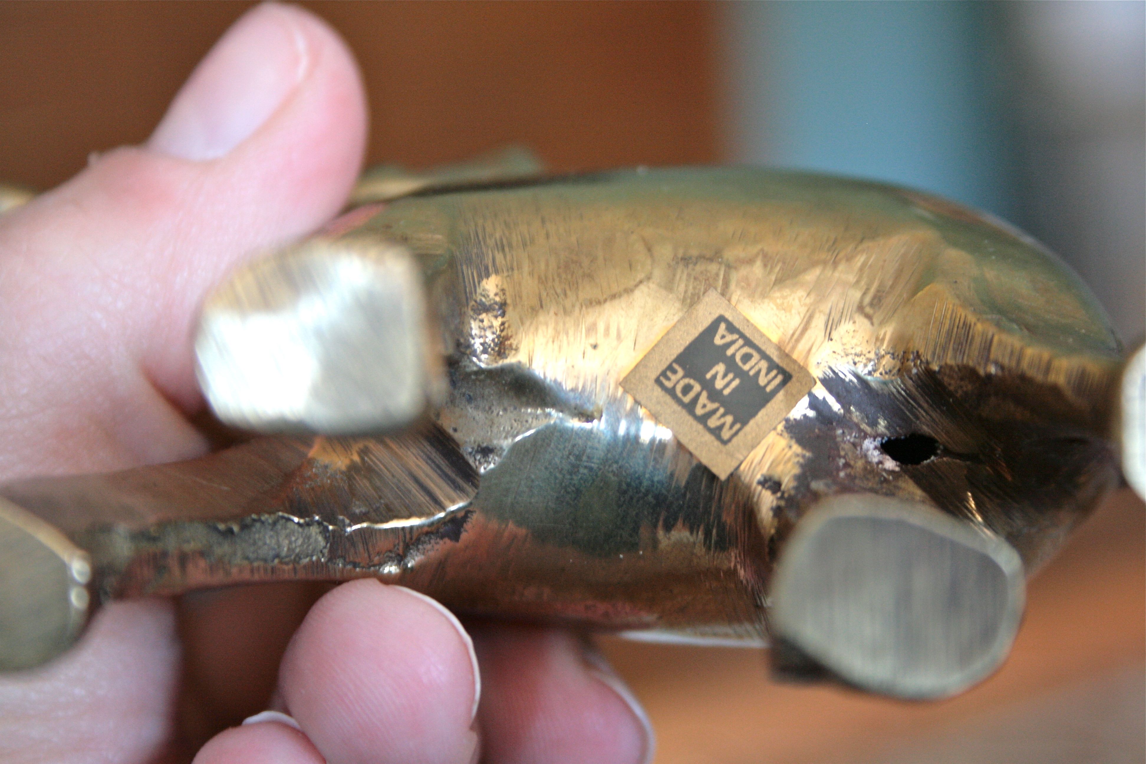 Since most of my brass menagerie is taking up residence in other rooms of the house, I needed to add to the brood. Main stop – Estate Specialist downtown. While there, I came across two new additions to our golden collection, all for only $6.30. Thrift store SCORE!