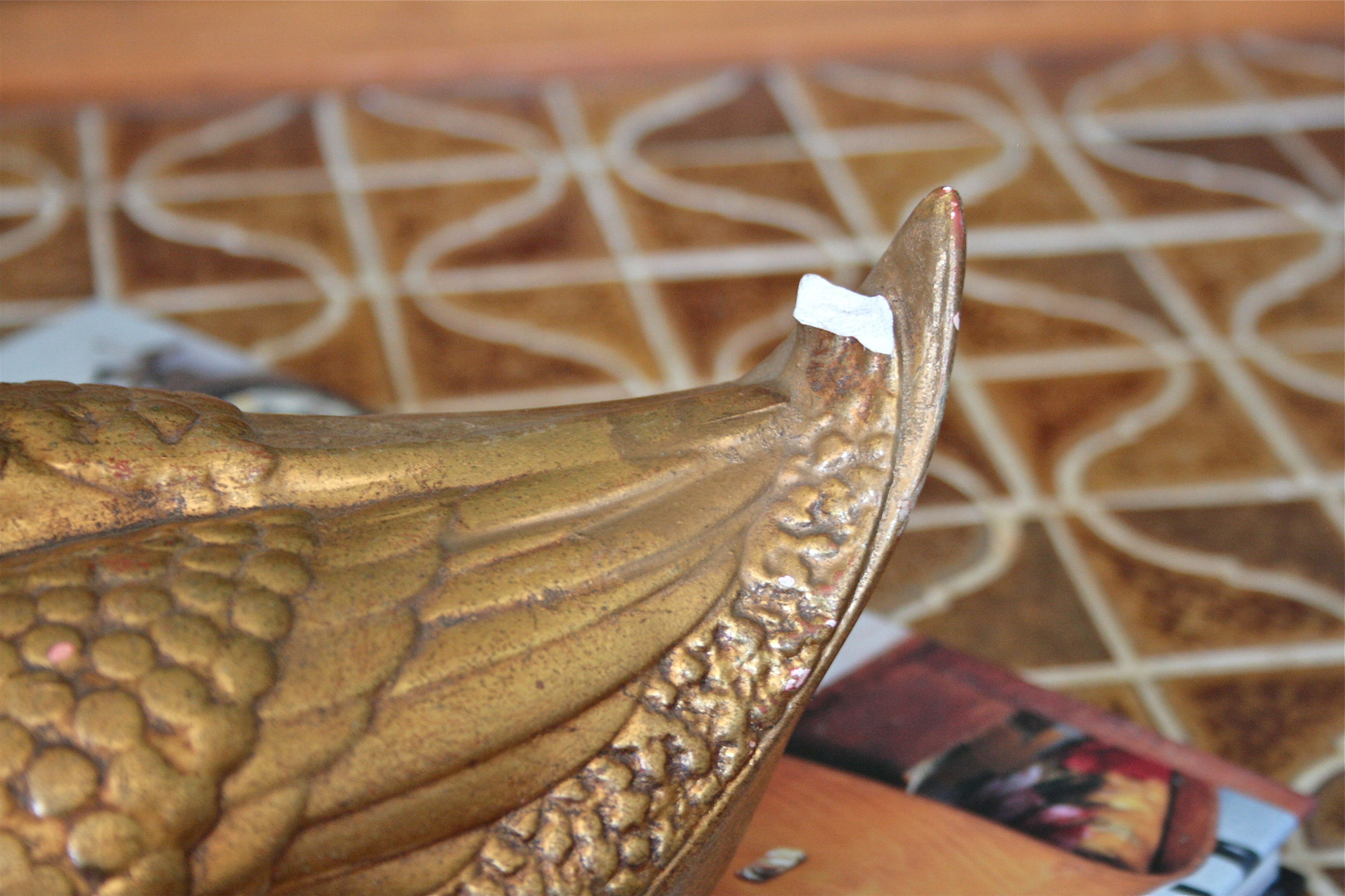 When I say she’s “a little worse for wear,” you may have already noticed the piece missing from her tail feathers. There’s a pretty sizable chunk broken off and, since I don’t have the piece, there’s really no way to fix it. I’m hoping a new coat of paint will mask the issue.