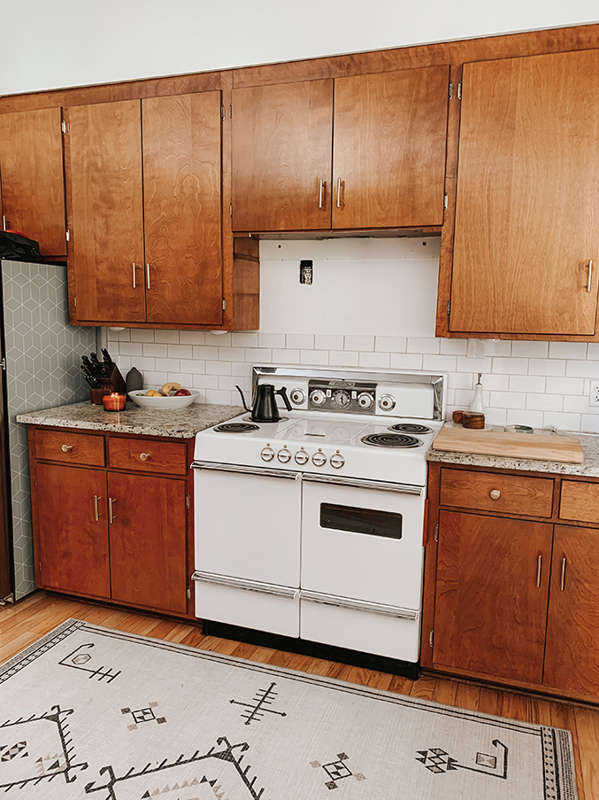 I actually really adore the cool blue color (reminiscent of the new minty painted backsplash in the kitchen), and the intricate wood details in the glass panels are just gorgeous, not to mention in terrific shape. I love that it’s on wheels and even comes with a tiny little antique key that actually works to lock the cabinet shut.