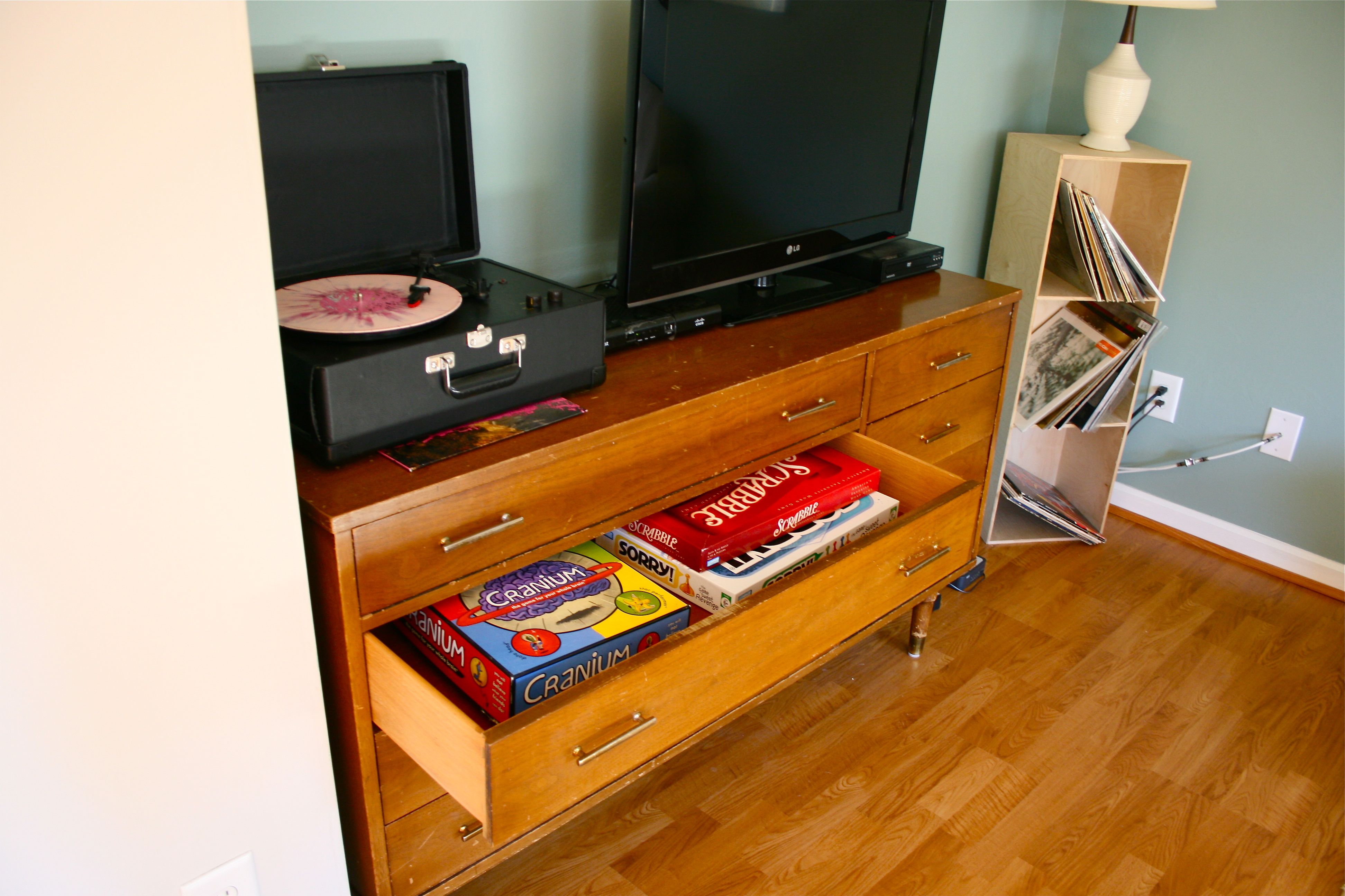 I love that it now houses not only the television, but the record player too!