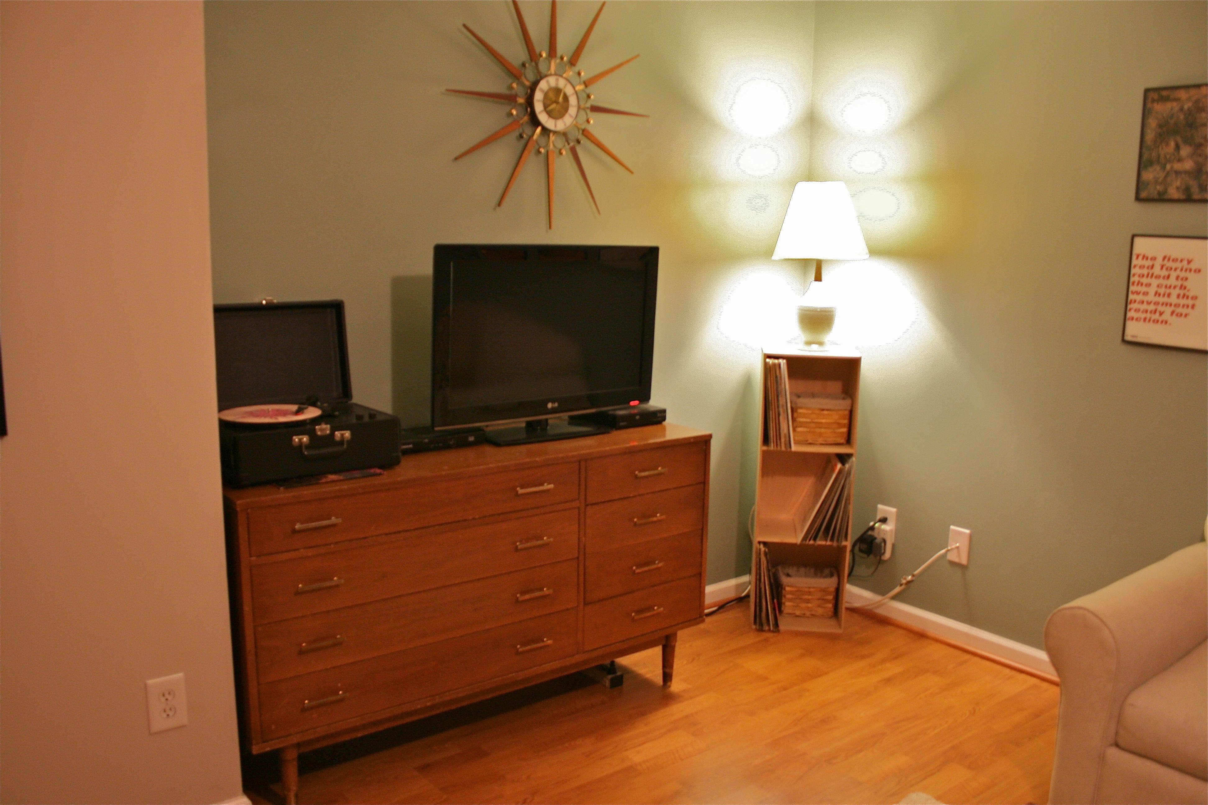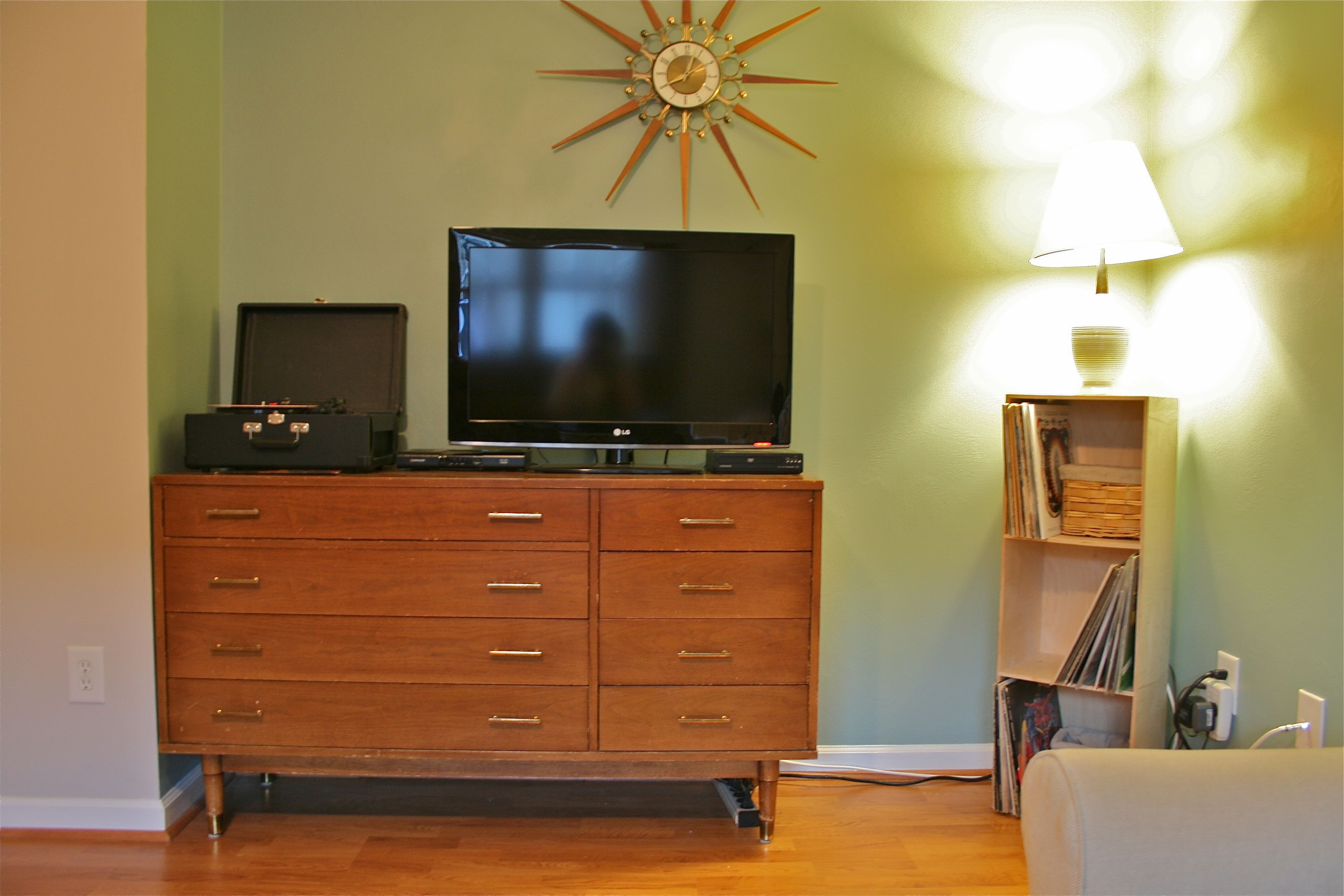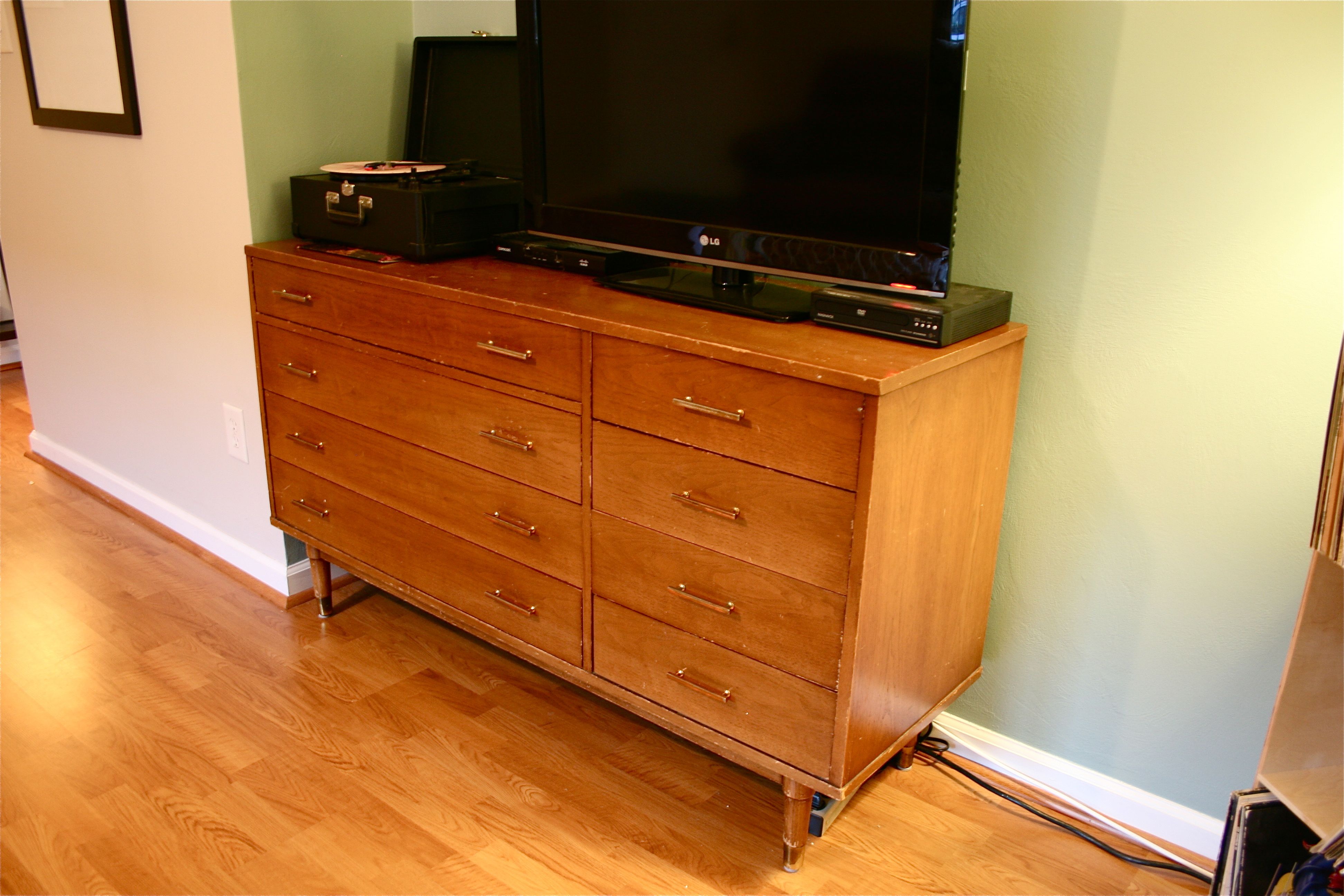 It would be absolutely positively PERFECT if the top set of drawers weren’t there…I think the problem is that it’s meant to be a dresser, not a sideboard. But it certainly has the look we are going for. I know there’s probably a way to saw off the top row and replace the table top on the third set of drawers instead of the fourth, but honestly it’s something I can get used to over time and we can always use it as a guest room dresser in the future if we find something better for the TV.
