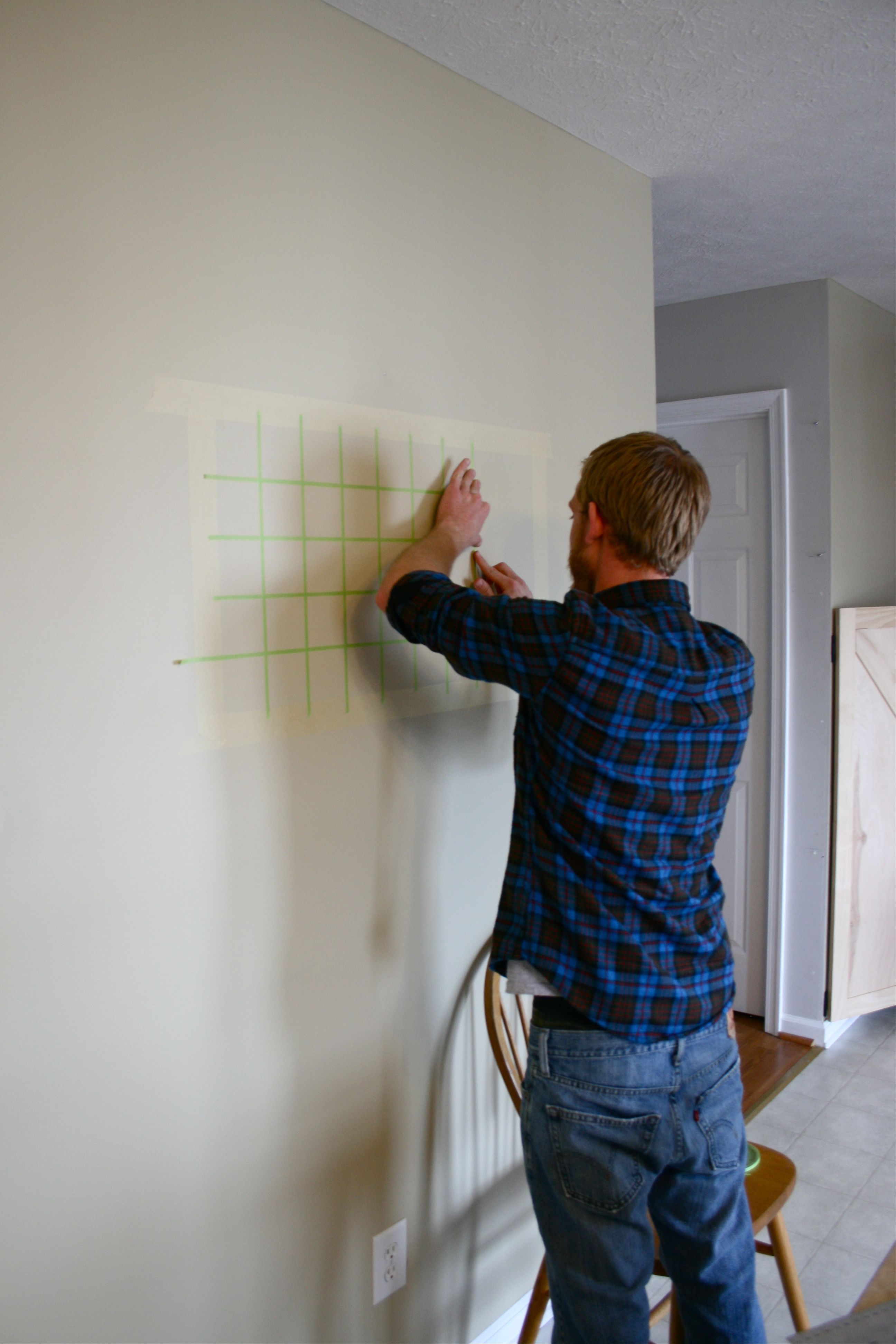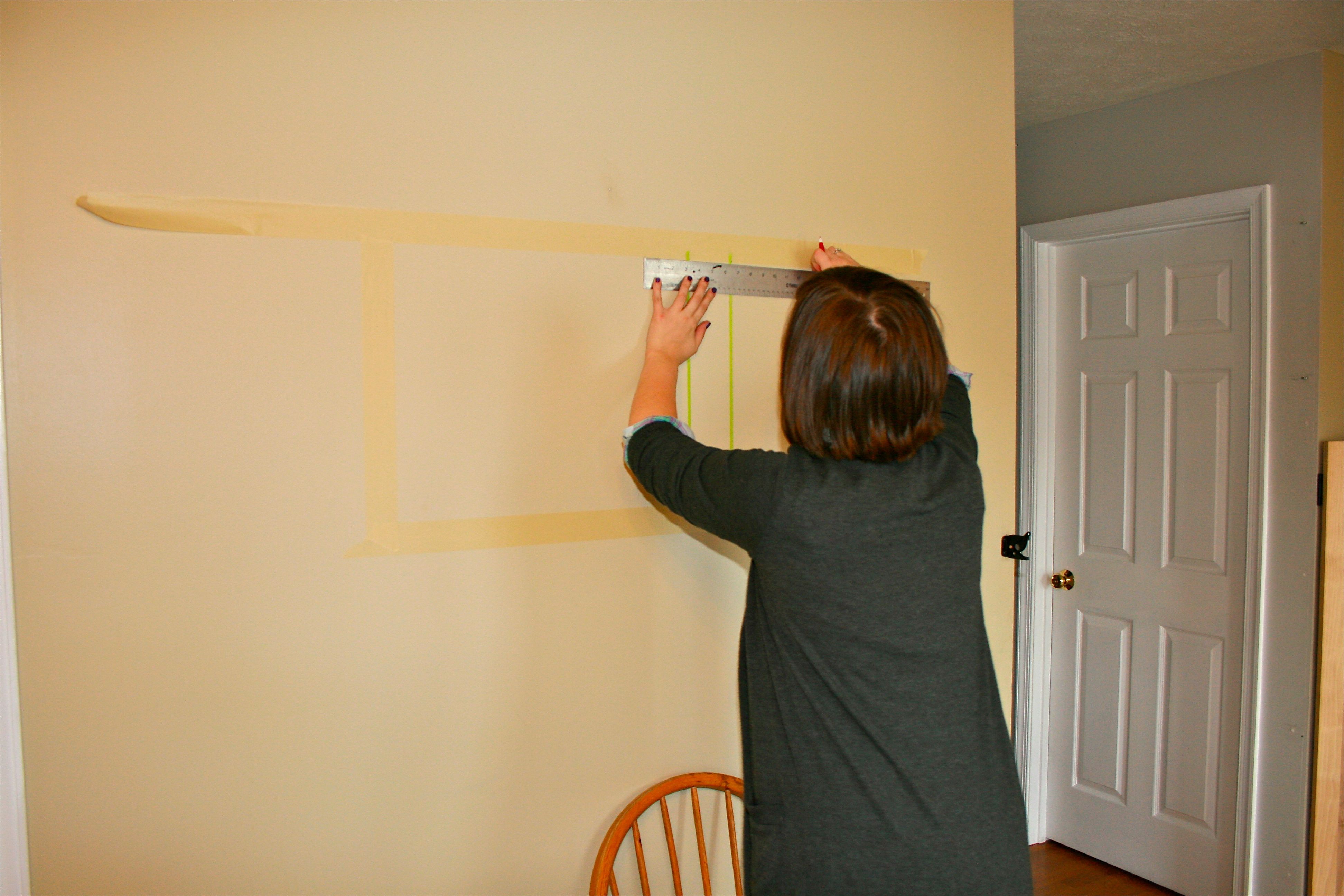 We masked the whole thing out in the thick masking tape, using the level to make sure our lines would be straight. Then we started putting in the vertical thin lines by making pen marks every 3″ on the top strip of thick masking tape and then again on the bottom strip. Doing two marks meant that all I had to do to make the thin line straight was to line up the top with the mark on the upper thick tape and the bottom with the lower thick tape – No wonky/crooked lines!!!