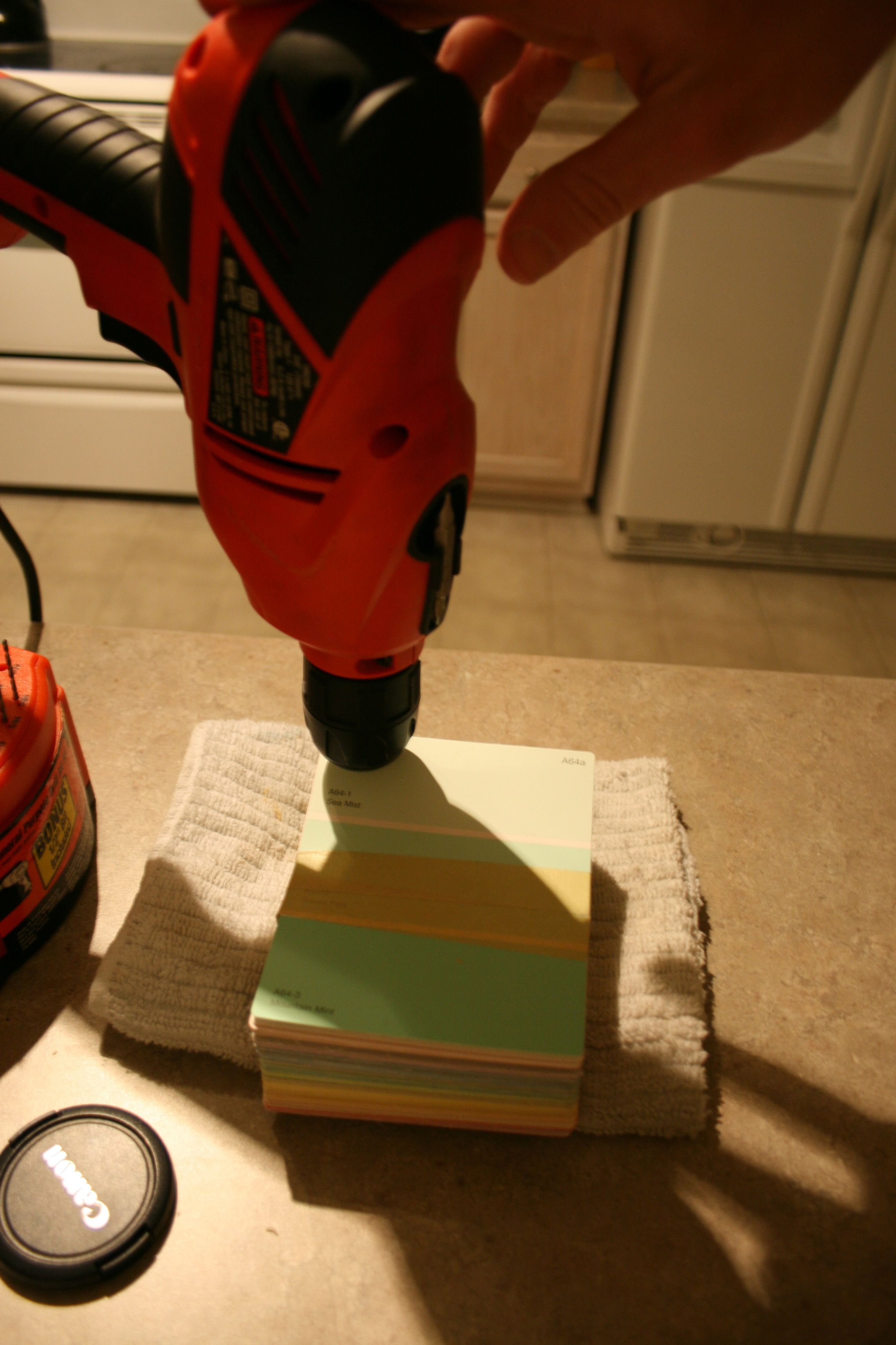The rest of the project was as simple as using masking tape to hold the stacks well-packed together and grabbing a drill to put a hole through the one of the upper corners. Like this: (although I would recommend using a piece of wood to drill on instead of a folded towel – There’s definitely a small divot in the counter top now…)