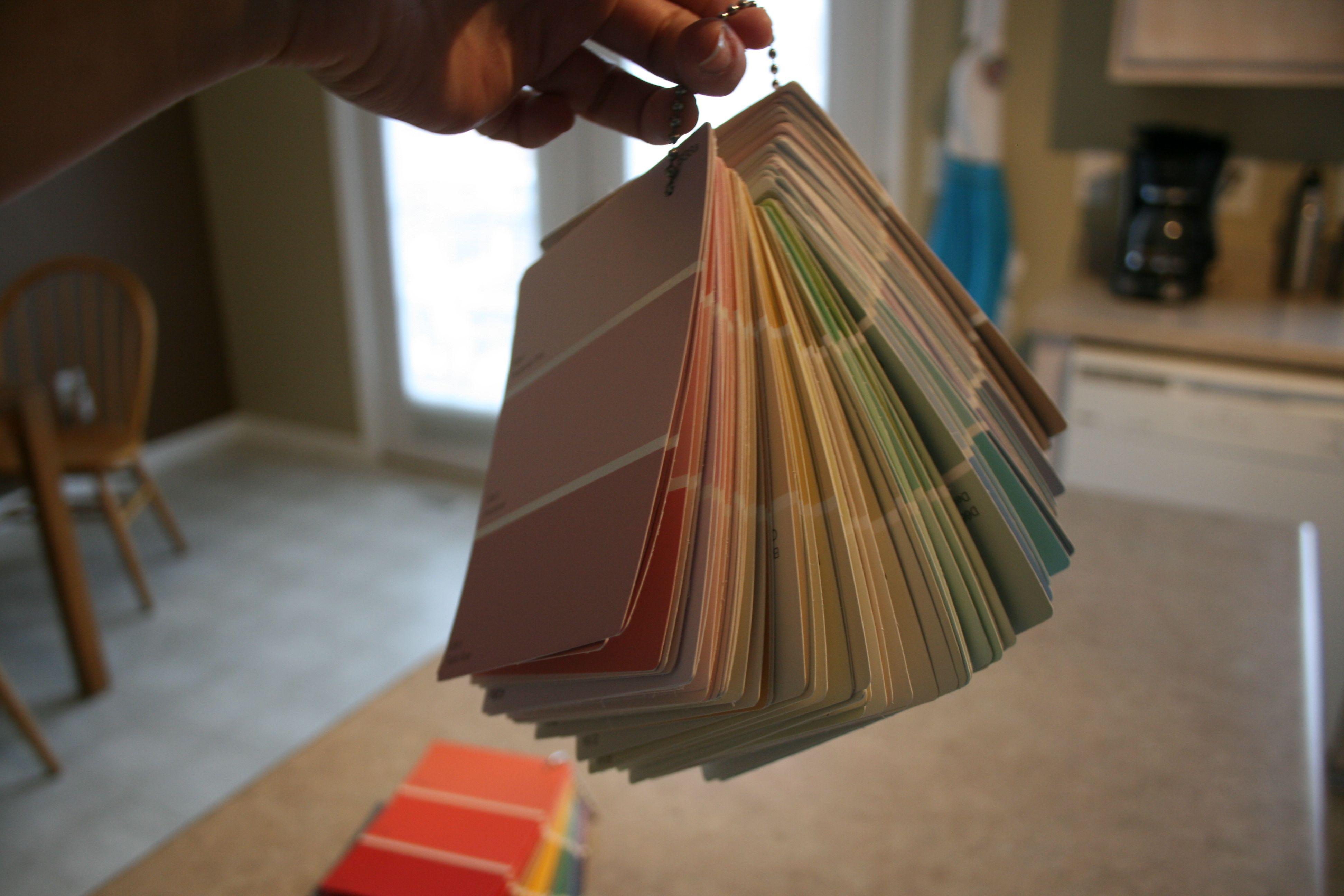 But all of this paint had us spending a lot of time driving back and forth to Lowe’s – Thankfully the nearest one is about a quarter of a mile down the road, so it’s not much of a hassle. But wouldn’t it be GREAT if we had all of those gorgeous paint chips at our disposal so that we only had to make ONE trip to pick up paint (as opposed to one to get the paint chips, bring them home, decide and then go back out to get it mixed)? Sure would be nice if we had one of those paint chip booklets they make…