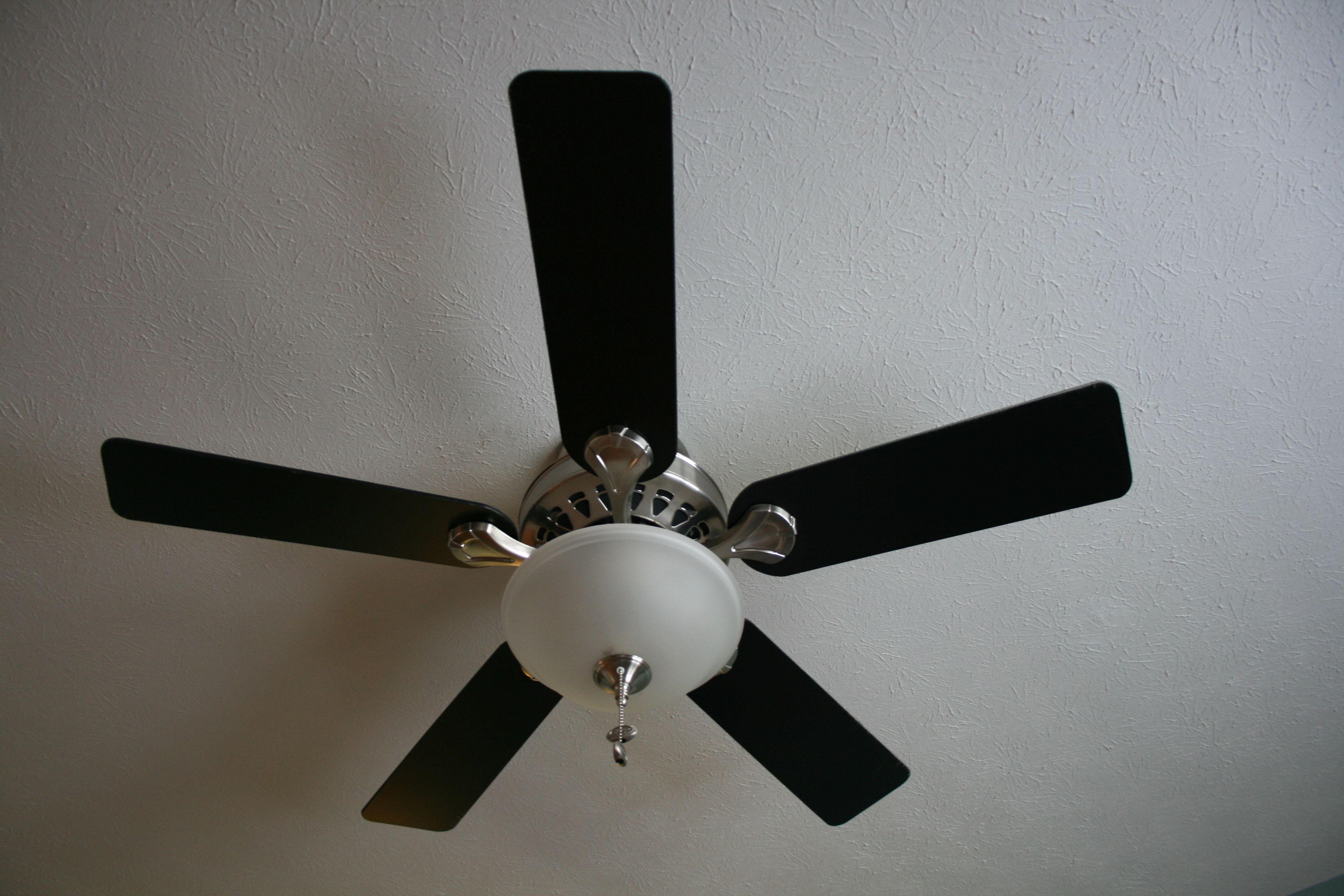 So we decided to take it from the living room and put it in the upstairs master bedroom! The fan up there now is very plain – Just a white fixture that’s sort of “blah”. The black fan blades of the one we removed from the living room will go great with the dark grey walls and black-framed art.