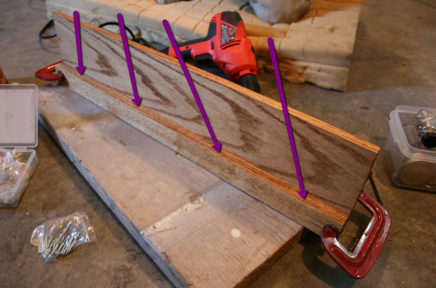 We hadn’t actually started the drilling yet in the photo below, but imagine the holes for the 3″ screws being where the arrows are pointing: