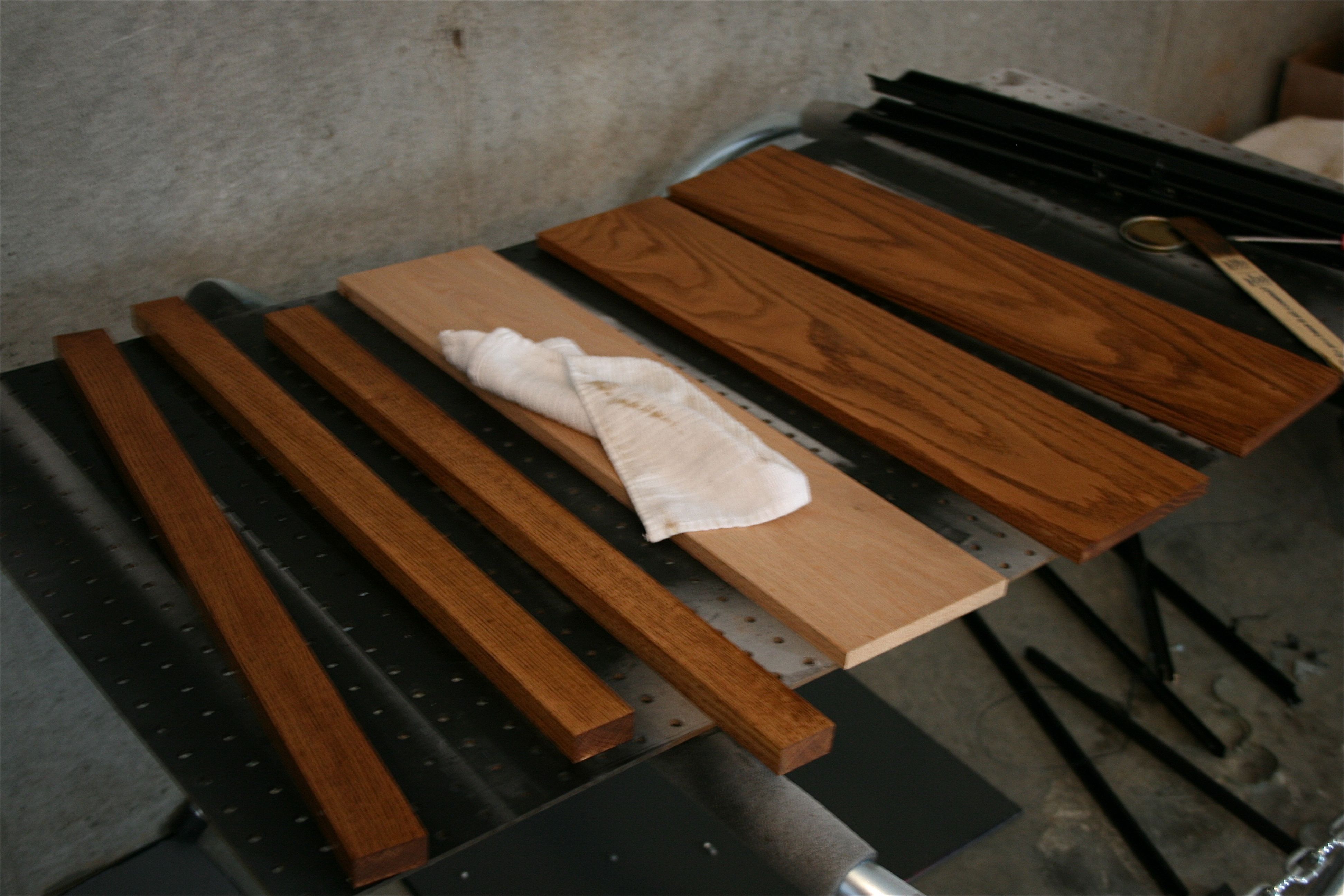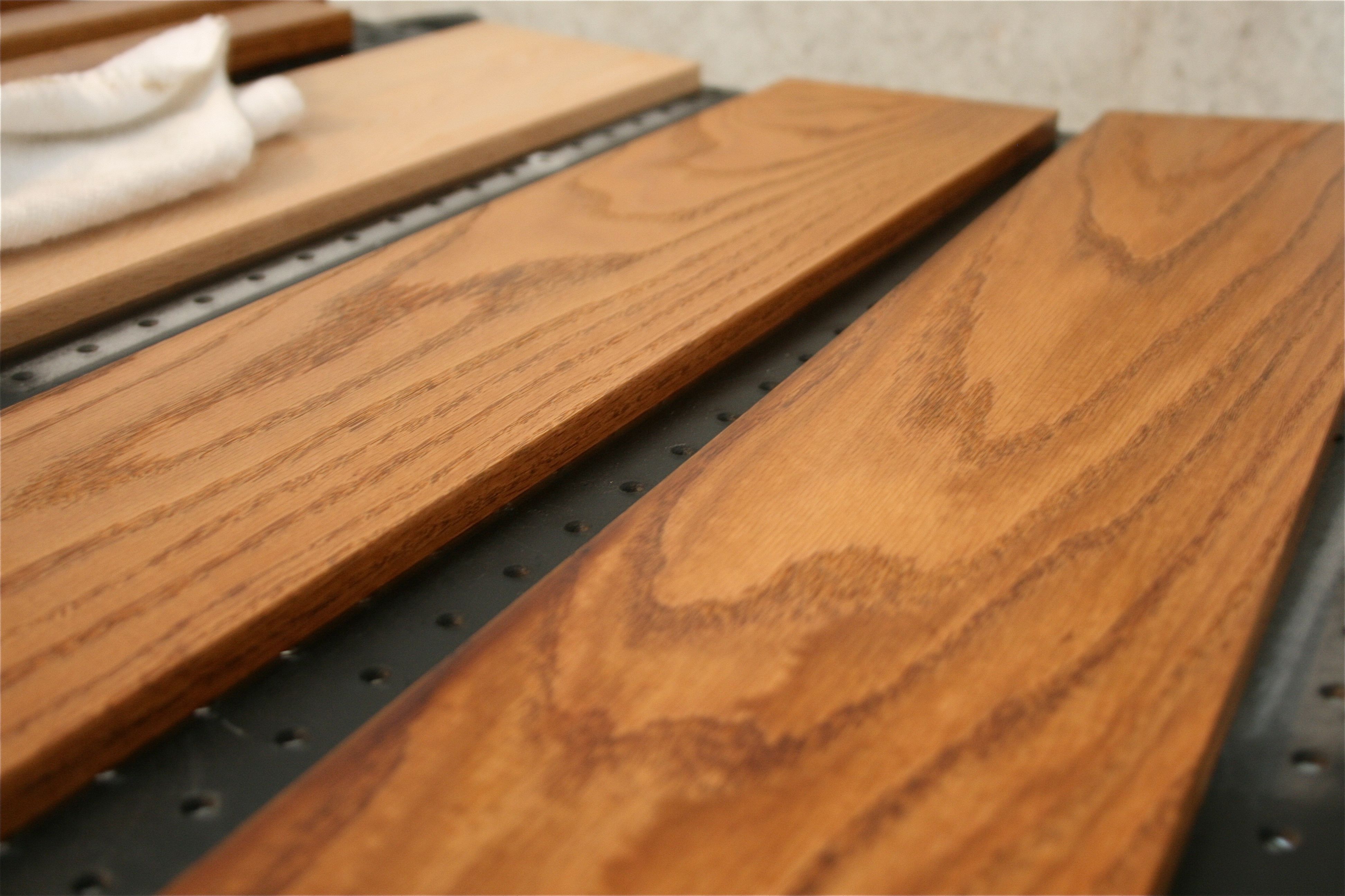 I wiped off the excess a couple of minutes later and got a beautifully rich coat. You can really see how the stain brings out the grain in the wood when you compare the dark ones to the unstained board in the middle.