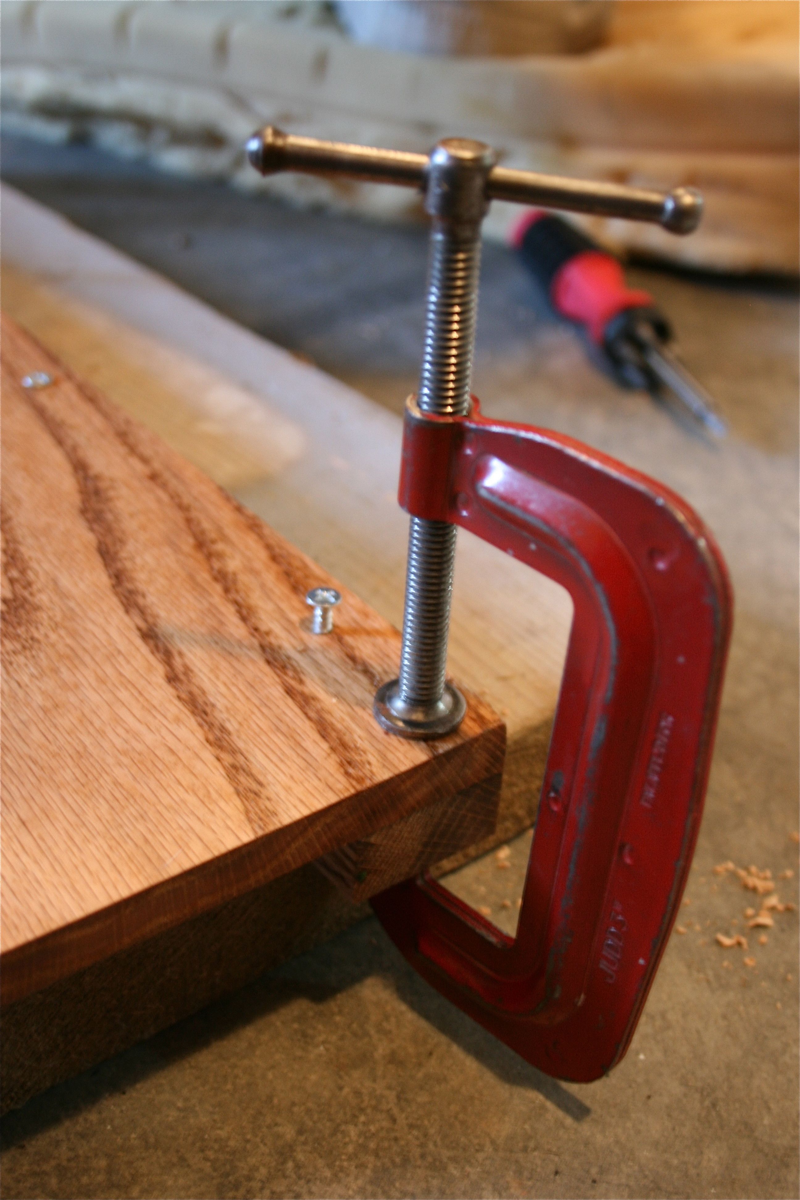 We took one thick “shelf board” and one of the thin “ledge boards”, clamped them together with a couple of “C” clips and pre-drilled four holes through the top of the “shelf board” into the “ledge boards”. If you try this at home, be careful not the drill all the way through because you’ll be able to see the holes when standing beneath the shelves.