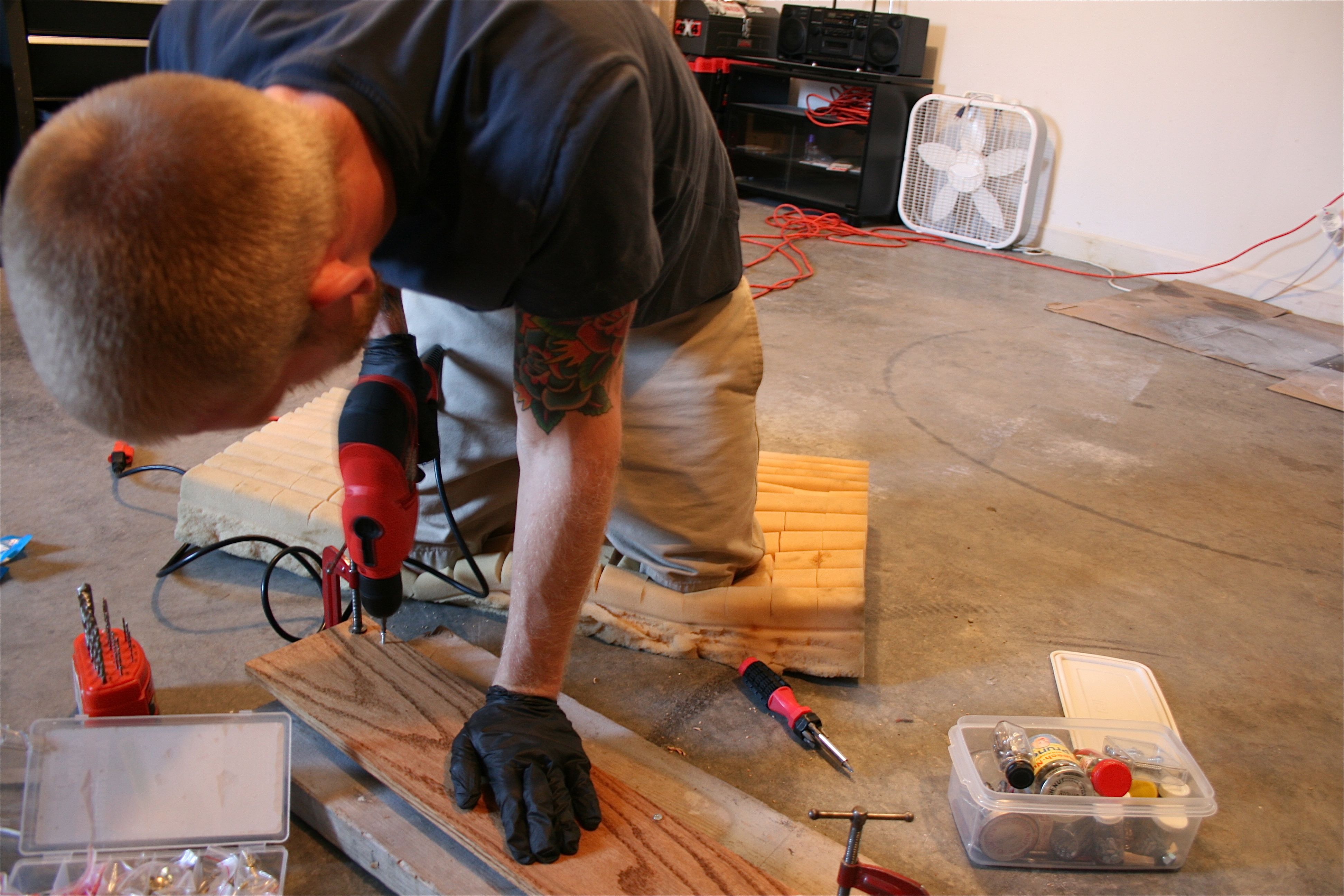 Once they were done and mostly dry (you know I can’t wait long enough for them to dry completely – thus the black rubber gloves John’s wearing in the rest of the pictures), we got to drilling the holes for the screws.