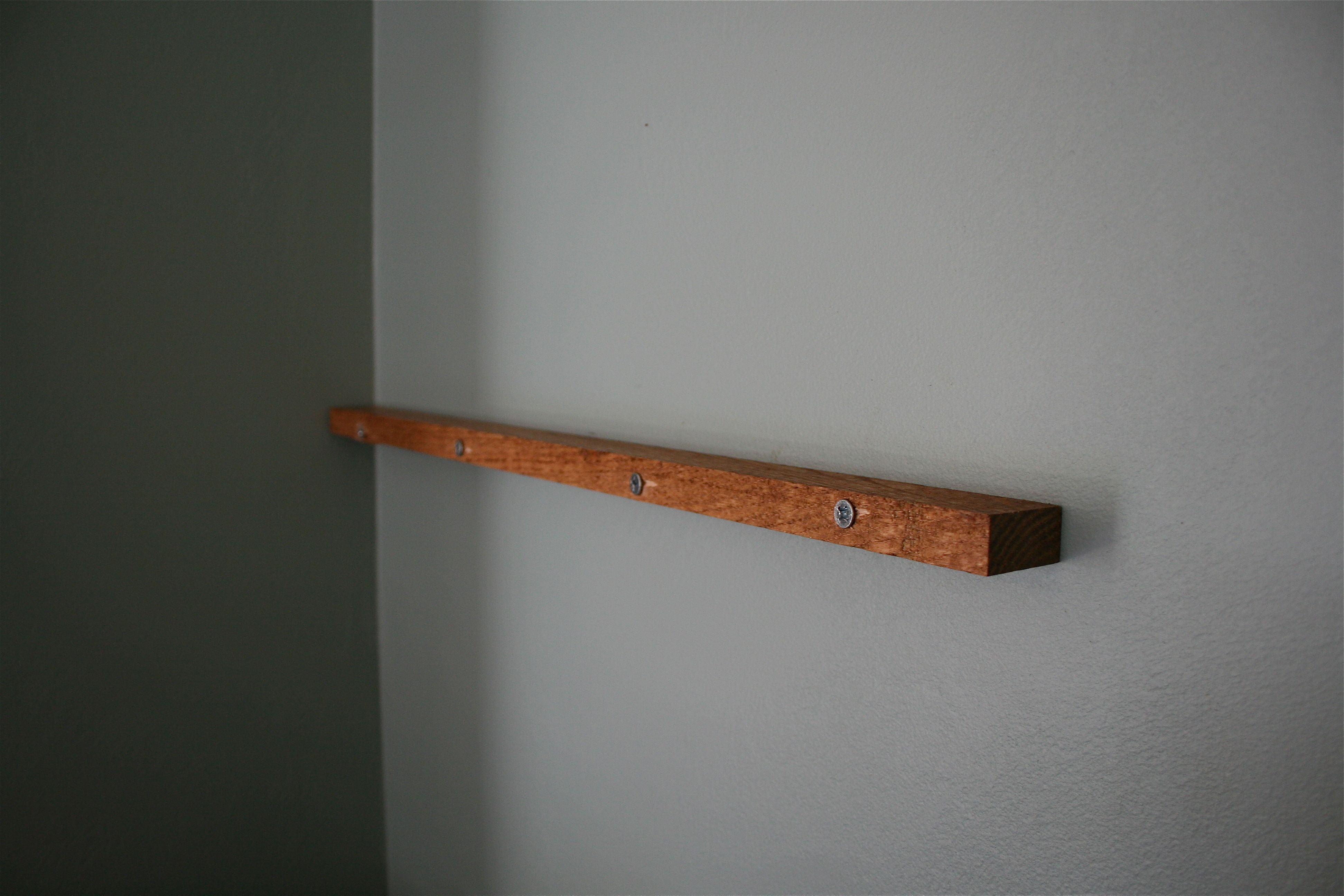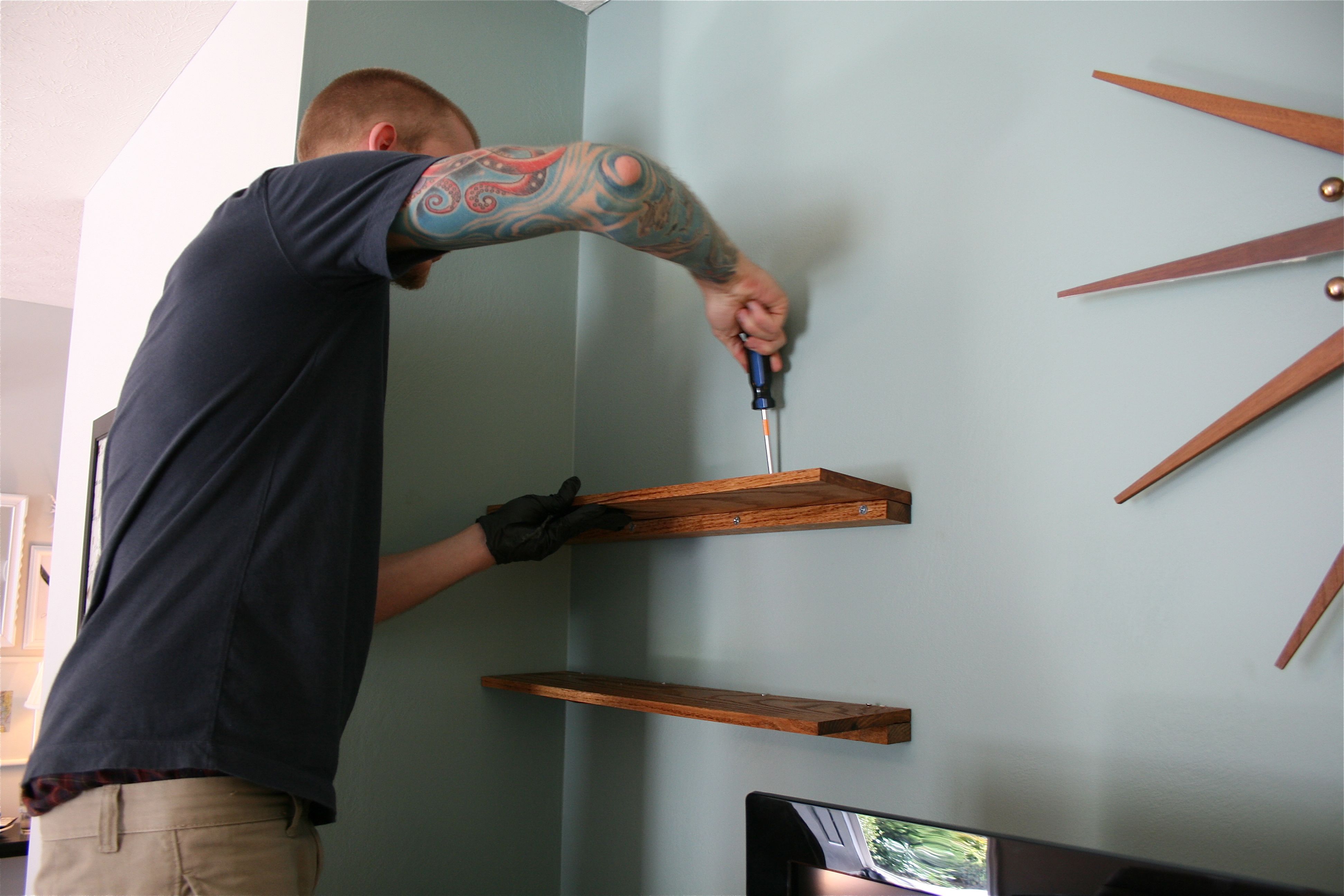 Then we screwed the “shelf board” on top of the “ledge board” using short screws and the pre-drilled holes we made on top. We had to do this by hand with a skinny manual screwdriver since the holes were so close to the wall – The big electric drill wouldn’t fit…But given the choice, it was MUCH easier to screw the short screws in by hand then the long 3″ ones.