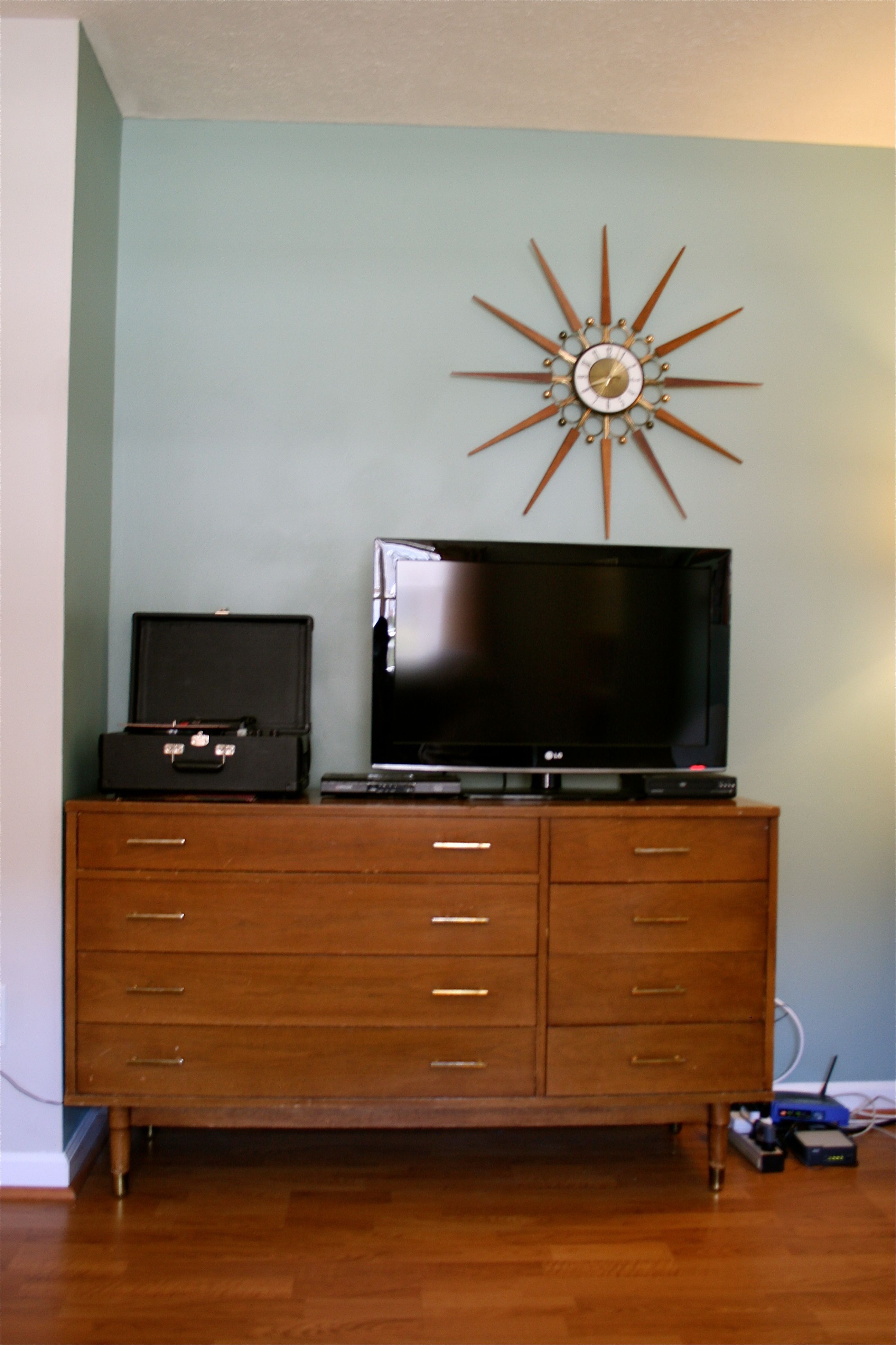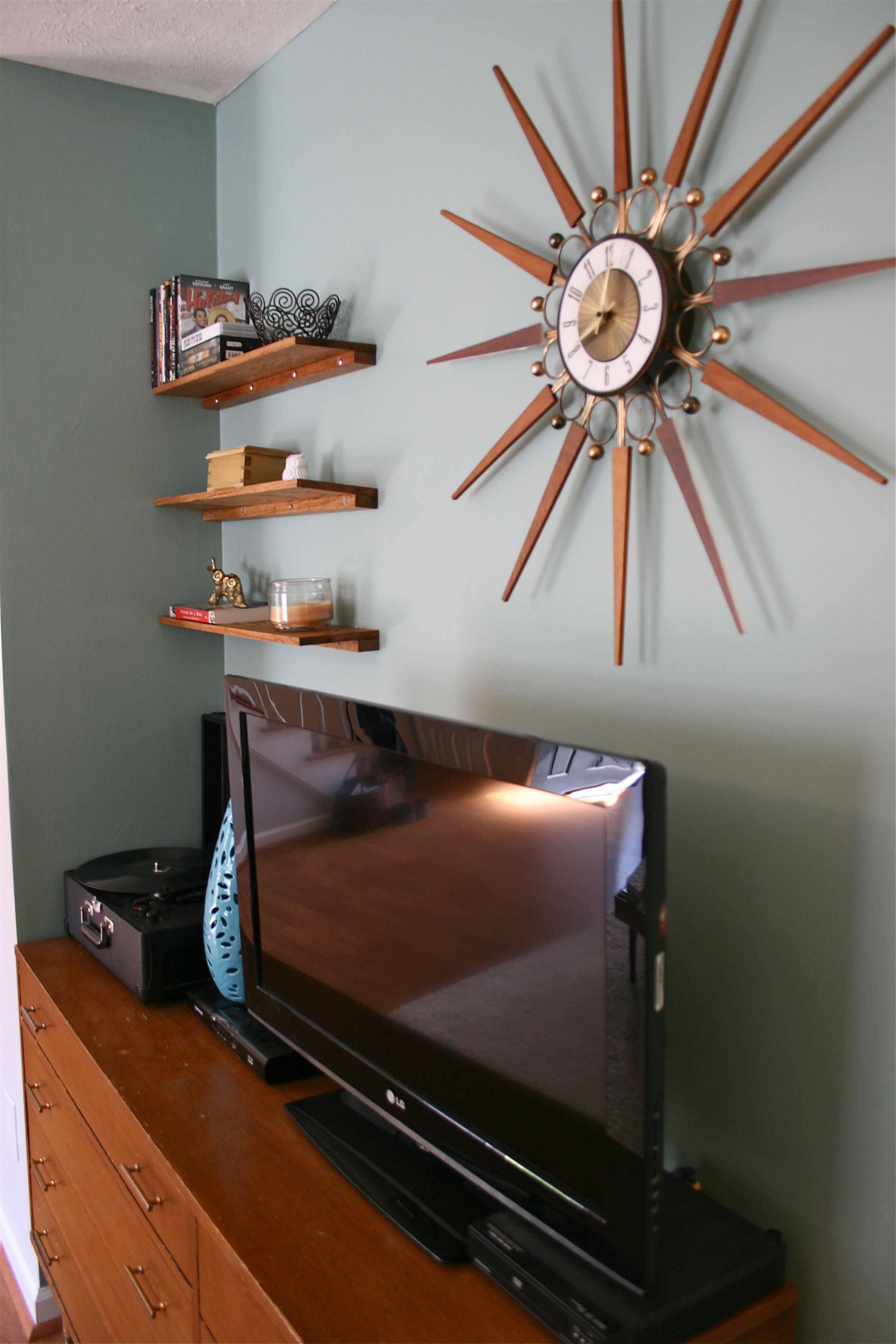 We love the asymmetrical look and it seems to finally finish off the TV stand wall. John and I both agree that next time we’d measure out the screws more evenly…But live and learn! I might try some more wood-photocopying magic (like I did with the clock “faux spokes”) to cover up the screw heads.