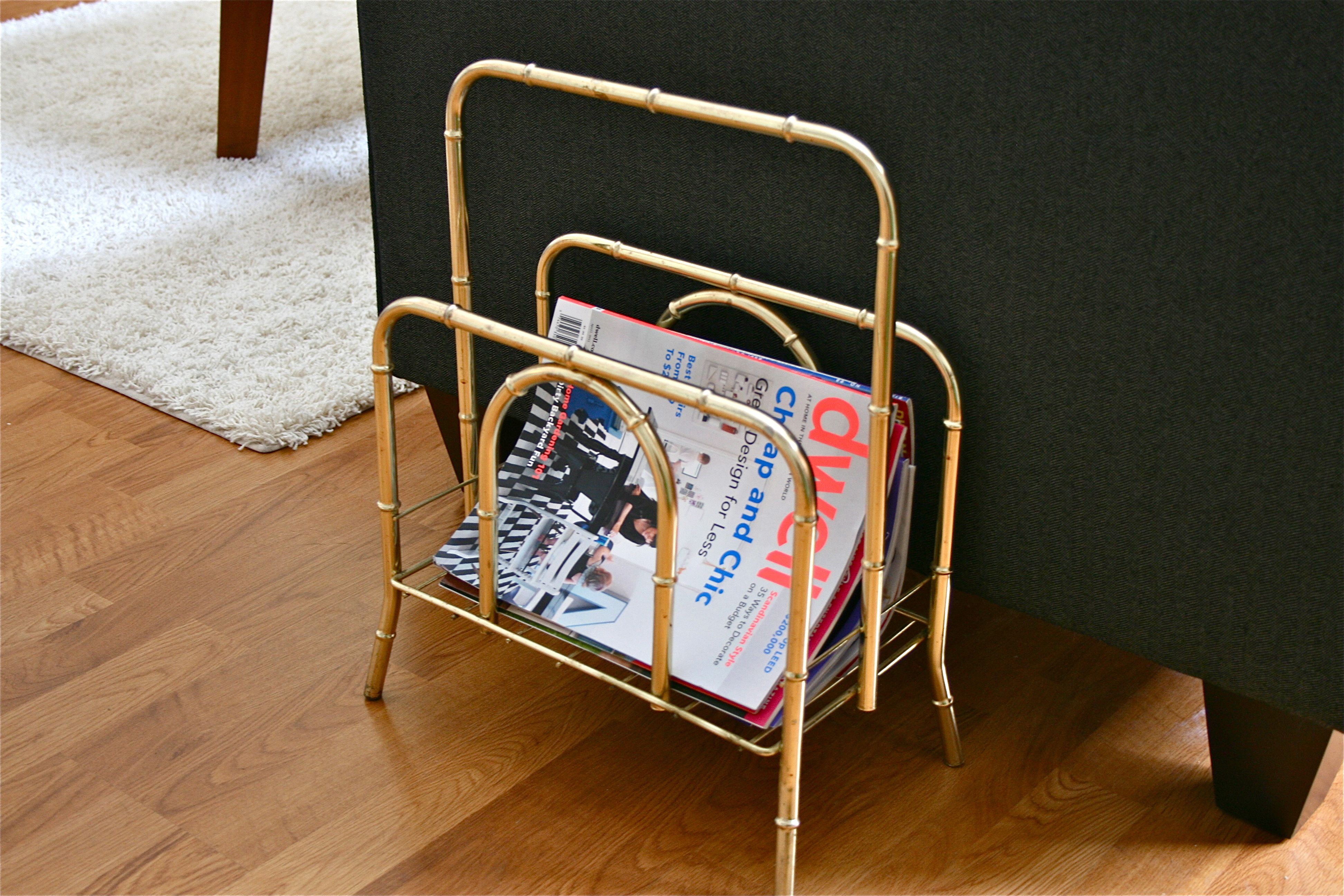 The first is a brass magazine holder that we placed next to the brand new sofa. It’s perfect for wrangling in our growing collection of car/motorcycle mags, furniture and accessory catalogs and various DIY home reno/redecoration monthlies.