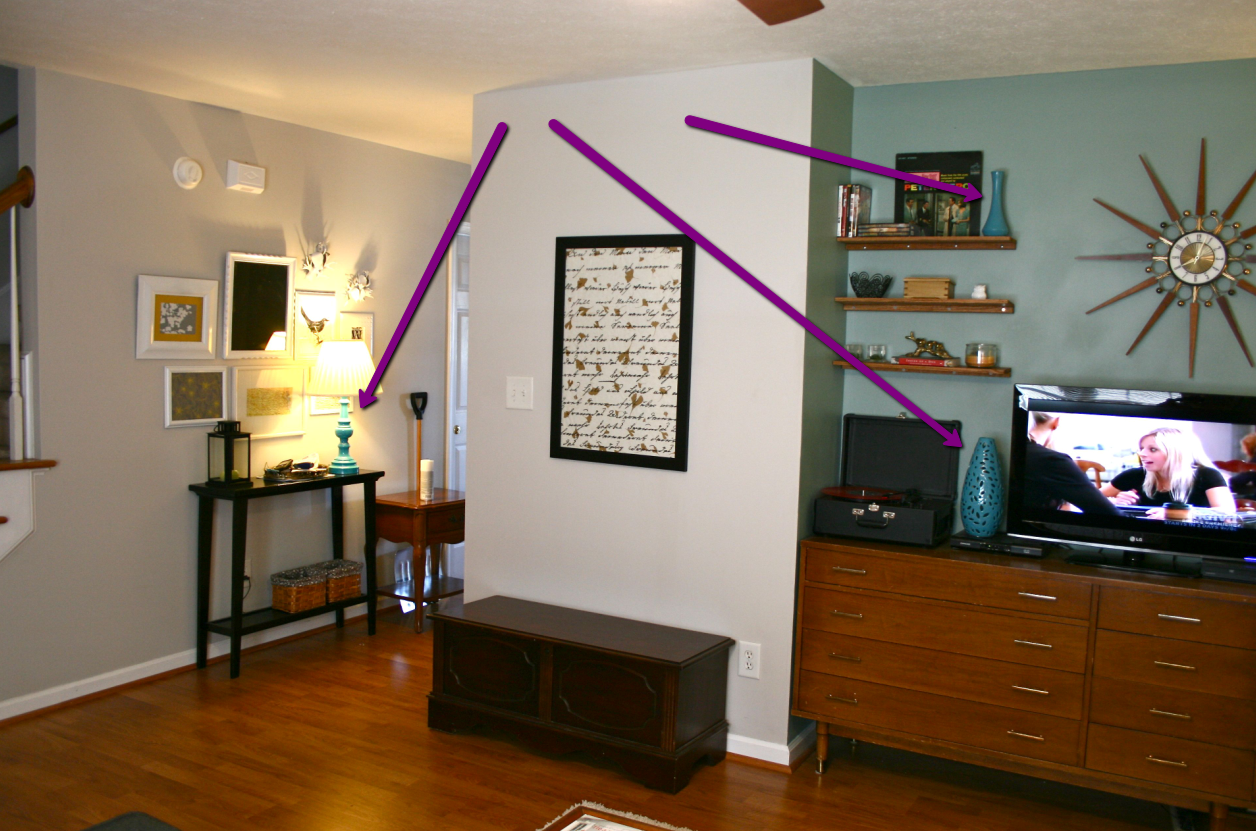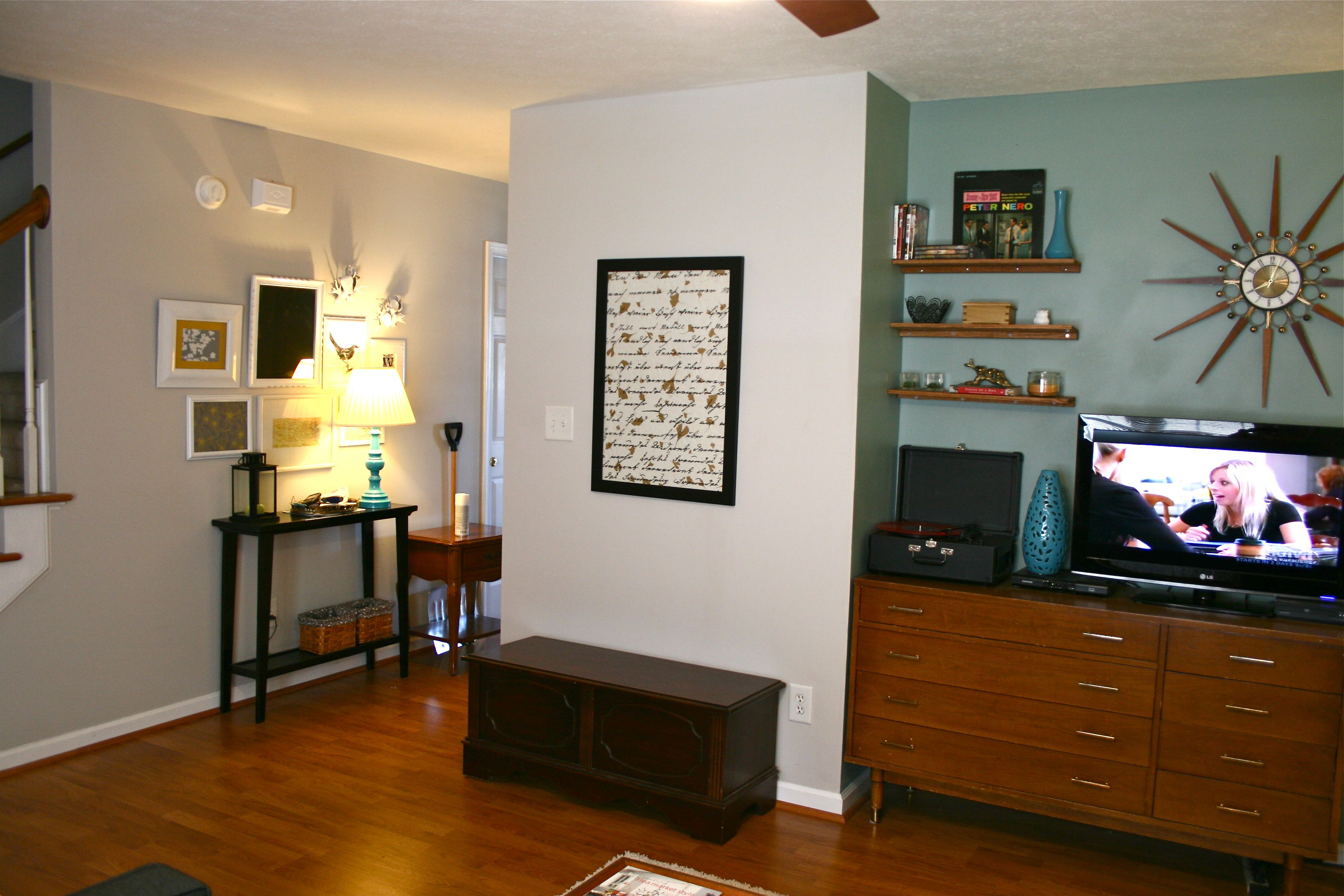 See that wall beside the television? The one that’s plain white next to the pretty pale teal one? Well, I couldn’t leave “well enough” alone and just HAD to revamp it into a focal point…