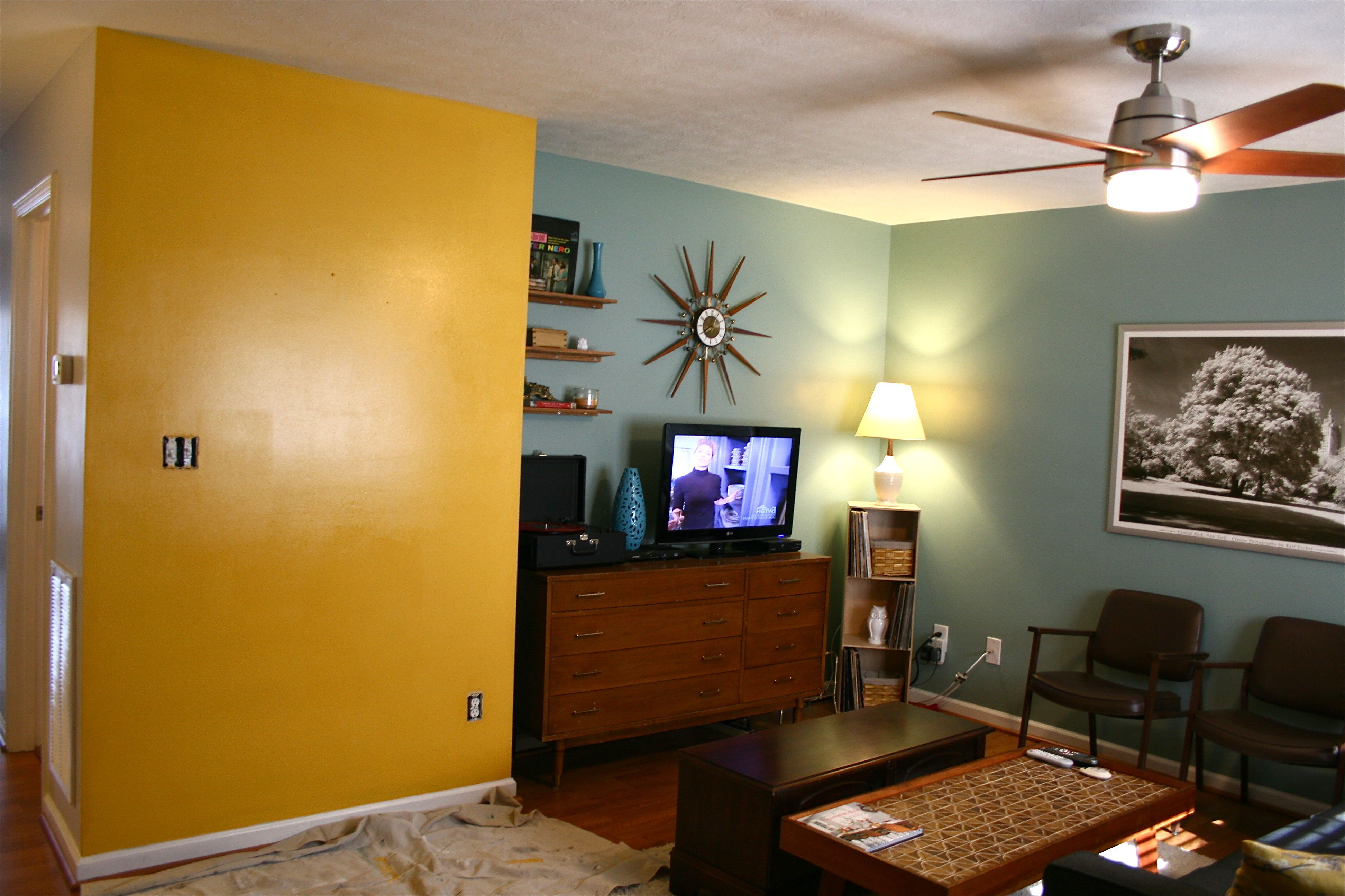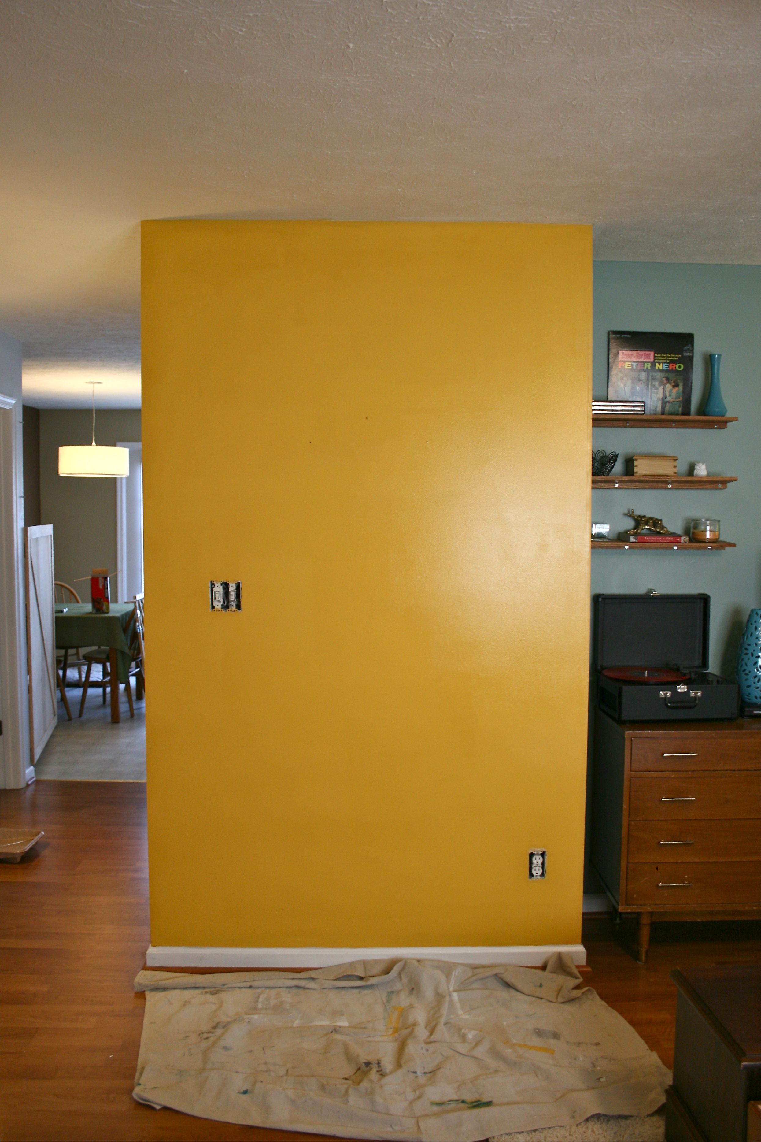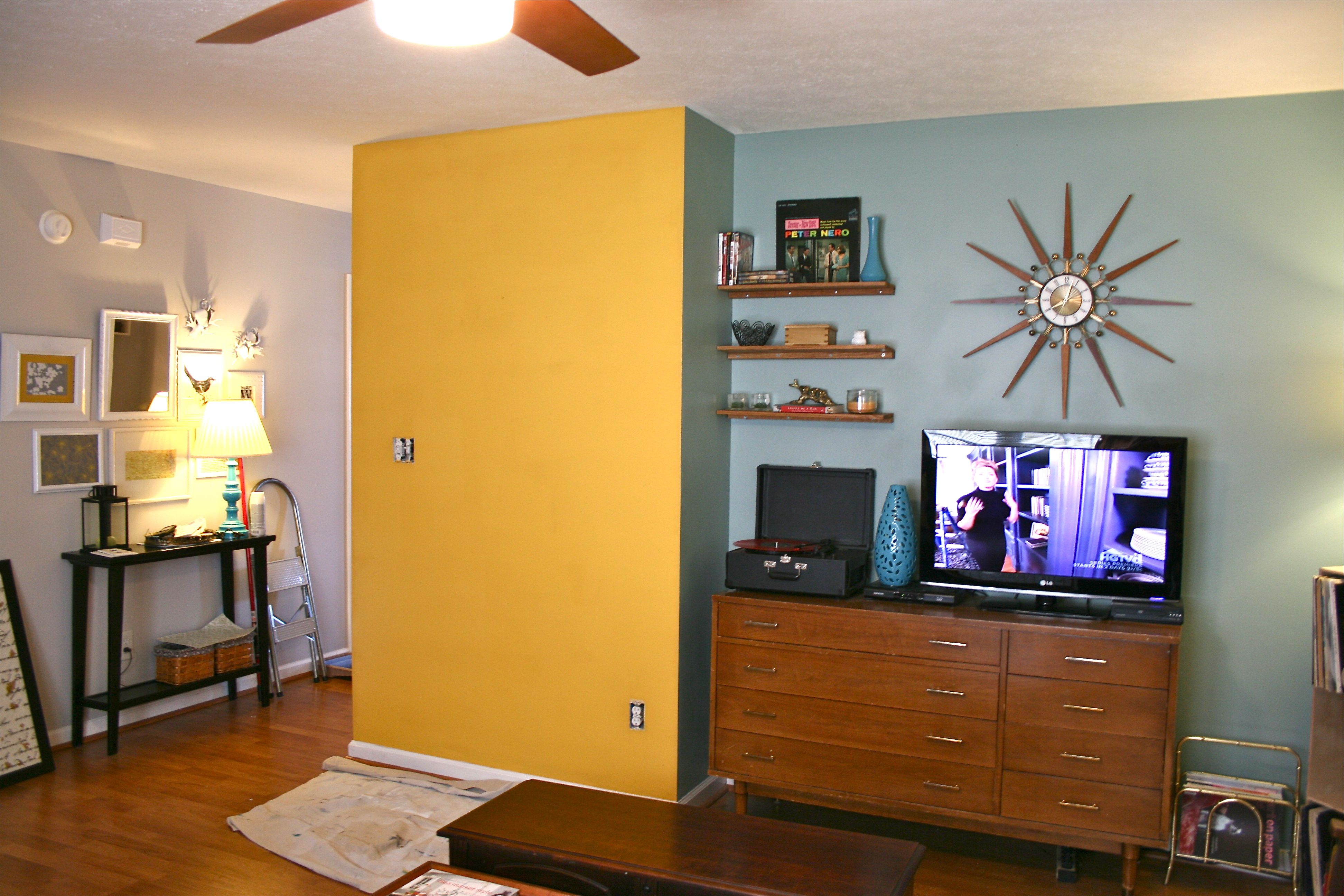 But the yellow just isn’t there…So, as I’m sure you’ve probably gathered by this point, I decided to paint the “jut out” wall by the TV stand a matching yellow to bring out our fully rounded color scheme.
