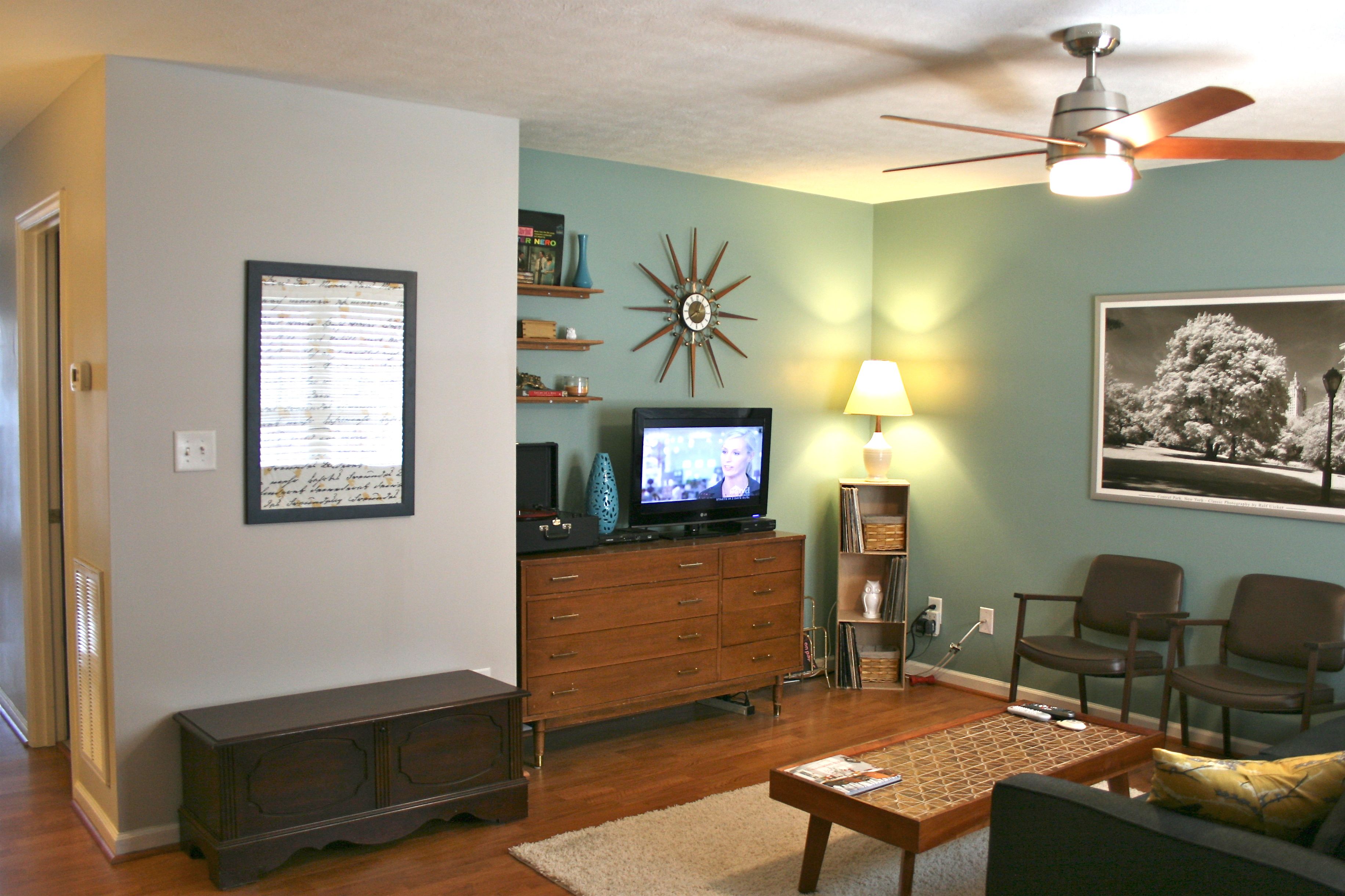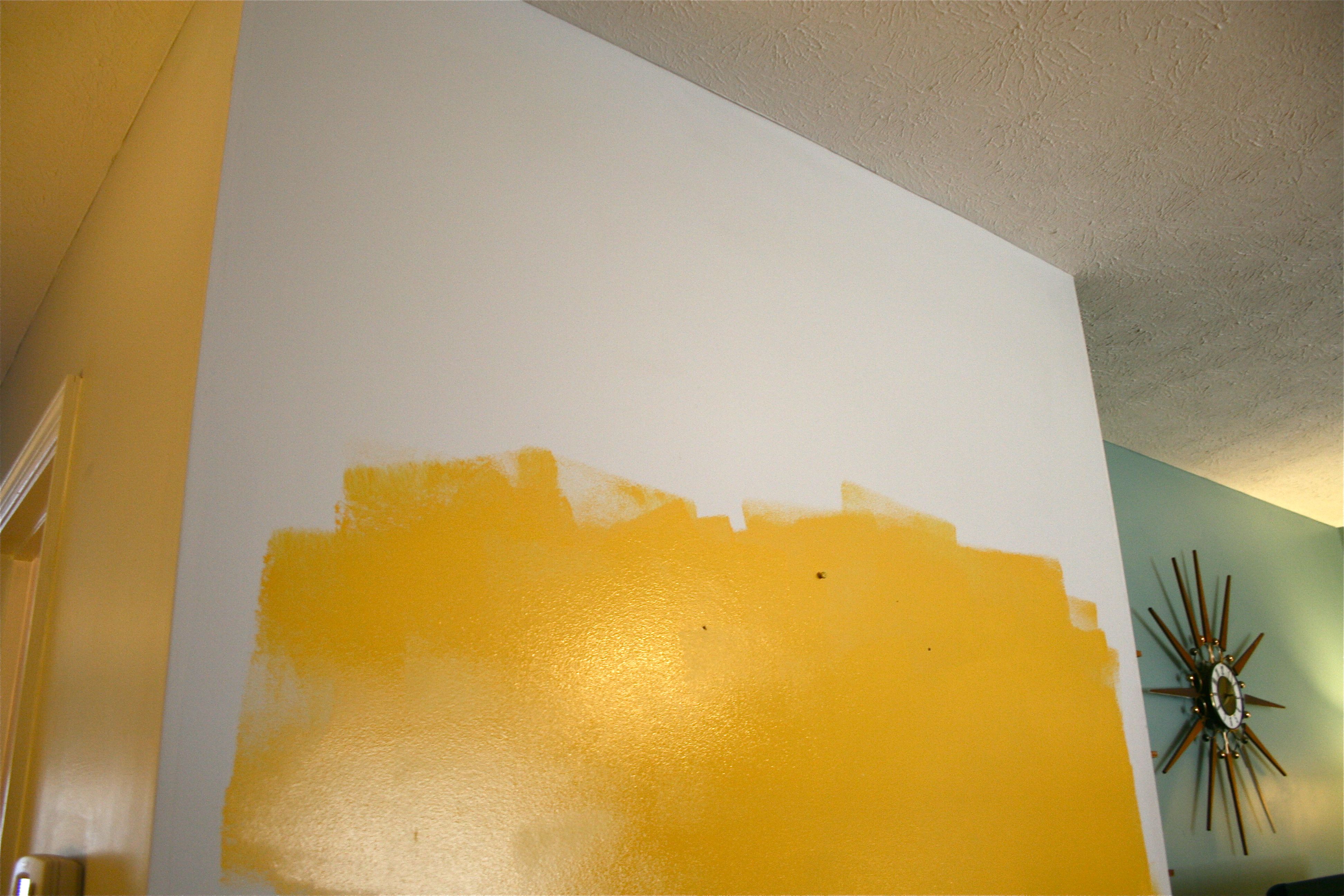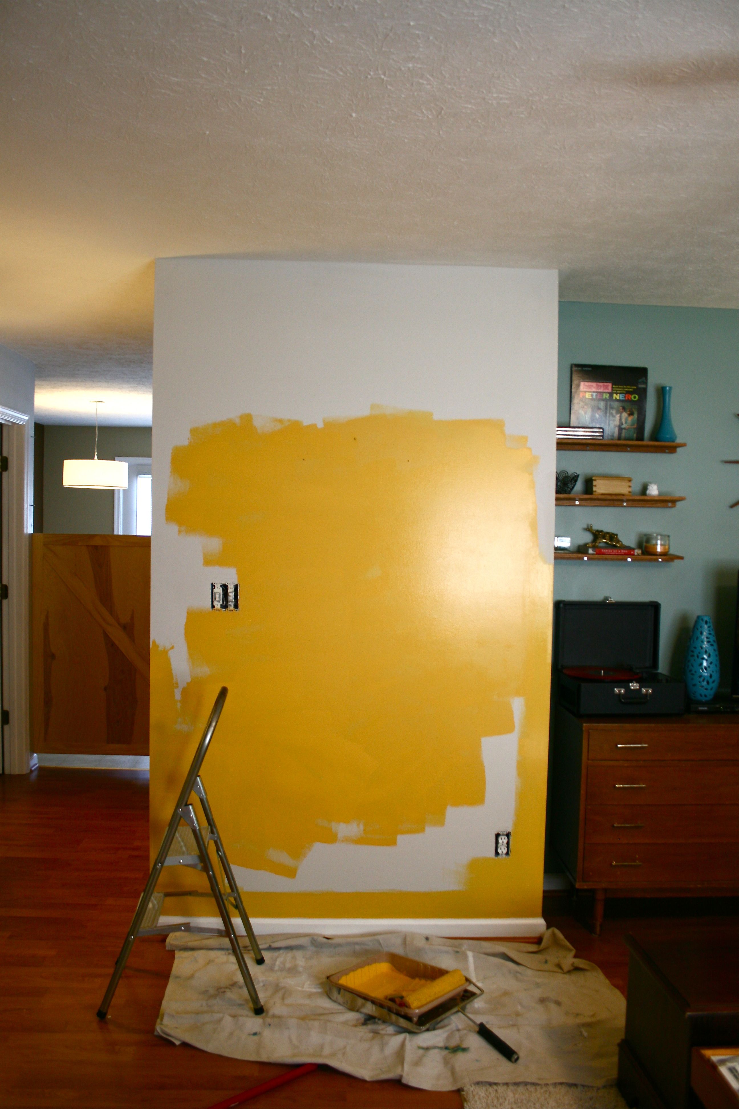 But the yellow just isn’t there…So, as I’m sure you’ve probably gathered by this point, I decided to paint the “jut out” wall by the TV stand a matching yellow to bring out our fully rounded color scheme.
