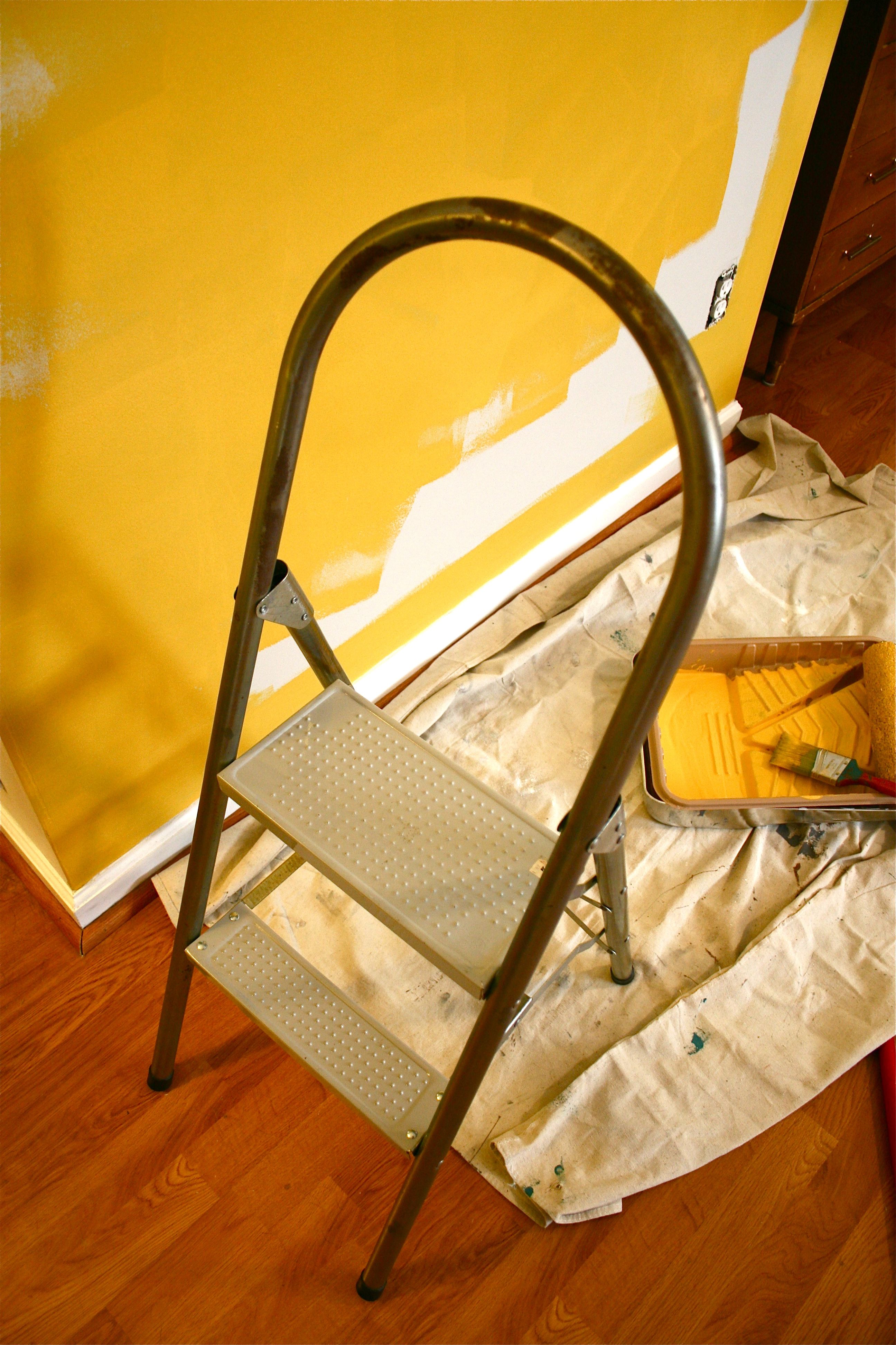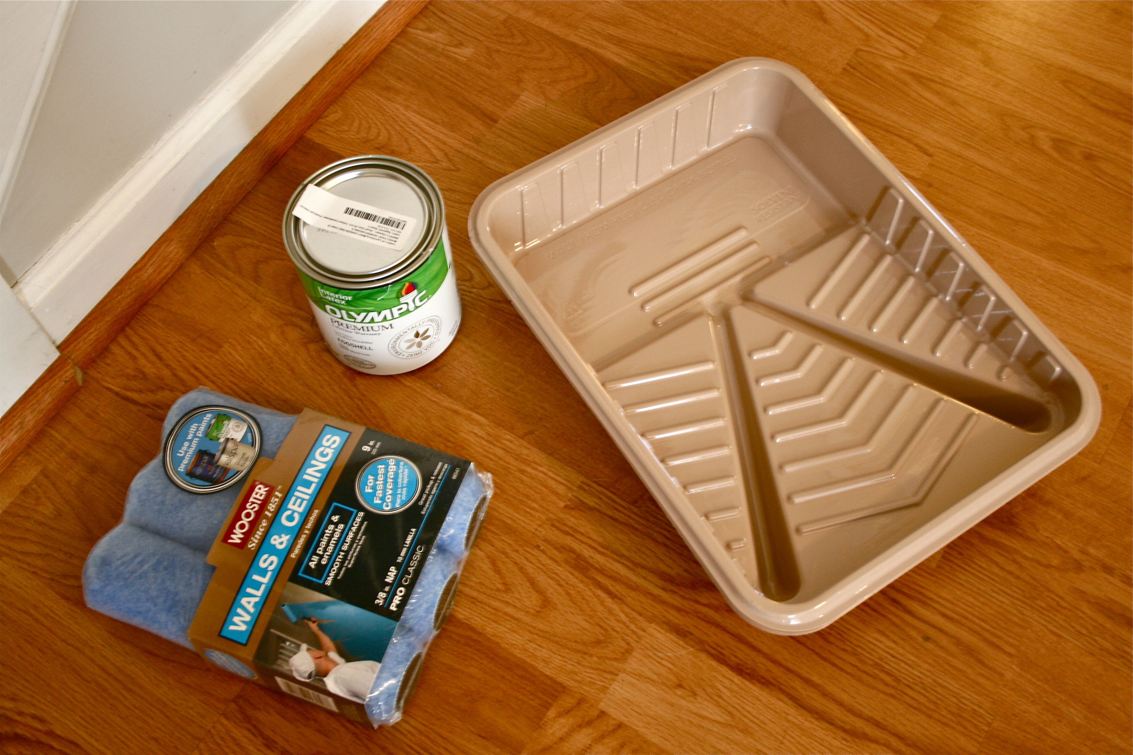 Off to Lowe’s we went (well we actually went twice because I forgot my paint swatch…) where we picked up a quart of Olympic no-VOC paint in “Yellow Coneflower”, some disposable paint tray liners and fresh rollers.