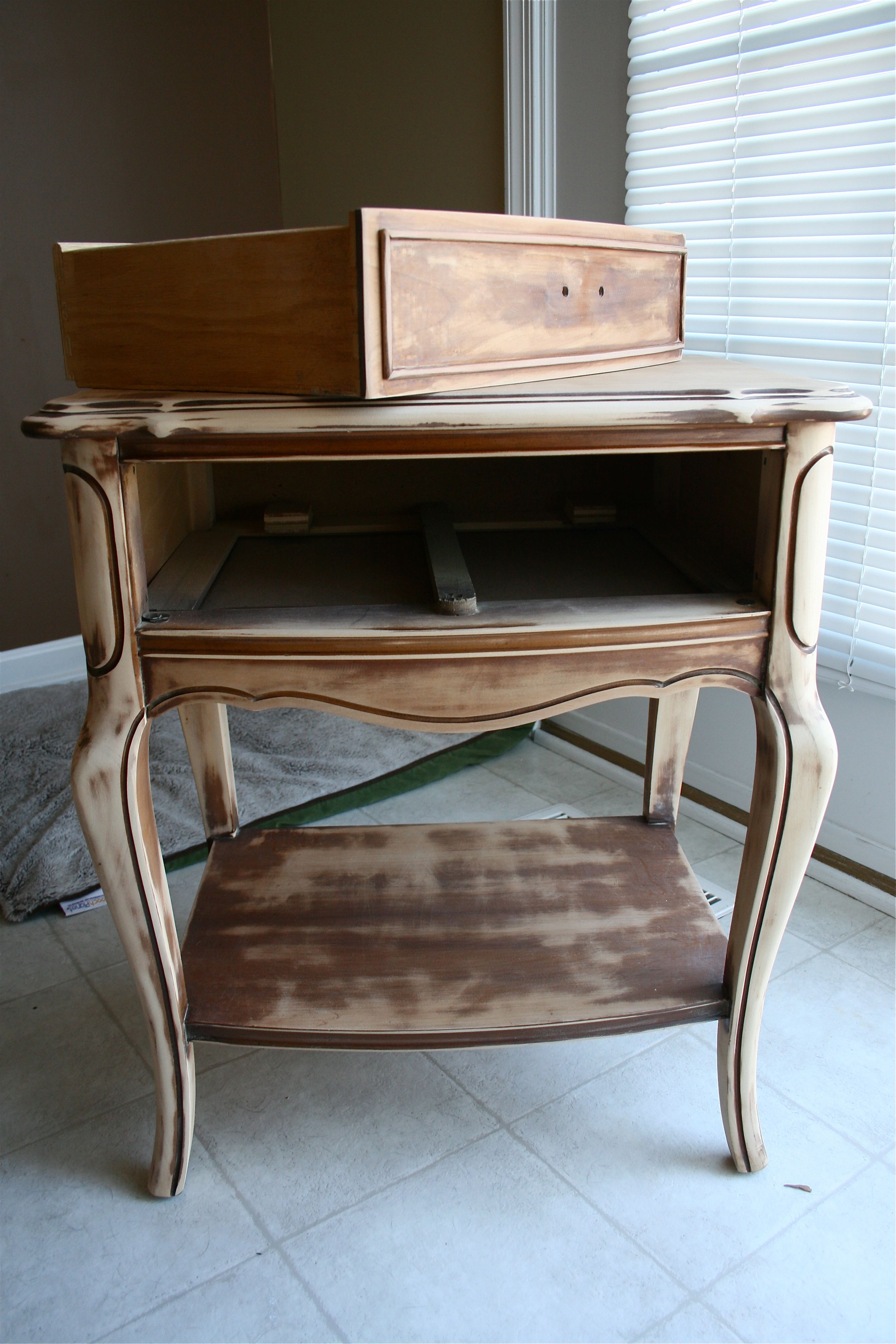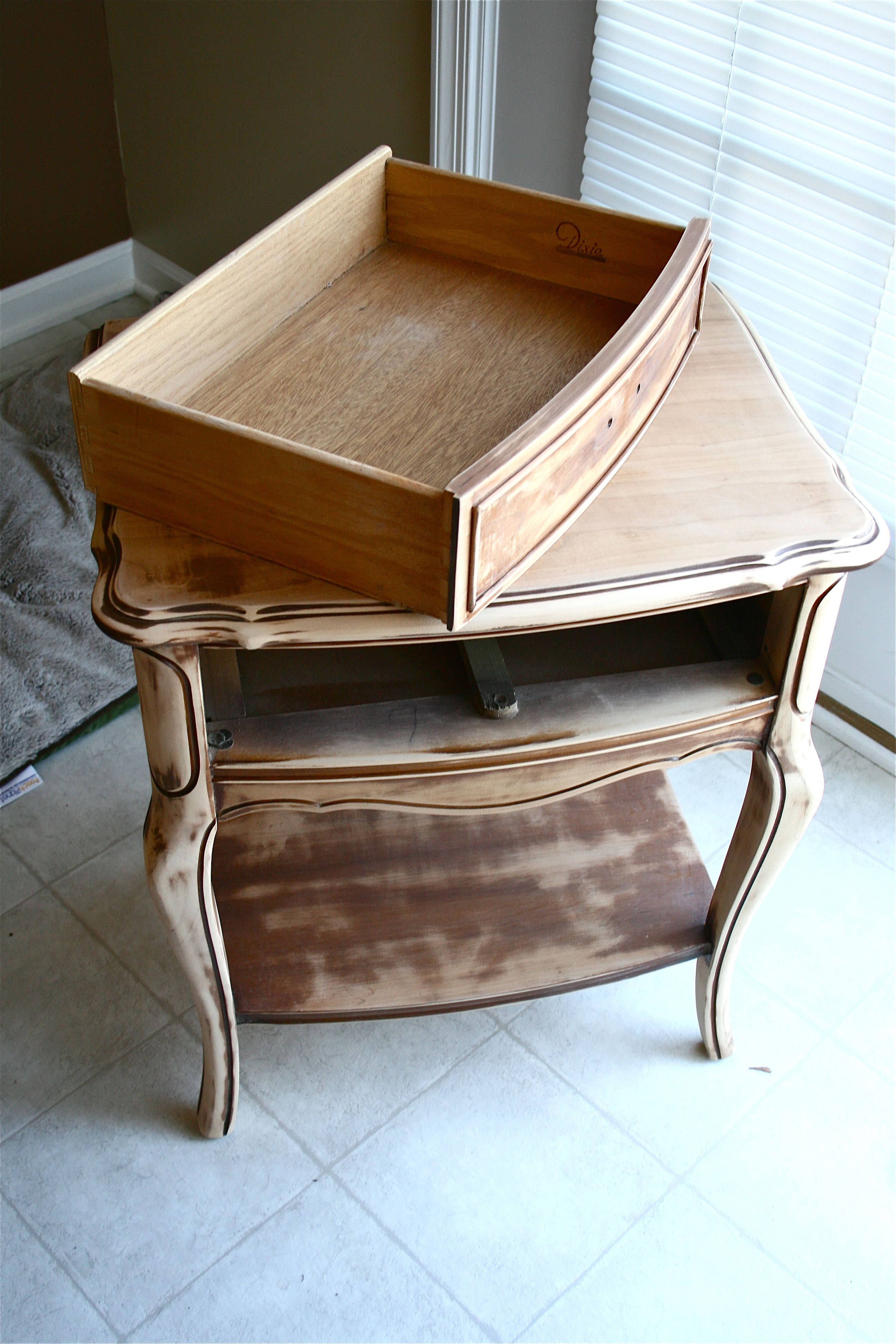 I mentioned last week that we started working on a certain thrifted side table that used to live in my old apartment (seen pointed to in the photo below). In that space, the original stained wood finish fit in with my bachelorette decor.