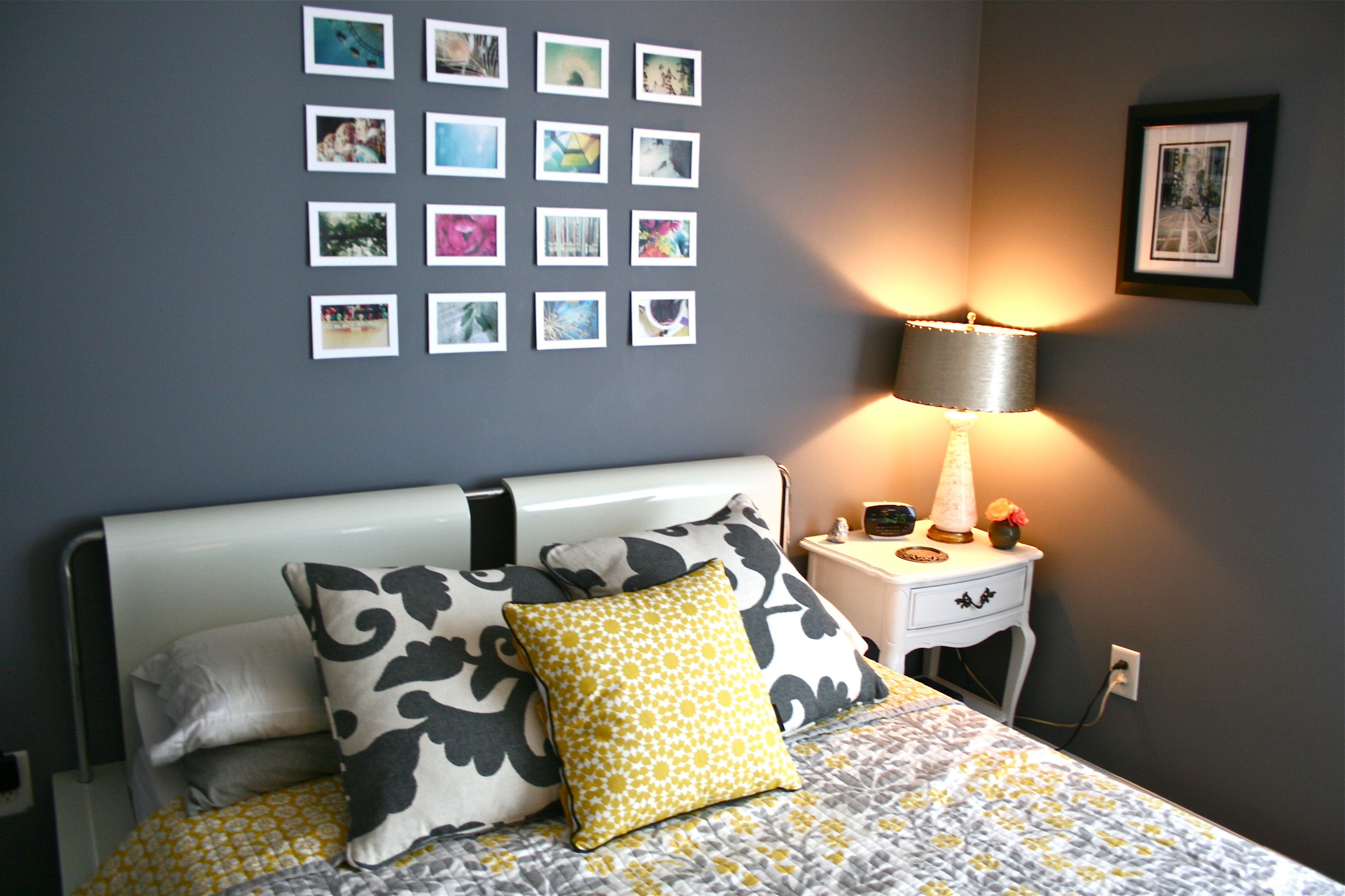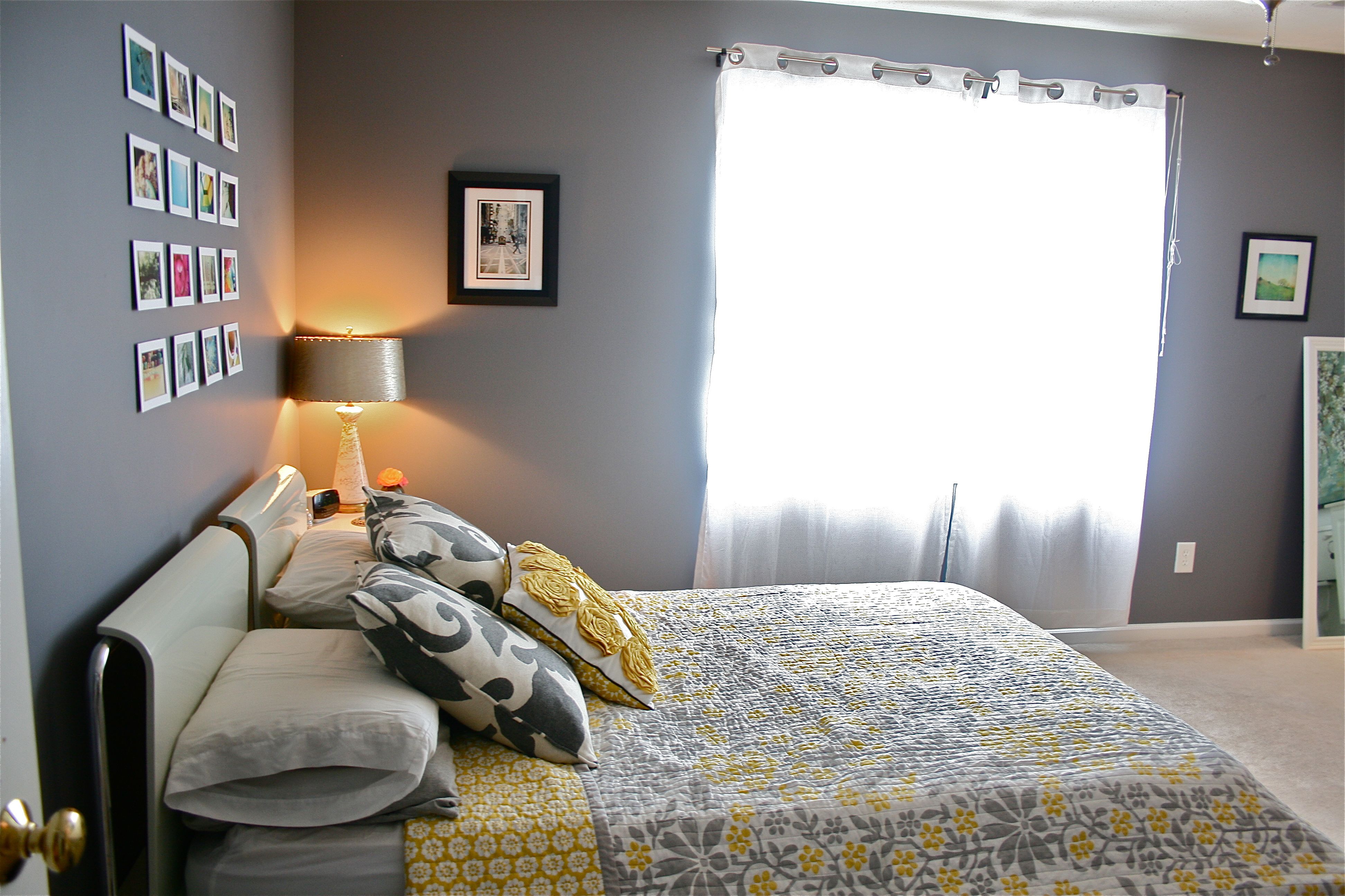 Here are a few wide shots of the room as a whole, now with the new quilt, pillows (the white and gray ones actually came off of the new couch) and restyled night stand: