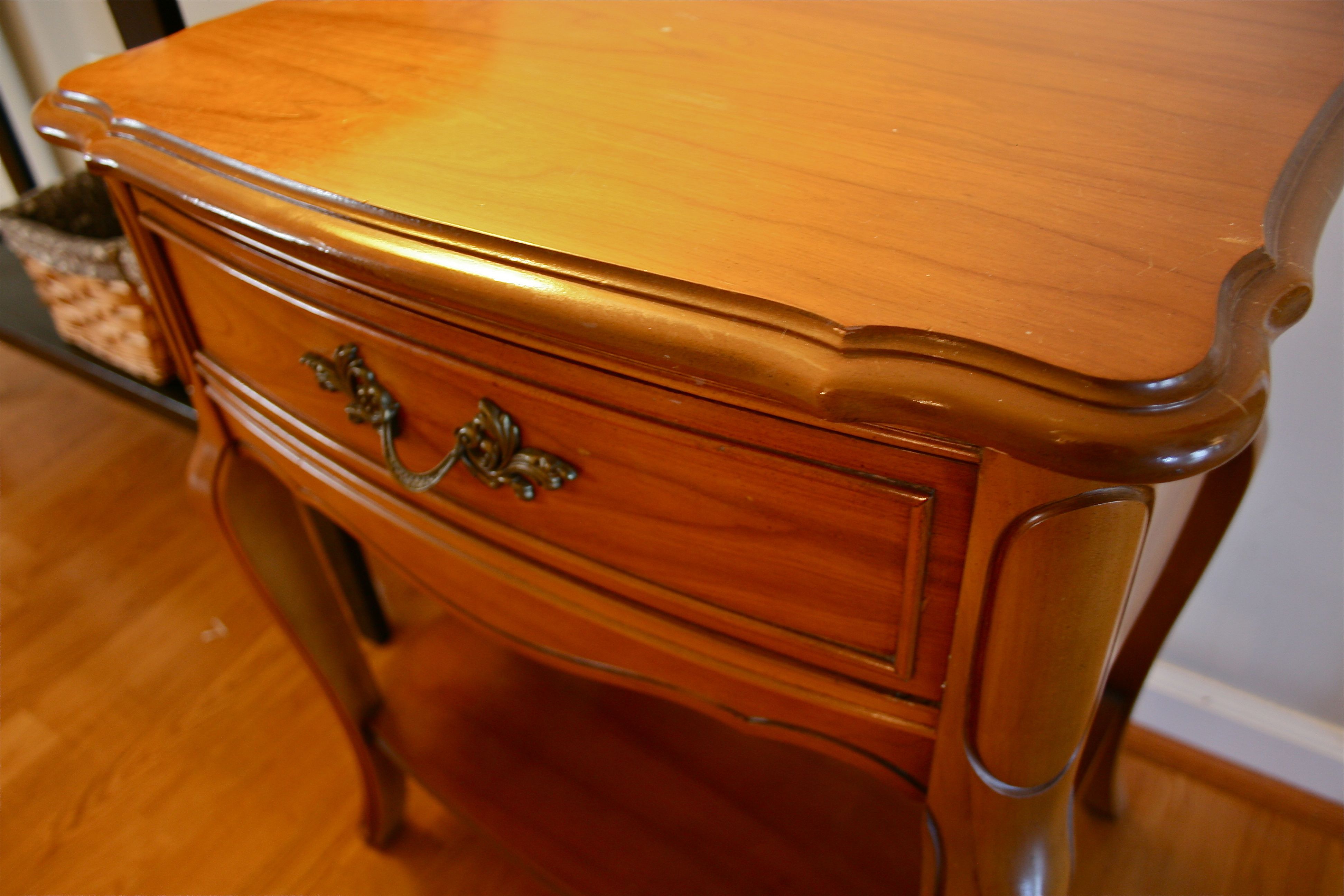 I mentioned last week that we started working on a certain thrifted side table that used to live in my old apartment (seen pointed to in the photo below). In that space, the original stained wood finish fit in with my bachelorette decor.