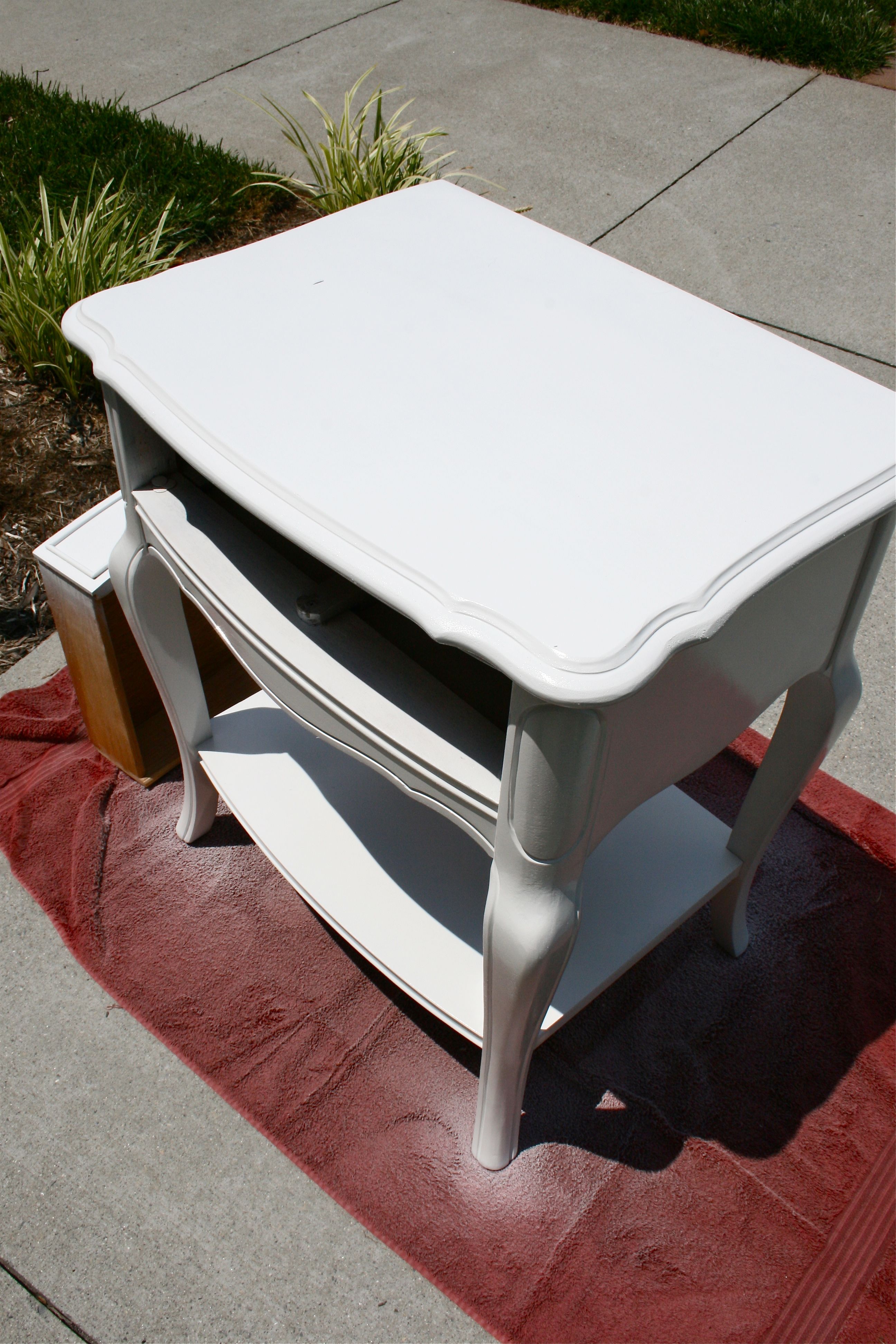 Time for a spray down 🙂 After contemplating the use of a bright color, like teal, orange or green, we decided to give it a crisp look with glossy white. I took some time to mull it over and realized that the white would REALLY bring out the details of the unique edging and beveling.