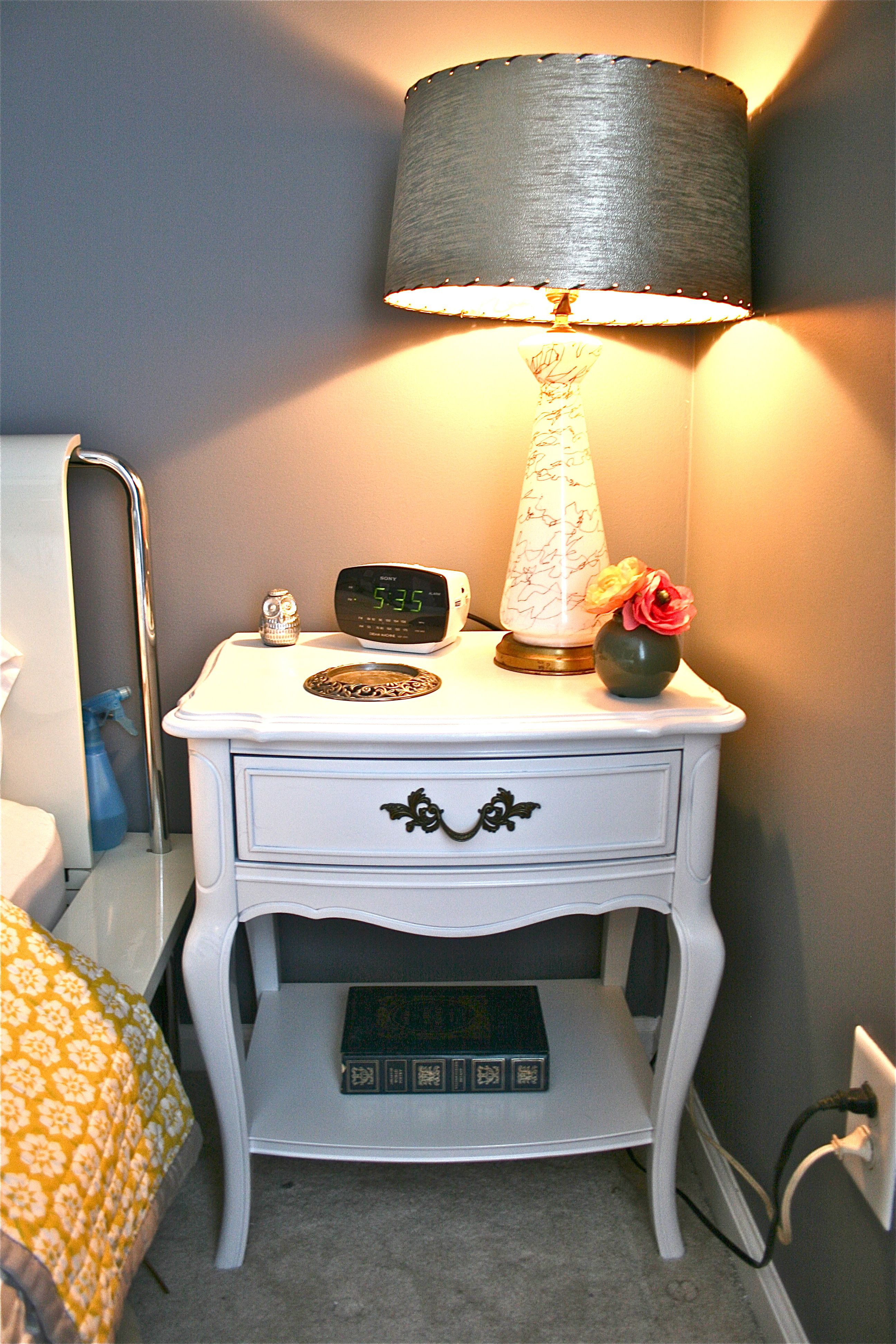 The old plastic side tables were teeny tiny and square – Thus, the bed was pretty close to the wall. I had to move the bed out quite a bit to fit the new rectangular night stand in place…So now my color photo installation above the bed is off-center ::grumble grumble:: You can see it best in the photo below.